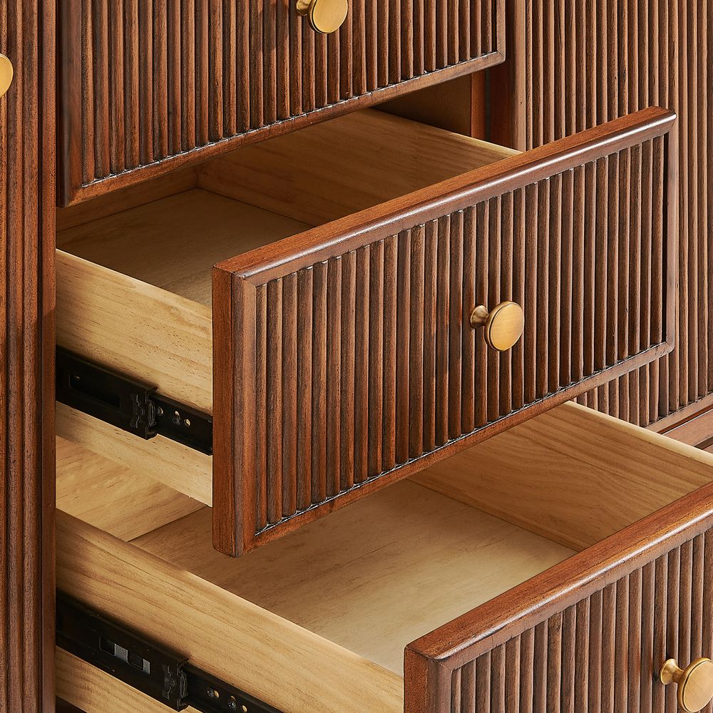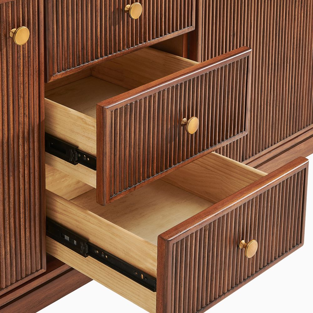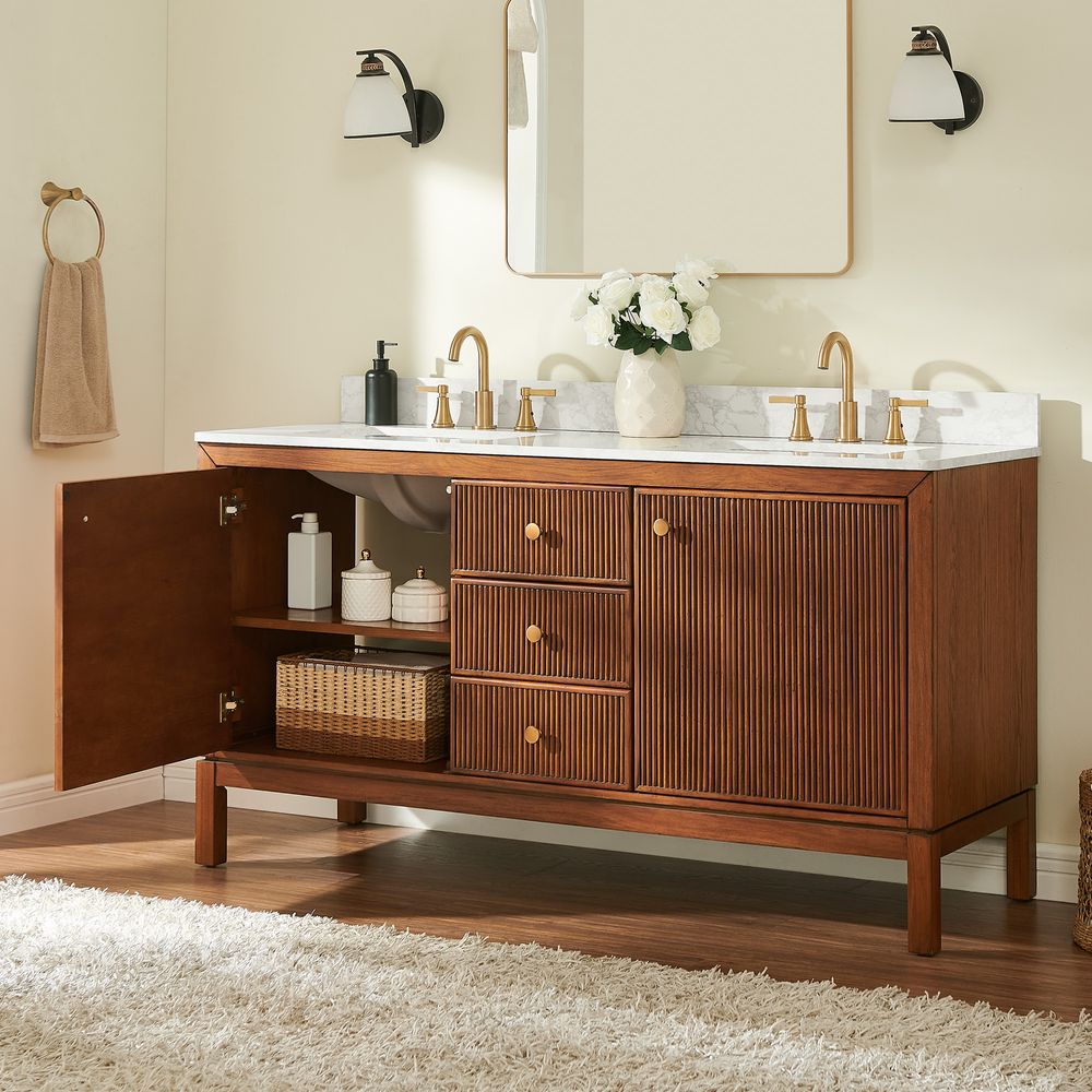 The Alva bathroom vanity exemplifies warm modernity, featuring a textured countertop and solid wood fluting that creates dynamic light and shadow. With two cabinets and three drawers, it offers practical storage while blending the natural character of wood with clean, contemporary design.