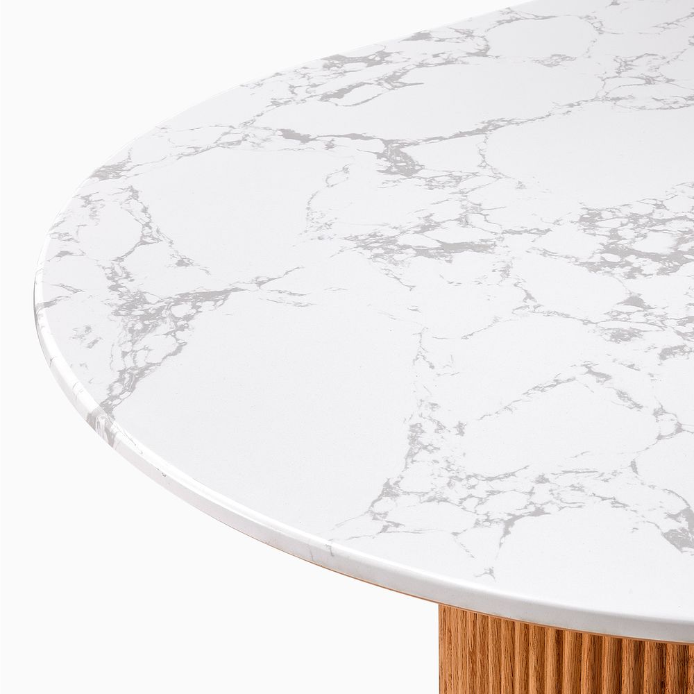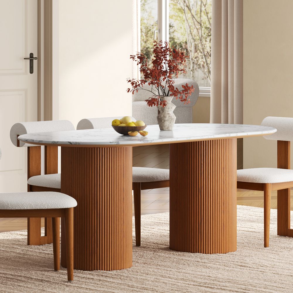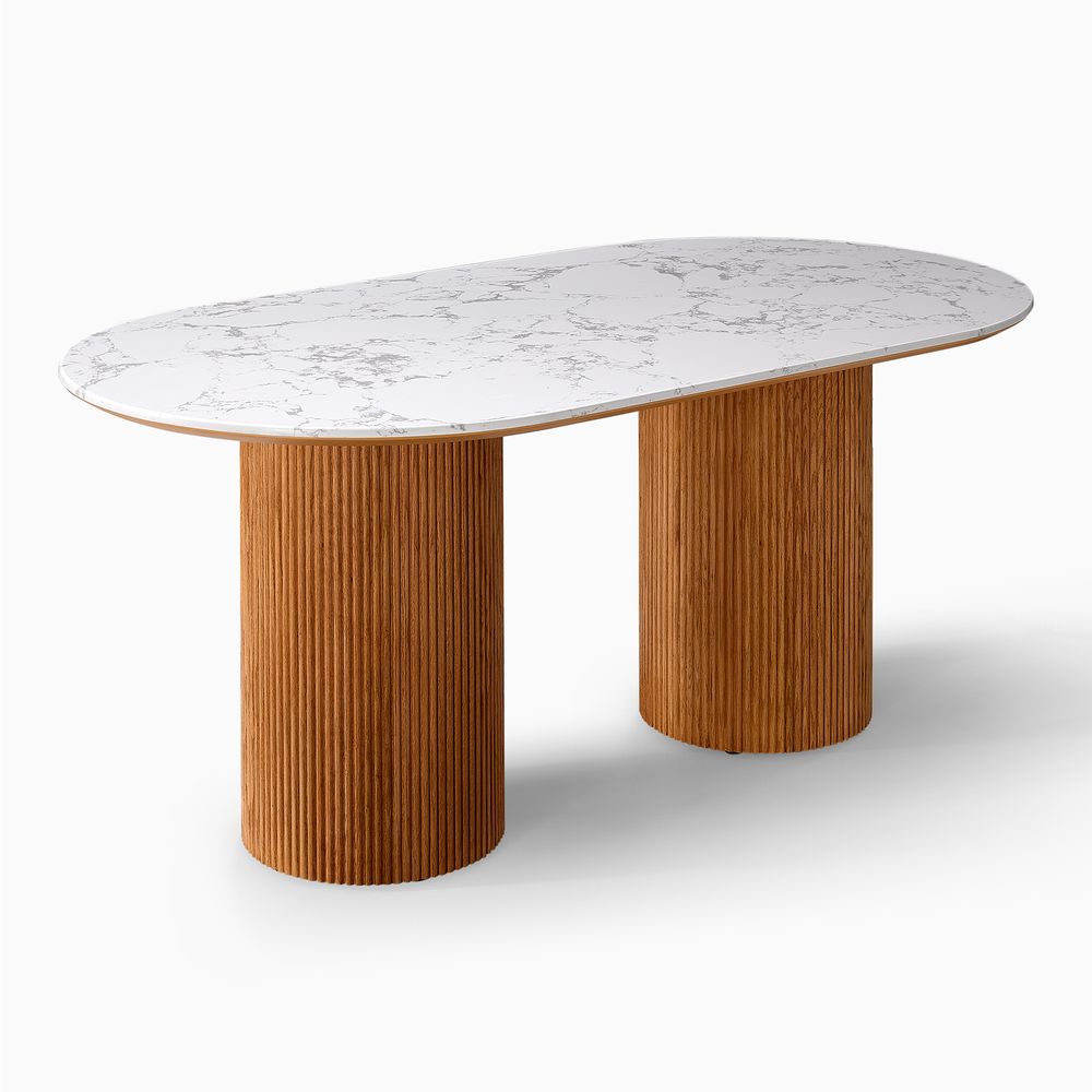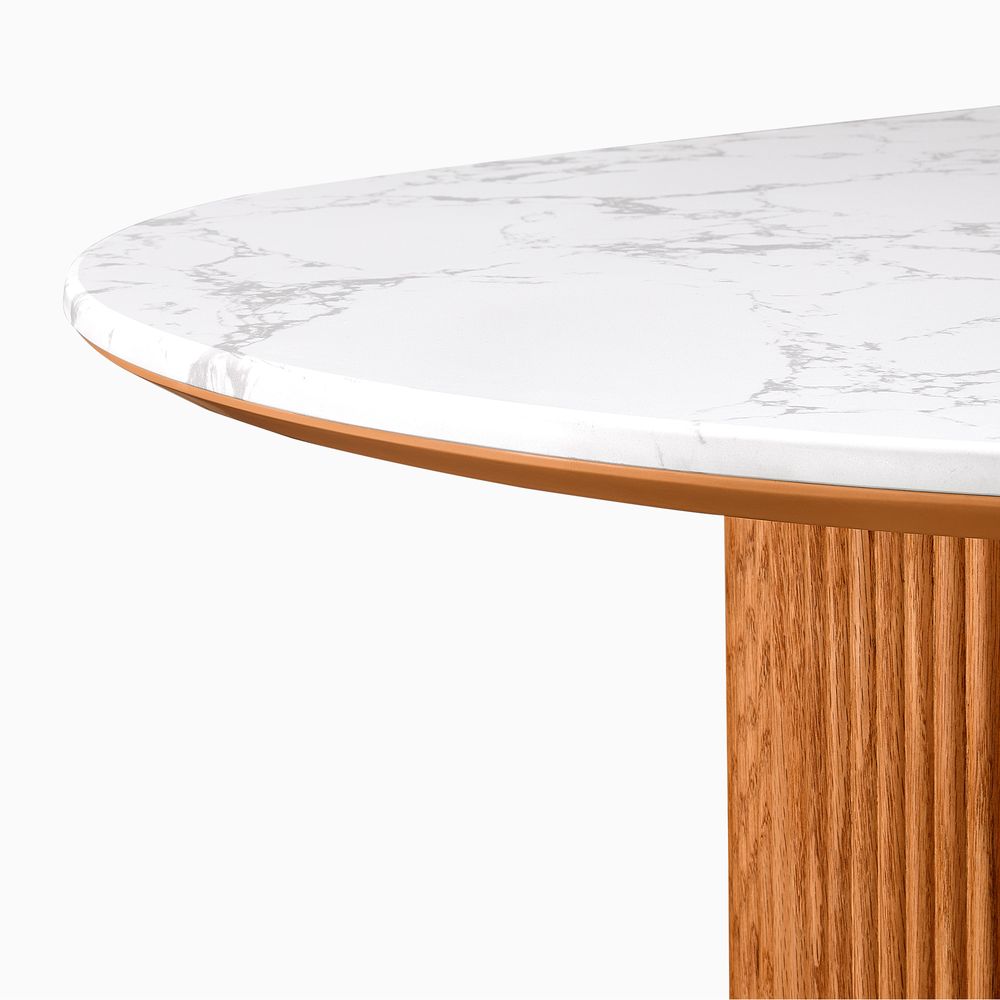 Crafted of American oak, engineered stone, plywood, and engineered wood.Tabletop is honed and sealed for a satin finish with deep veining and natural color contrasts.All wood is kiln-dried for added durability.Wood glazing adds visual interest with greater depth and layering and enhances coloring.Solid oak fluting presents a natural texture.72" table comfortably seats 4-6.Color perception may vary due to wood characteristics, lighting, and devices. Wood grain variation is expected, as each is unique.Variation in the veining of stone is to be expected, as each piece will be unique.