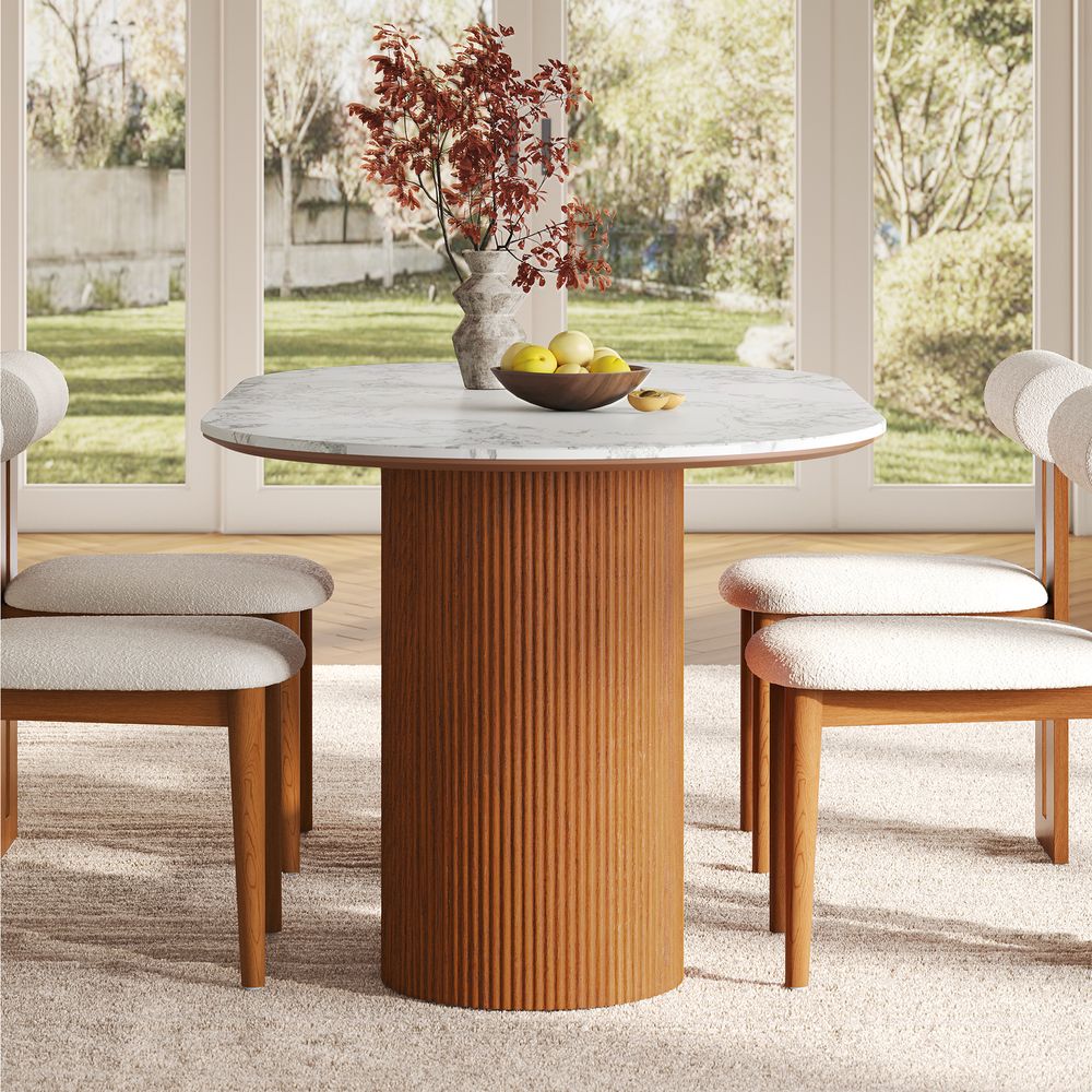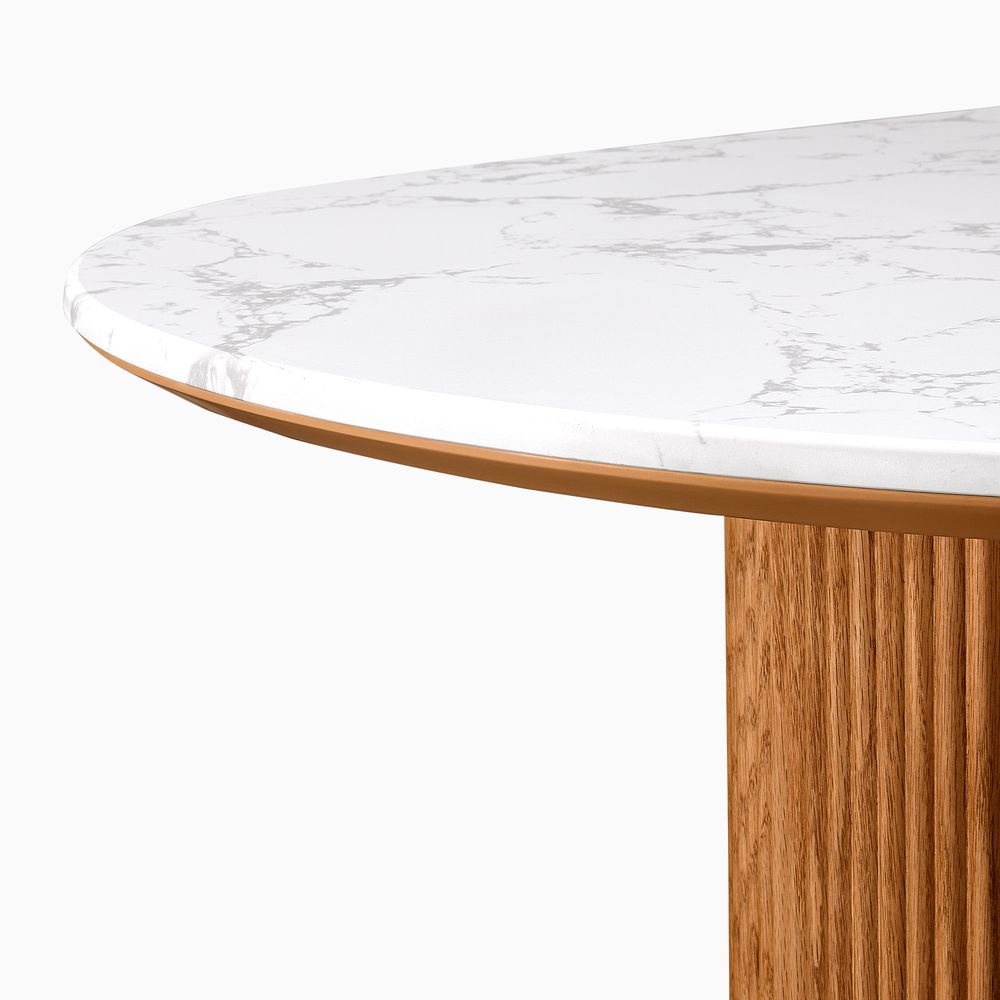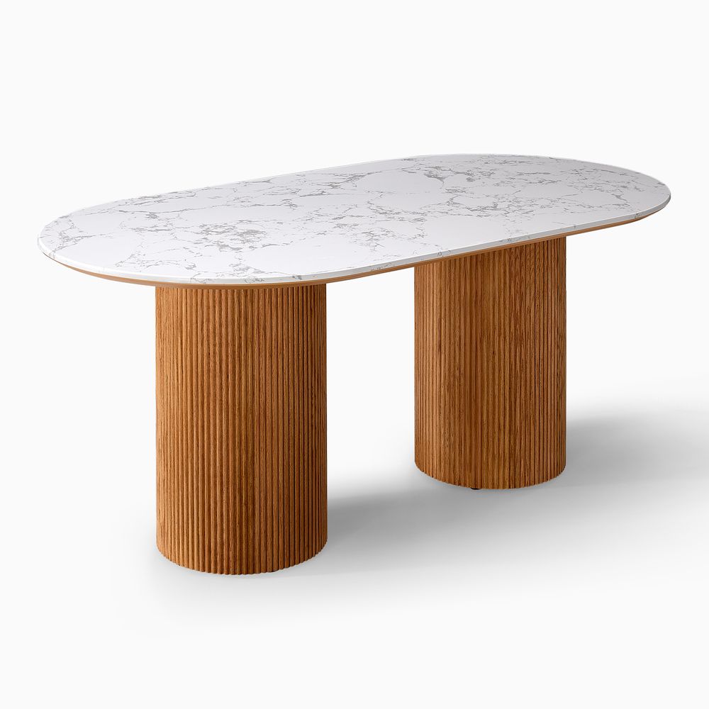 Crafted of American oak, engineered stone, plywood, and engineered wood.Tabletop is honed and sealed for a satin finish with deep veining and natural color contrasts.All wood is kiln-dried for added durability.Finish is achieved through multistep process in which wood is wire brushed to highlight its rich grain.Wood glazing adds visual interest with greater depth and layering and enhances coloring.Solid oak fluting presents a natural texture.72" table comfortably seats 4-6.Color perception may vary due to wood characteristics, lighting, and devices. Wood grain variation is expected, as each is unique.Variation in the veining of stone is to be expected, as each piece will be unique.