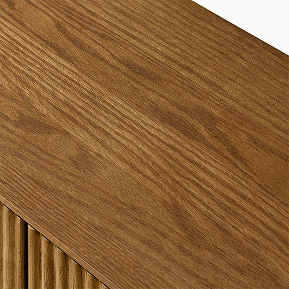Crafted of solid wood and plywood with American oak wood veneers.All wood is kiln-dried for added durability.Solid wood blocks are used at structural joints for reinforcement.Solid wood fluting presents a natural texture.Wall-mounted console lends an airy look to your space.Color perception may vary due to wood characteristics, lighting, and devices. Wood grain variation is expected, as each is unique.