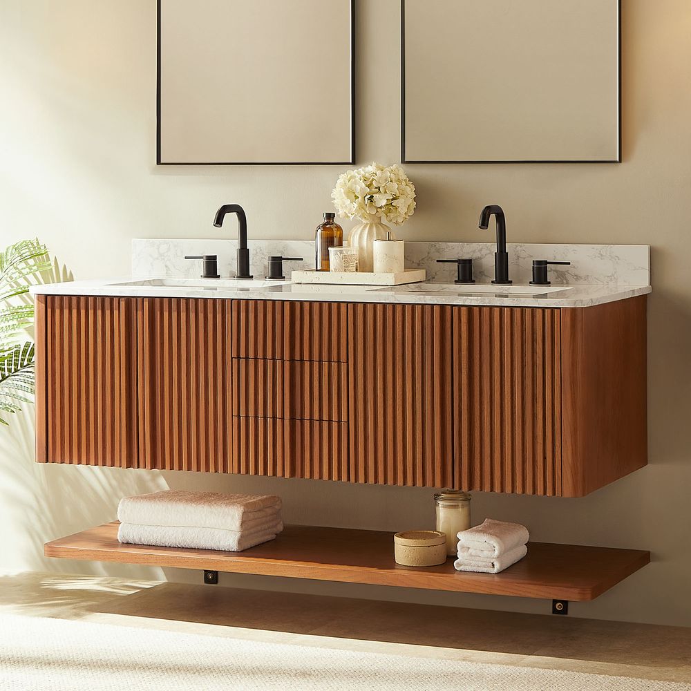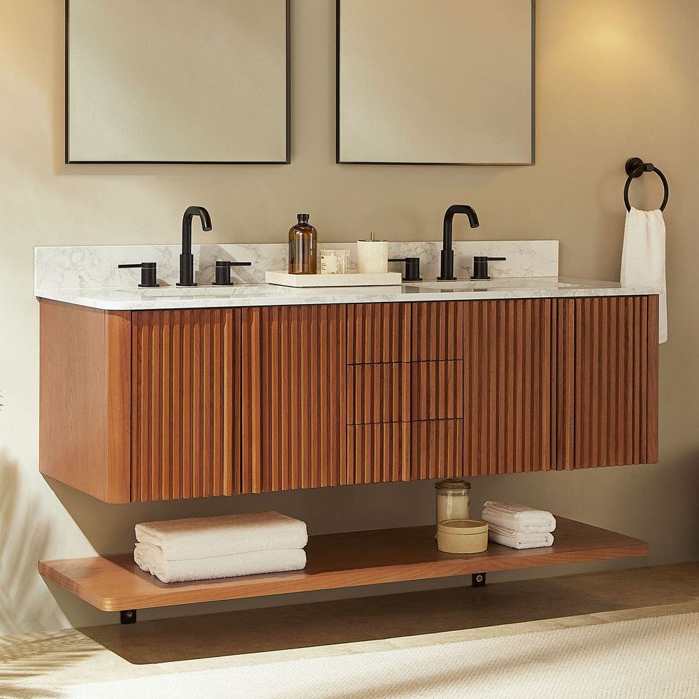 Crafted of engineered stone, American solid oak, and plywood with oak veneers.Countertop and backsplash are honed and sealed for a satin finish with deep veining and natural color contrasts.All wood is kiln-dried for added durability.Drawers are crafted with precision dovetail joints for superior sturdiness and weight-bearing strength.Solid wood blocks are used at structural joints for reinforcement.Solid oak fluting presents a natural texture.Wall-mounted bathroom vanity lends an airy look to your space.Color perception may vary due to wood characteristics, lighting, and devices. Wood grain variation is expected, as each is unique.Variation in the veining of stone is to be expected, as each piece will be unique.