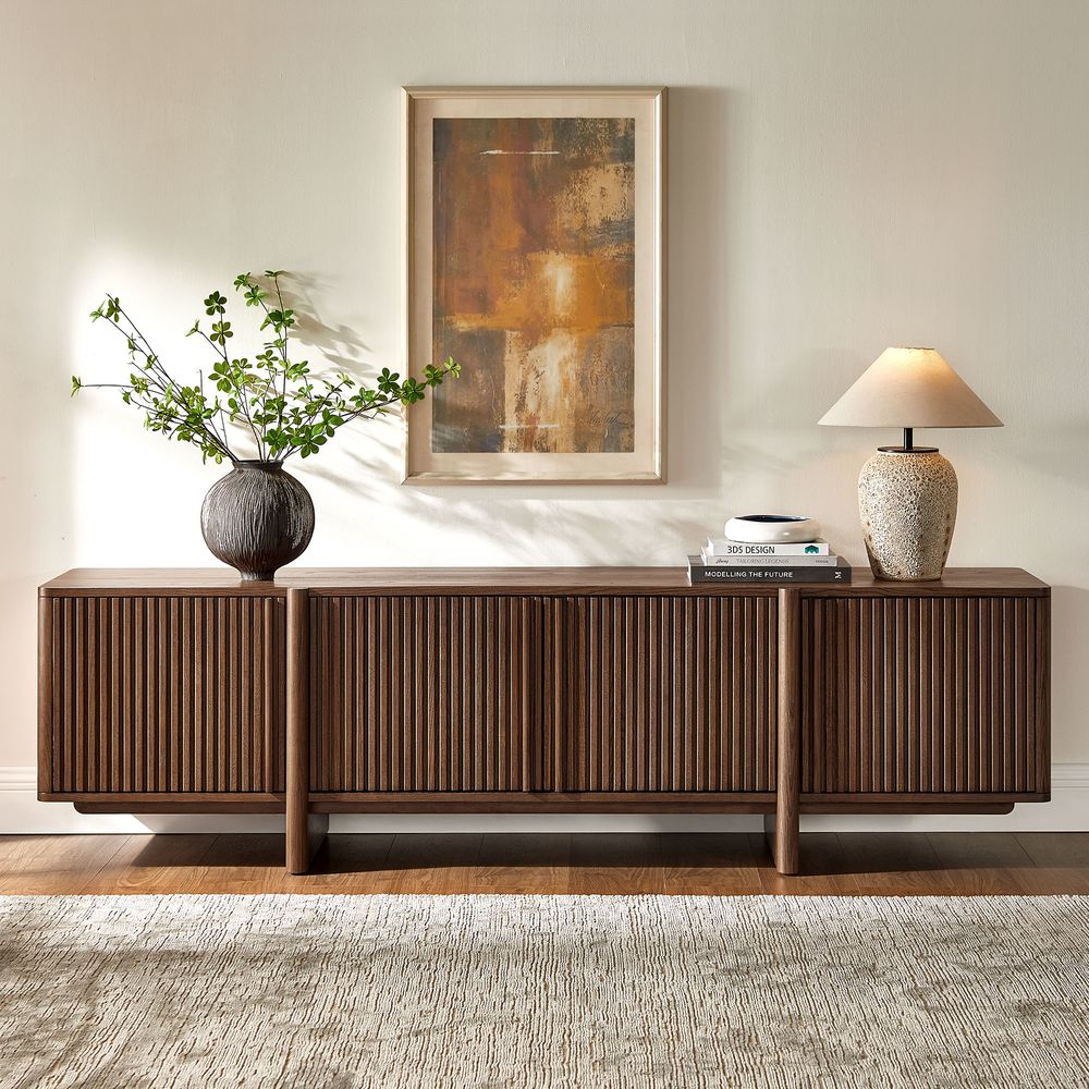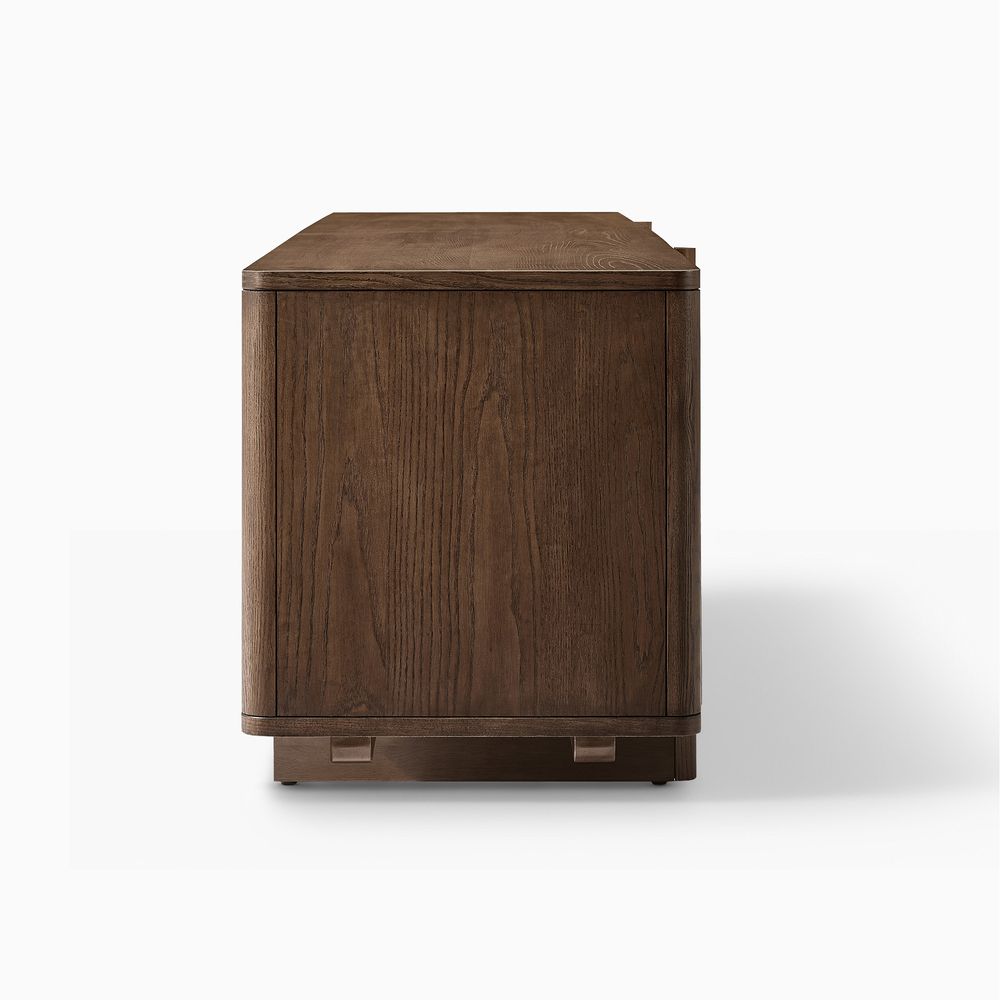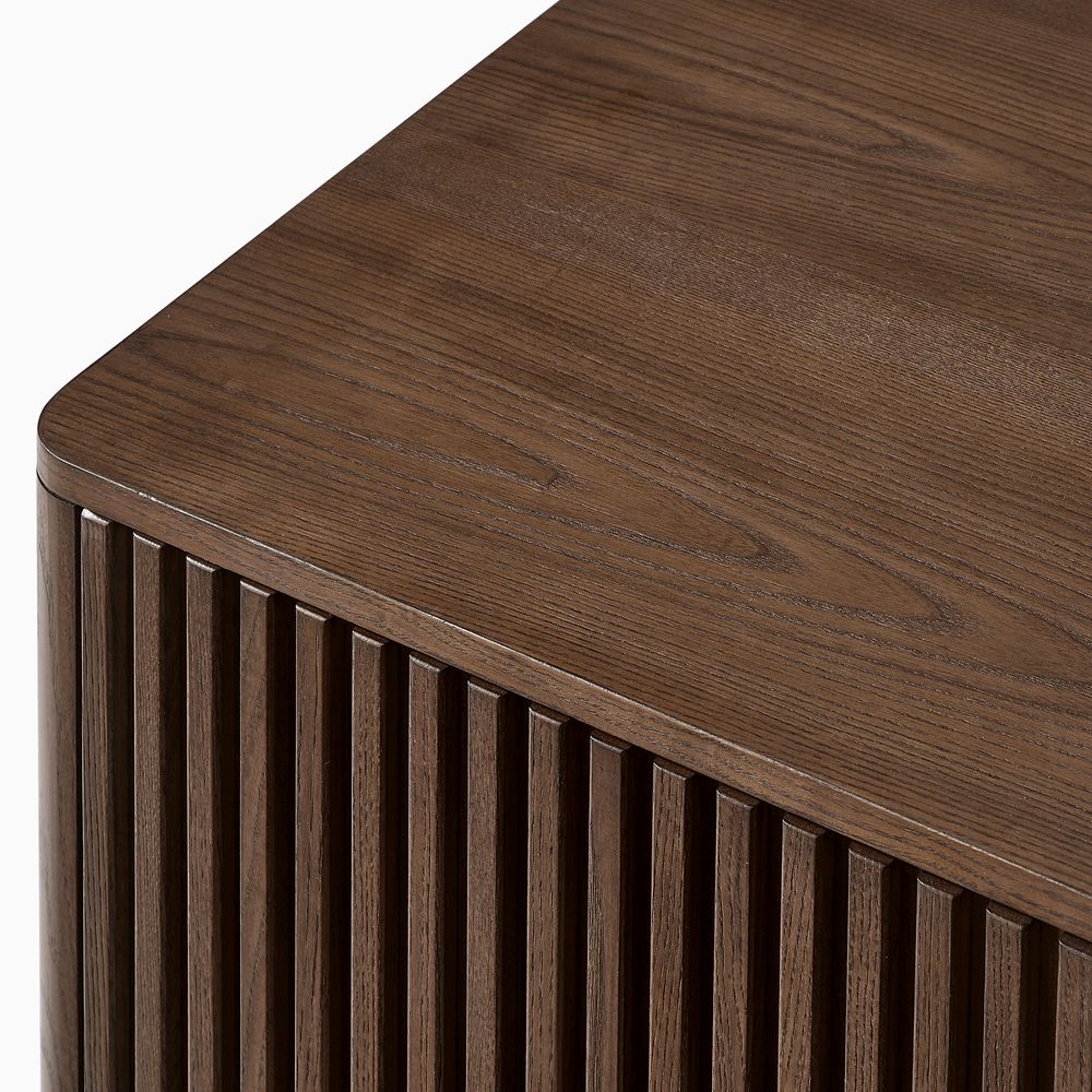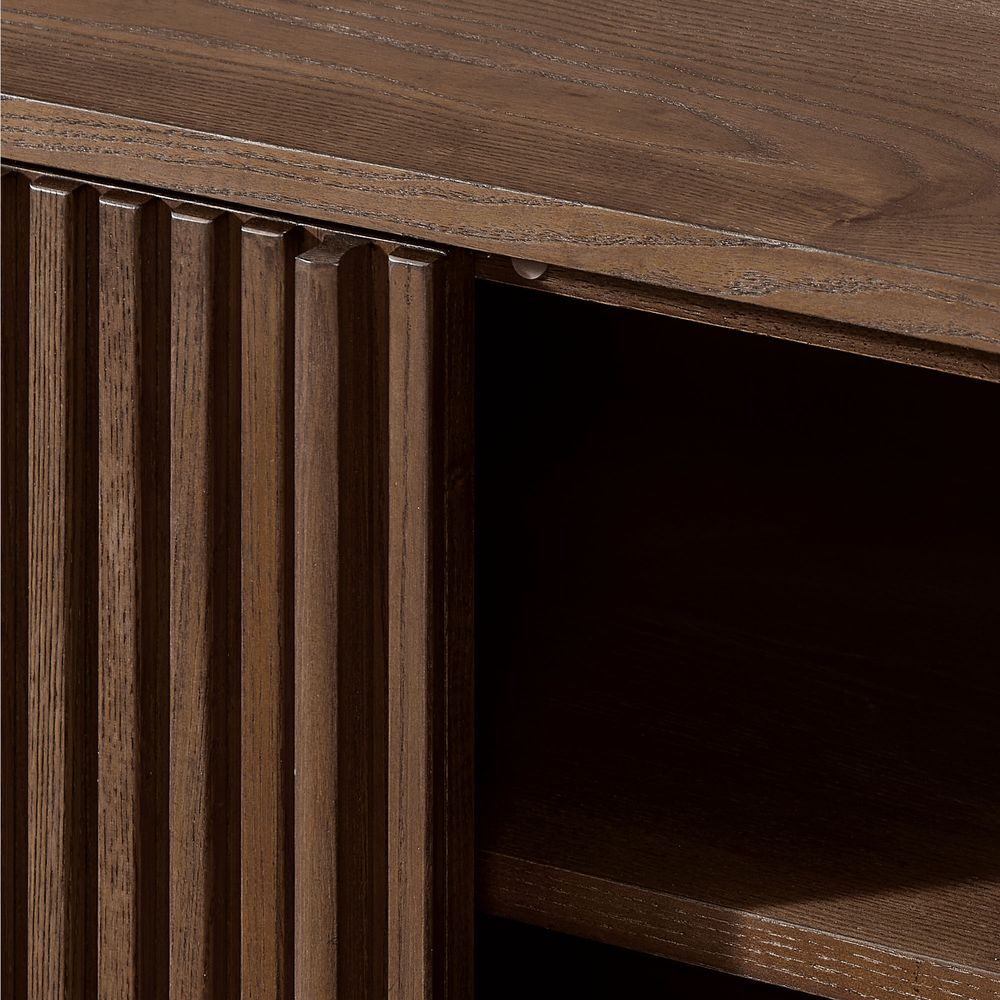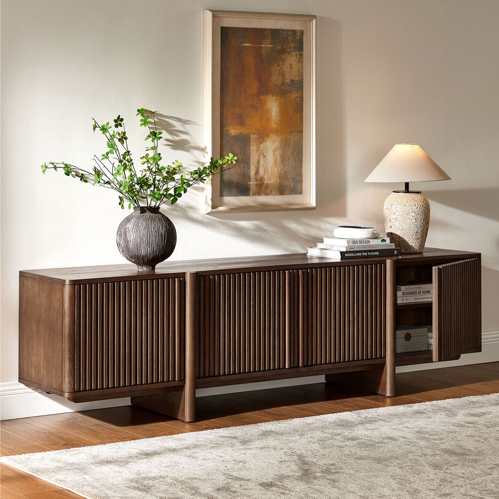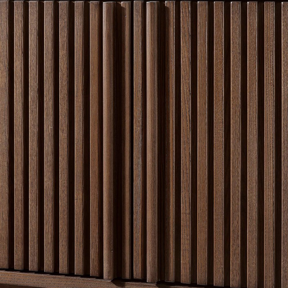 Crafted of American solid ash wood and engineered wood with ash wood veneers.All wood is kiln-dried for added durability.Finish is achieved through multistep process in which wood is wire brushed to highlight its rich grain.Wood glazing adds visual interest with greater depth and layering and enhances coloring.Solid wood blocks are used at structural joints for reinforcement.Solid ash wood fluting presents a natural texture.Designed for TVs up to 85", 1 cord cutout in back panel for cable management.Color perception may vary due to wood characteristics, lighting, and devices. Wood grain variation is expected, as each is unique.