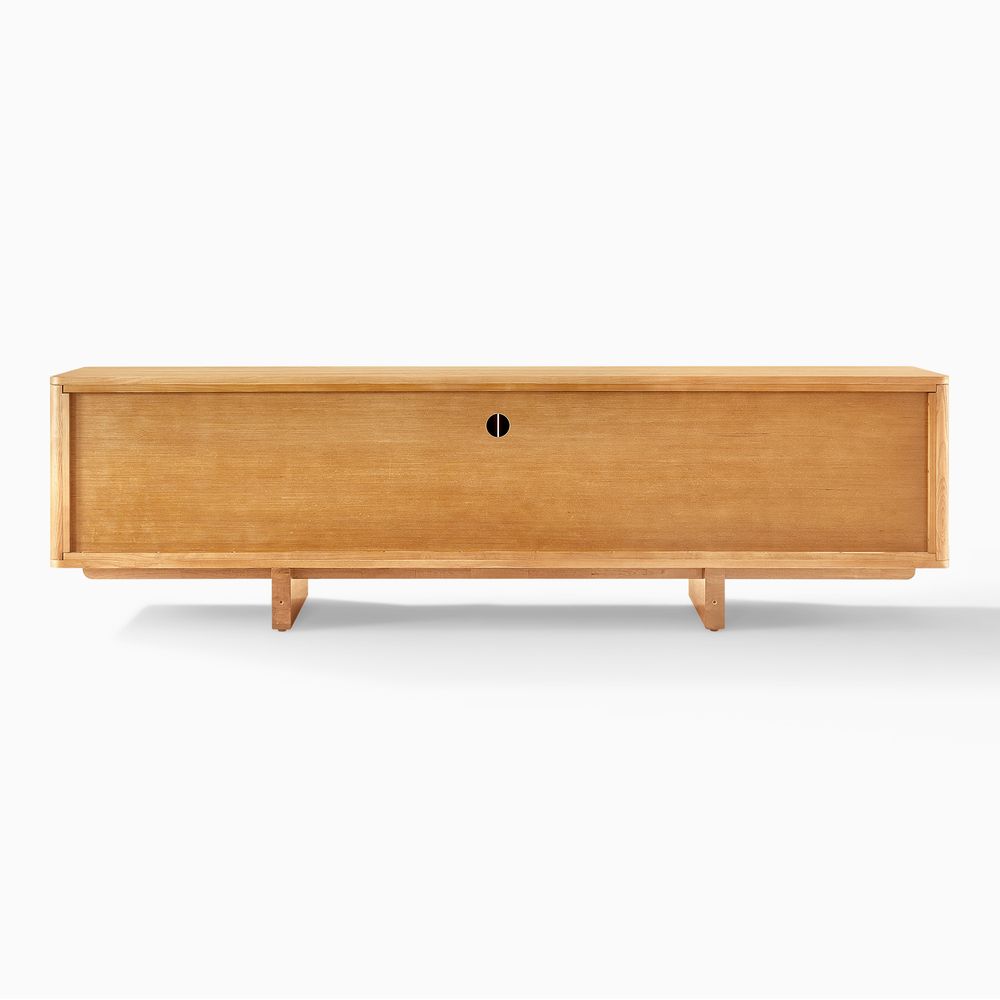 Crafted of American solid ash wood and engineered wood with ash wood veneers.All wood is kiln-dried for added durability.Finish is achieved through multistep process in which wood is wire brushed to highlight its rich grain.Solid wood blocks are used at structural joints for reinforcement.Solid ash wood fluting presents a natural texture.Designed for TVs up to 85", 1 cord cutout in back panel for cable management.Color perception may vary due to wood characteristics, lighting, and devices. Wood grain variation is expected, as each is unique.
