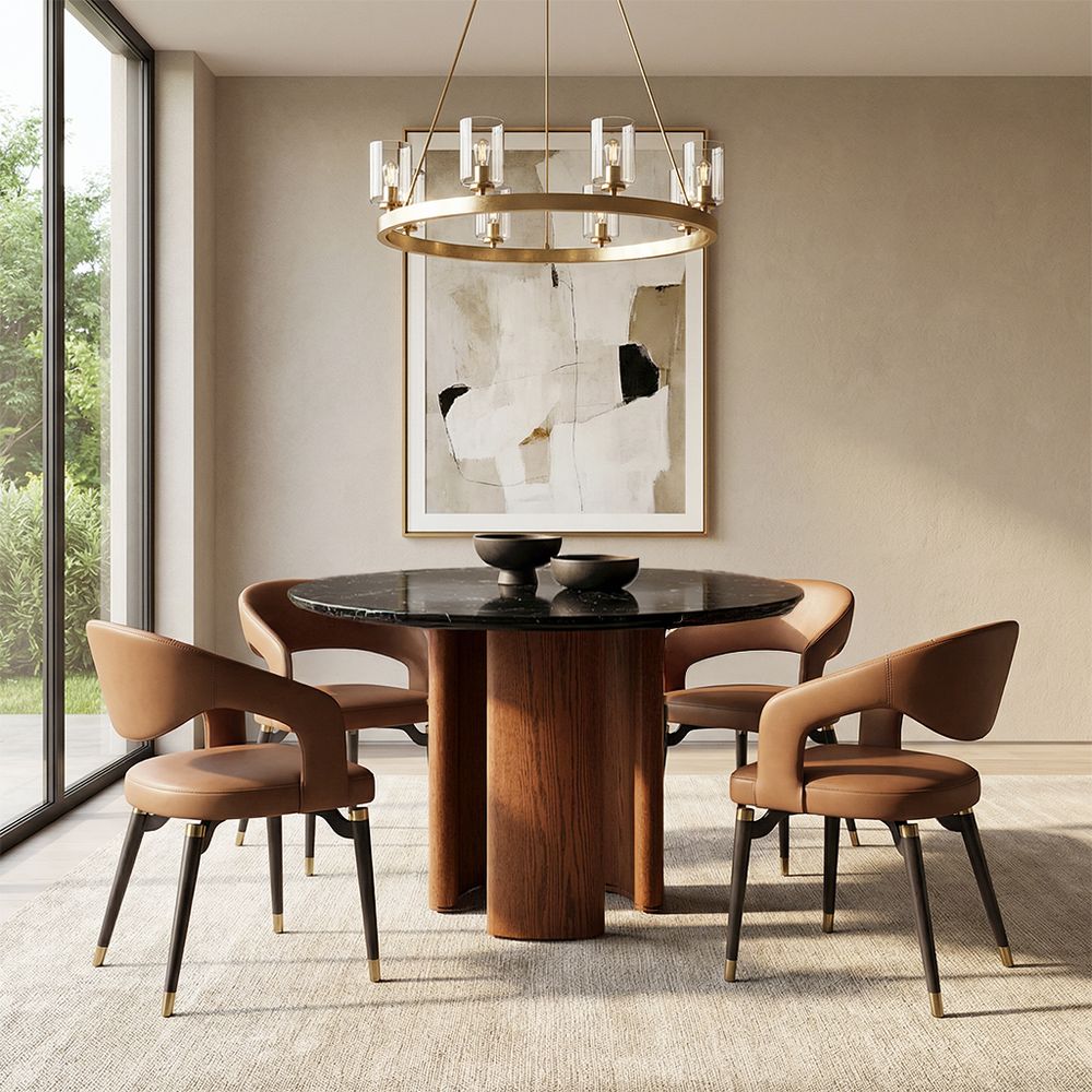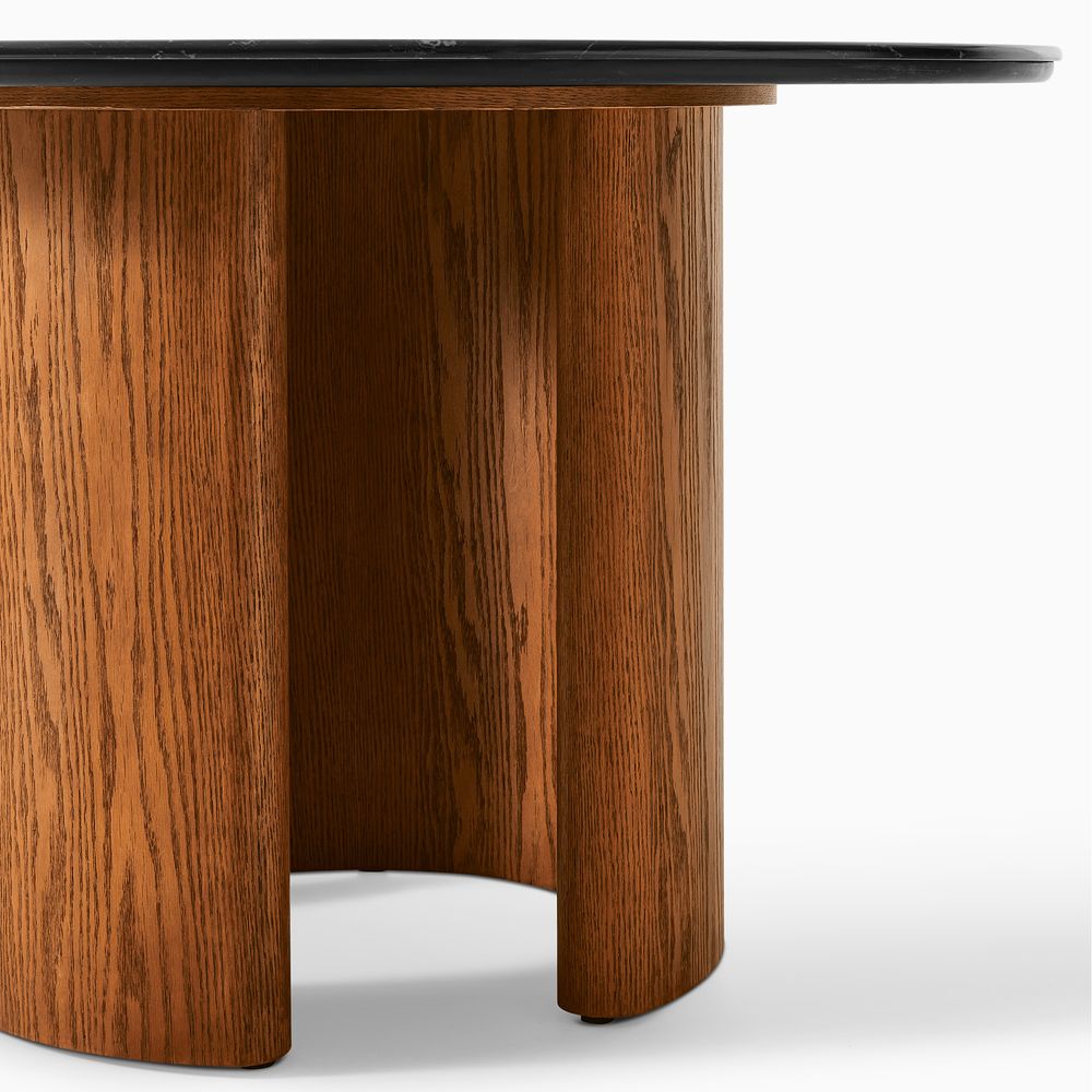Finished in an elegant warm oak brown paired with a calm engineered stone, the palette creates a sense of refined luxury. Silas is distinguished by its sculptural base design, featuring a half barrel–shaped primary leg paired with additional concentric arc–shaped barrel legs in varying widths and angles. This thoughtful composition introduces openness and subtle drama to the form, giving the piece a strong sense of structure without feeling rigid.