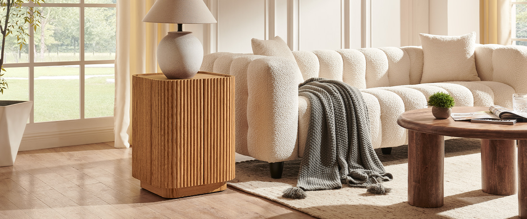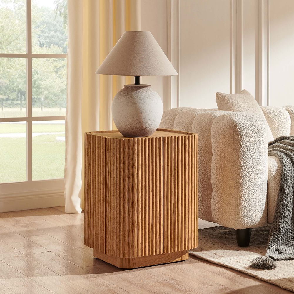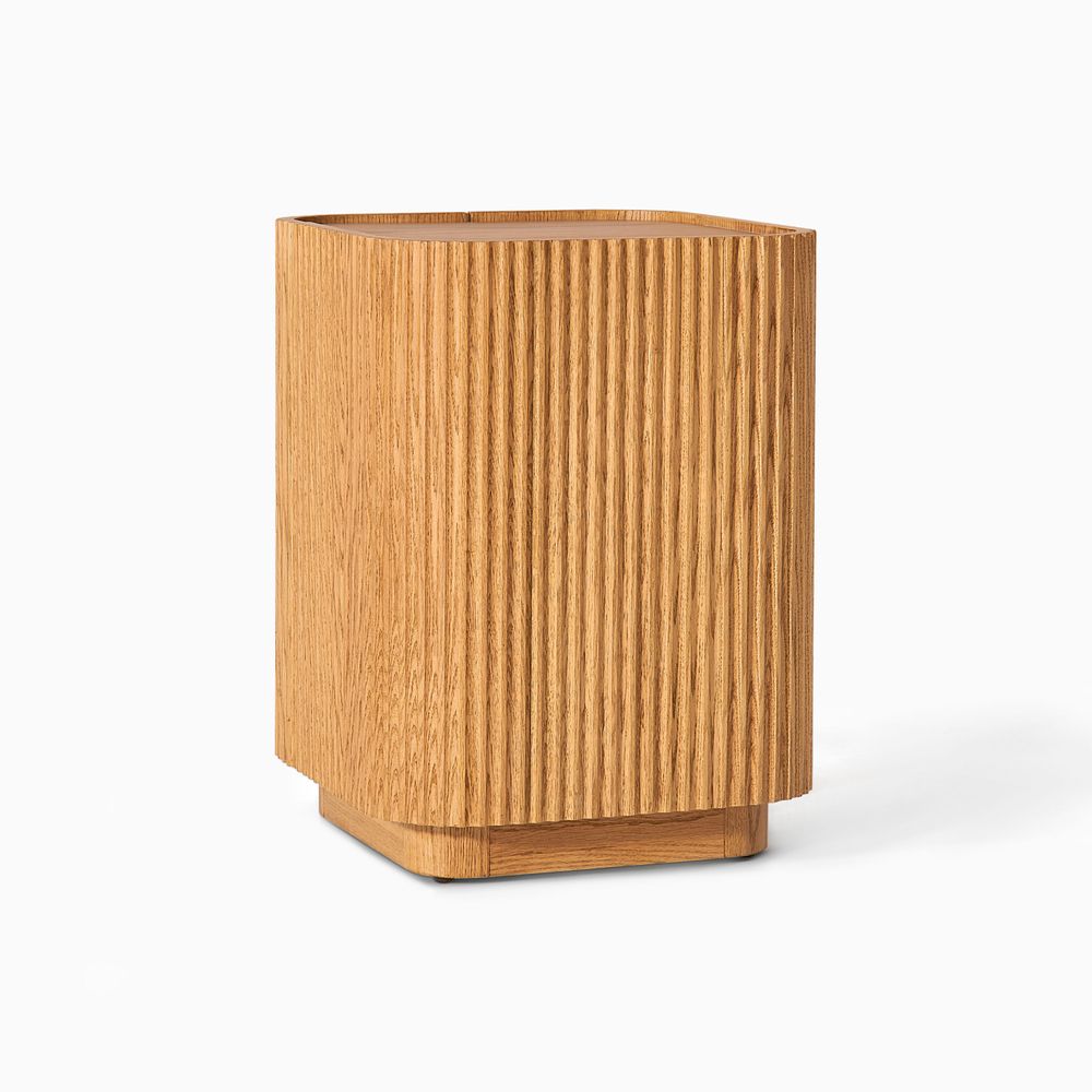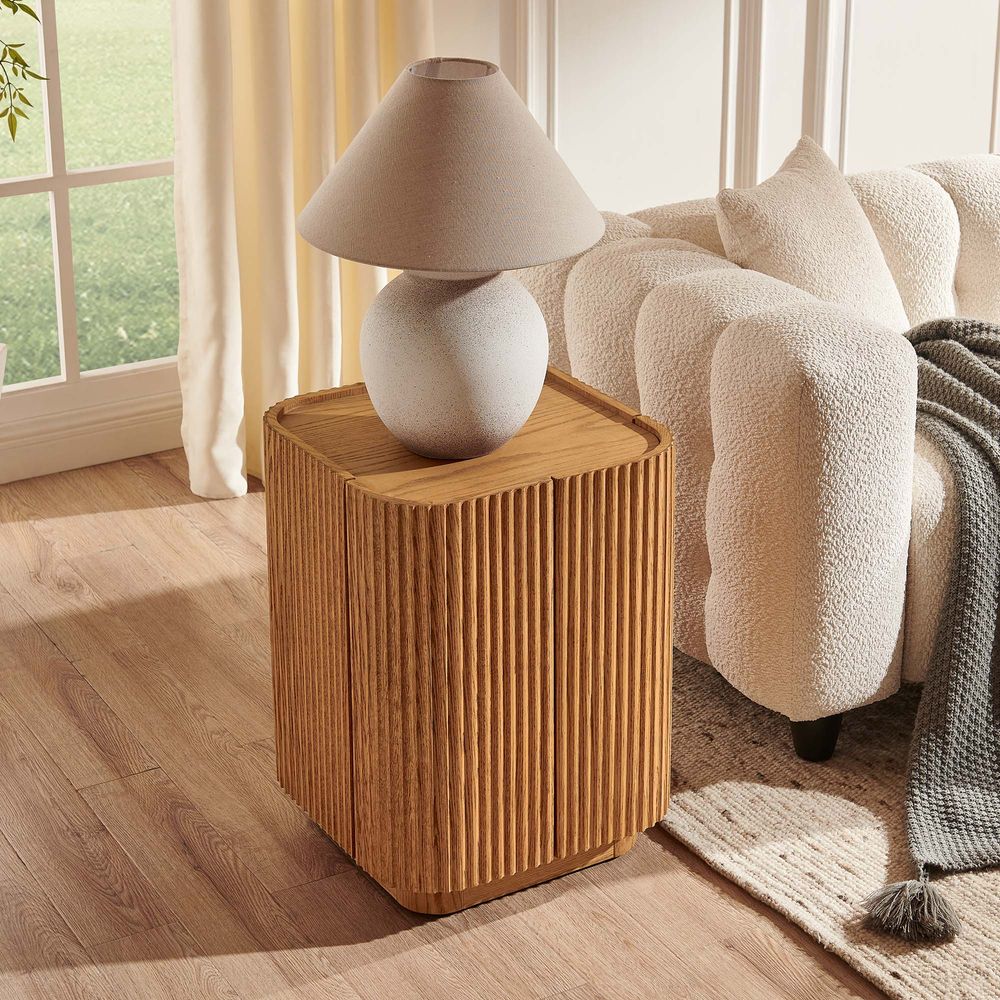 Crafted of American solid oak and engineered wood with oak veneers.All wood is kiln-dried for added durability.Finish is achieved through multistep process in which wood is wire brushed to highlight its rich grain.Solid wood fluting presents a natural texture.Solid oak wood fluting presents a natural texture.Color perception may vary due to wood characteristics, lighting, and devices. Wood grain variation is expected, as each is unique.
