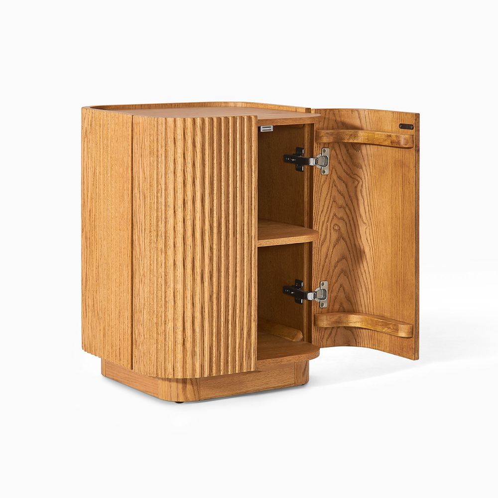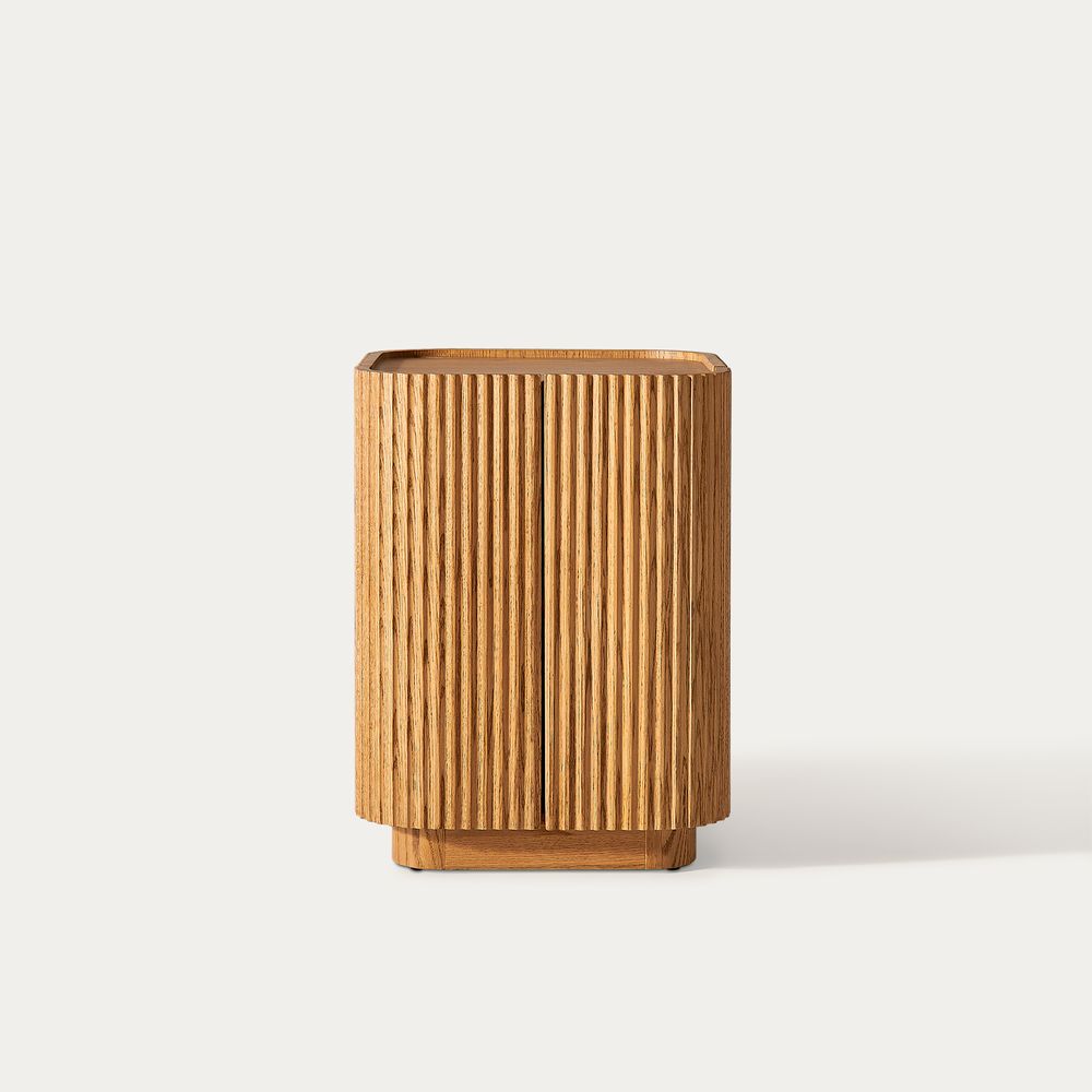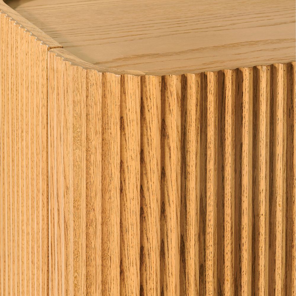 Featuring the flutings crafted into a wave-inspired design, this creation of the Skimra collection merges form with function. The warm wood finish and rhythmic detailing evoke a sense of movement, providing a unique storage option that adds a touch of artistry to any space.