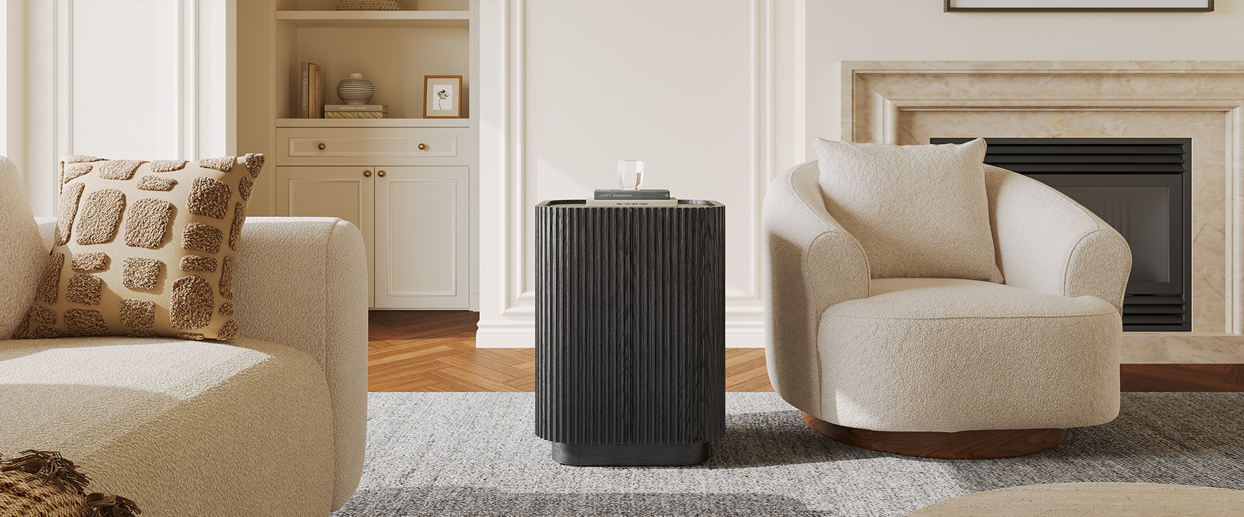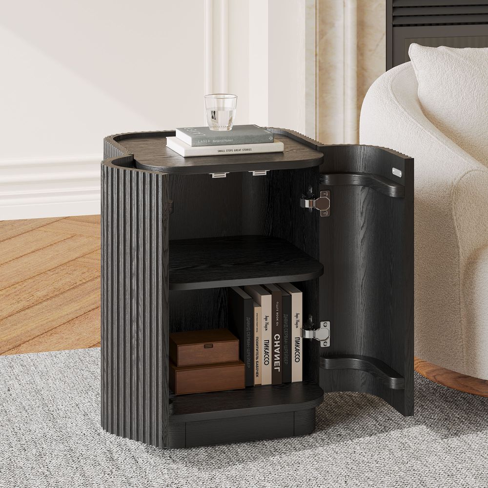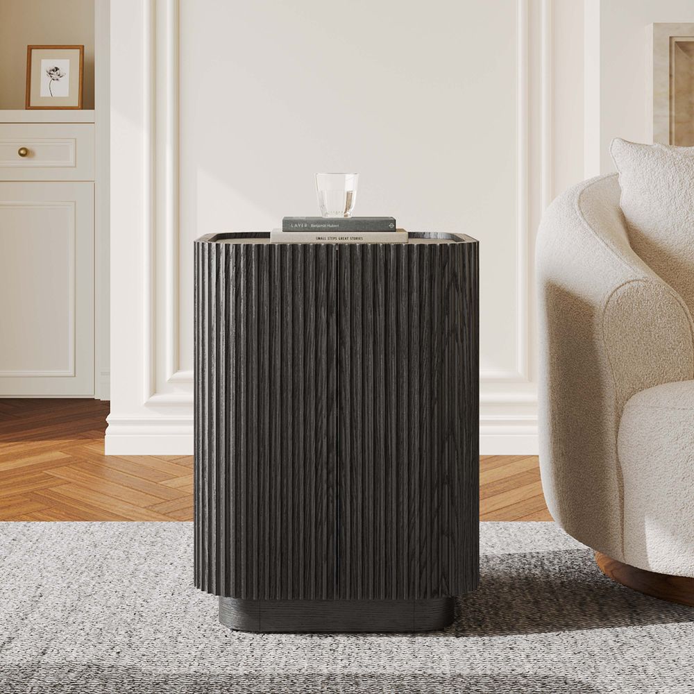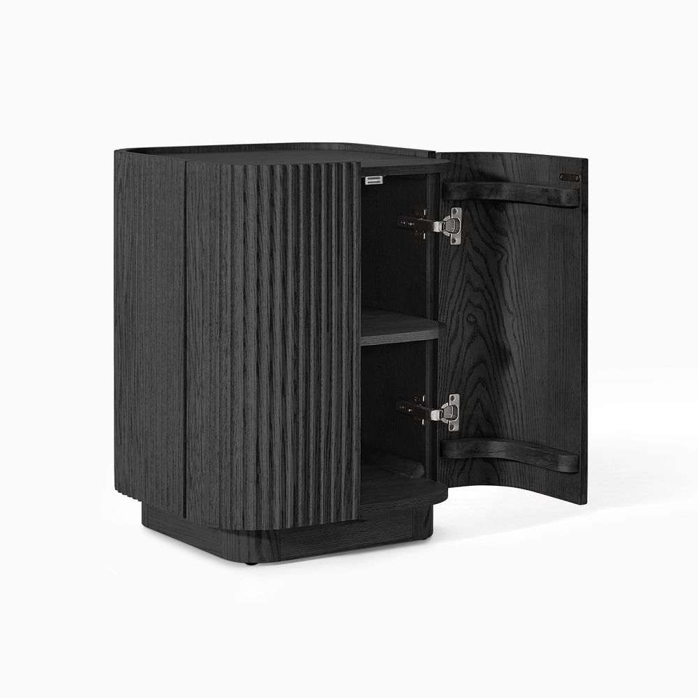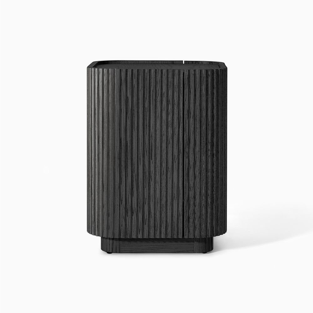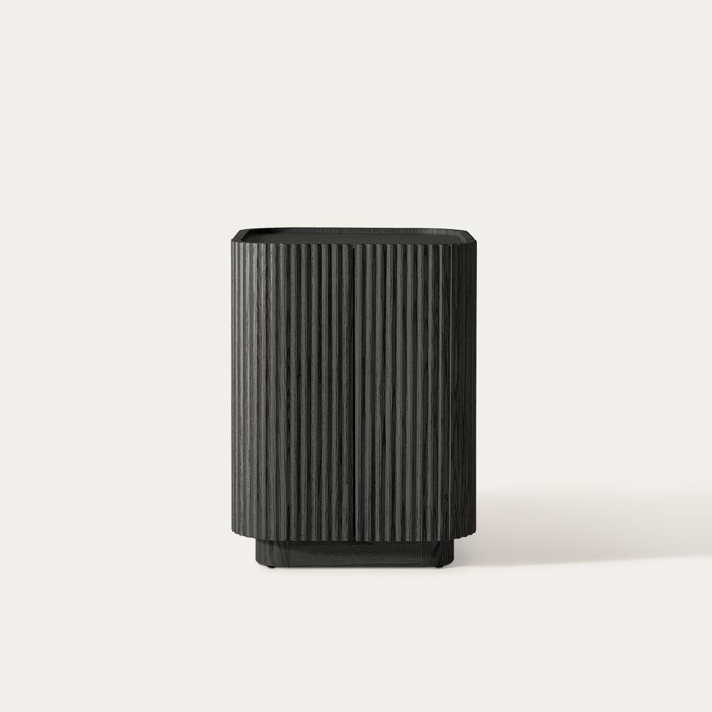 Featuring the flutings crafted into a wave-inspired design, this creation of the Skimra collection merges form with function. The warm wood finish and rhythmic detailing evoke a sense of movement, providing a unique storage option that adds a touch of artistry to any space.