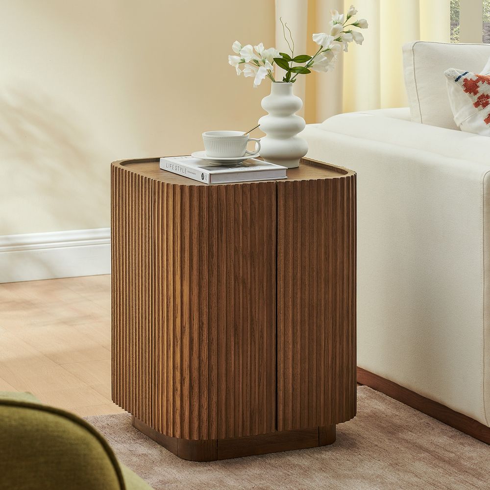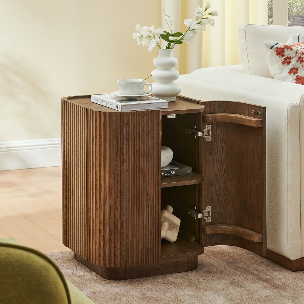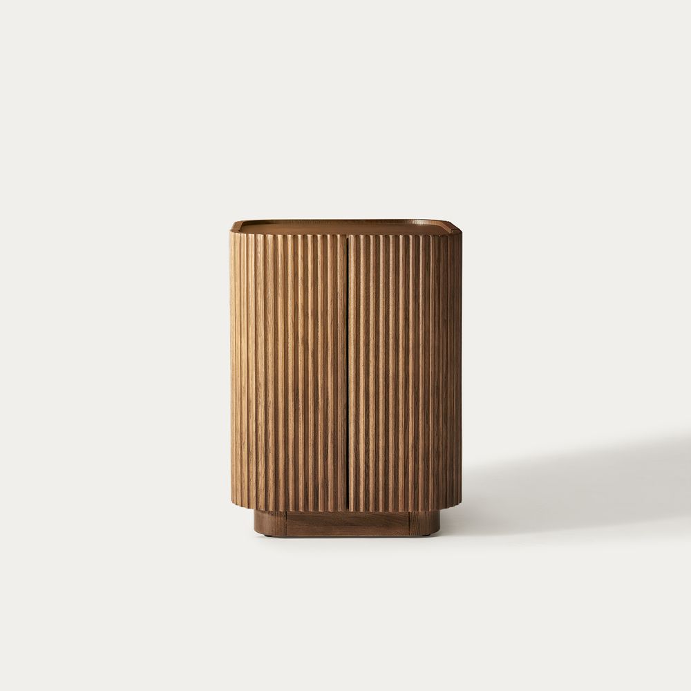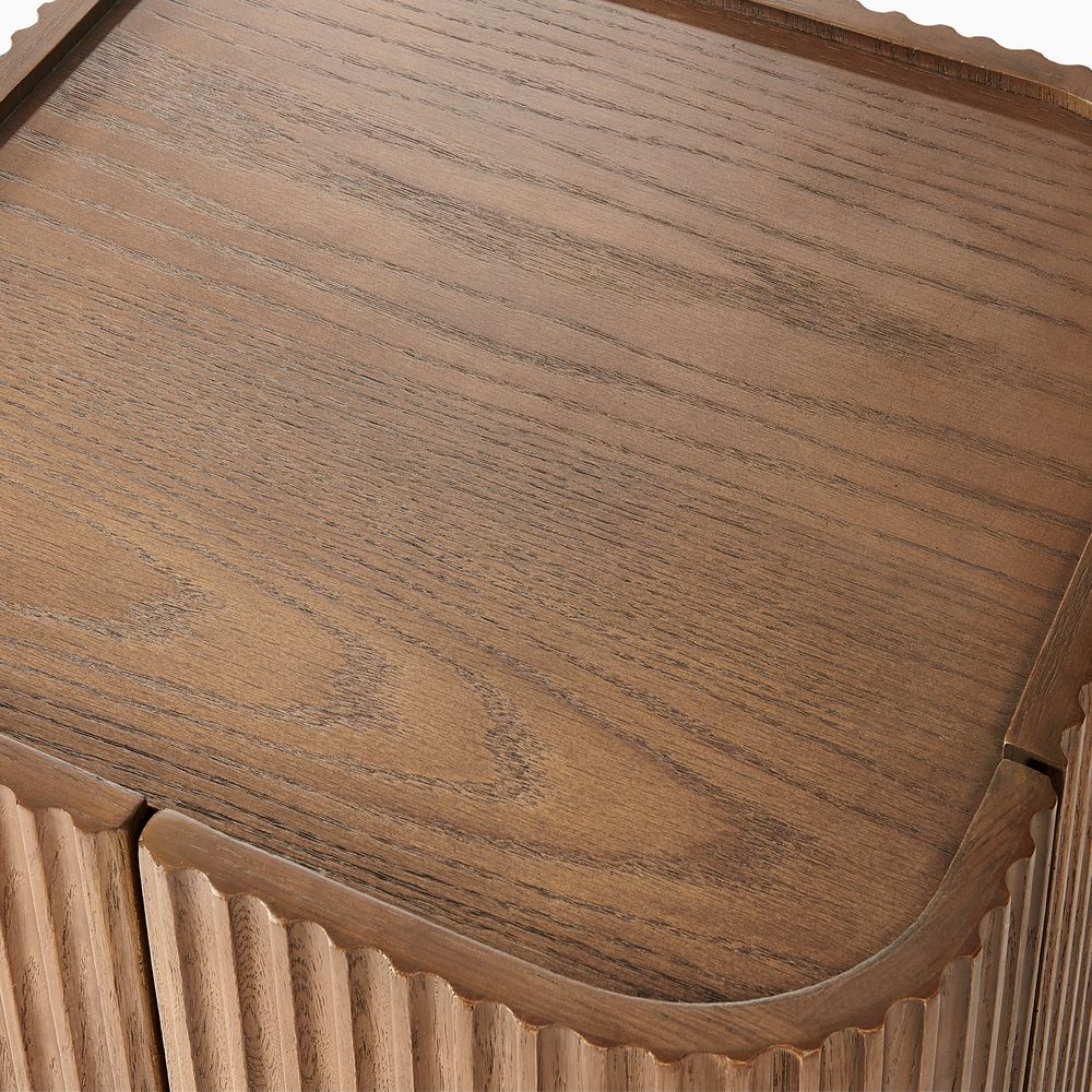Featuring the flutings crafted into a wave-inspired design, this creation of the Skimra collection merges form with function. The warm wood finish and rhythmic detailing evoke a sense of movement, providing a unique storage option that adds a touch of artistry to any space.