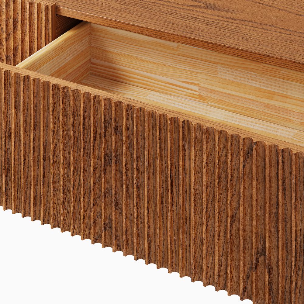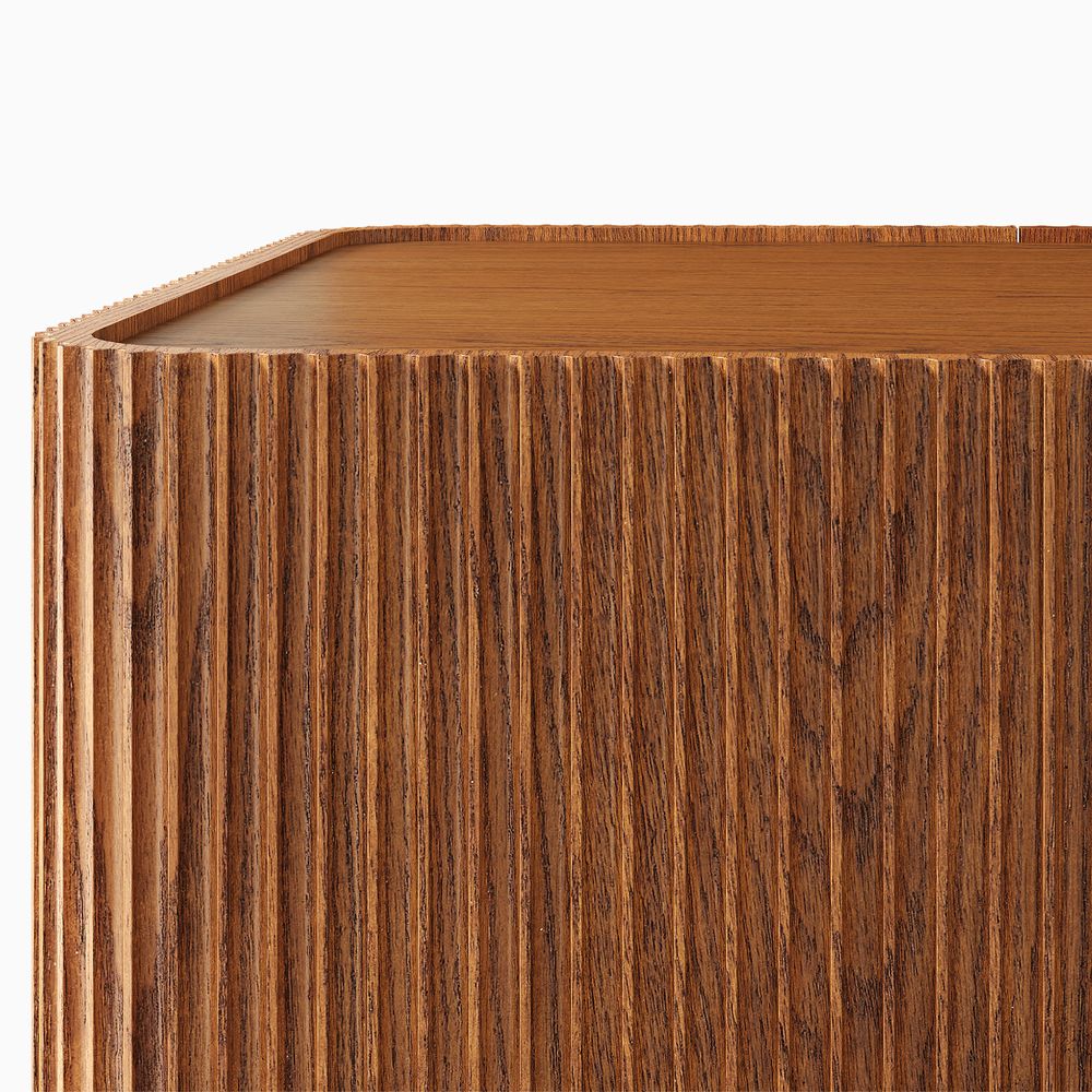 Featuring the flutings crafted into a wave-inspired design, this creation of the Skimra collection merges form with function. The warm wood finish and rhythmic detailing evoke a sense of movement, providing a unique storage option that adds a touch of artistry to any space.