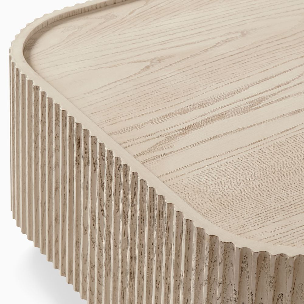 Solid oak wood fluting presents a natural texture.