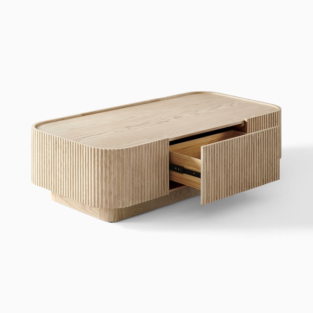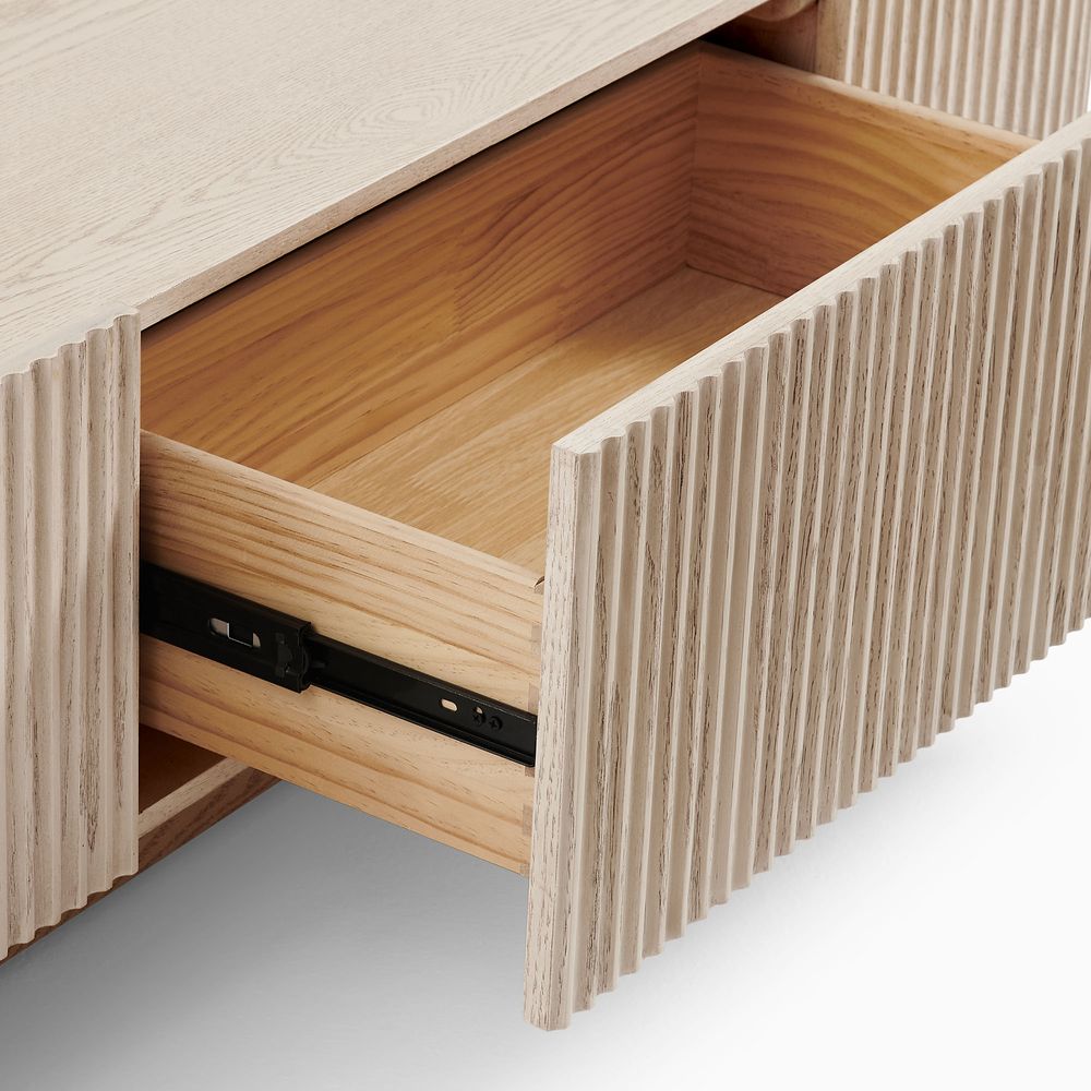 Featuring the flutings crafted into a wave-inspired design, this creation of the Skimra collection merges form with function. The warm wood finish and rhythmic detailing evoke a sense of movement, providing a unique storage option that adds a touch of artistry to any space.