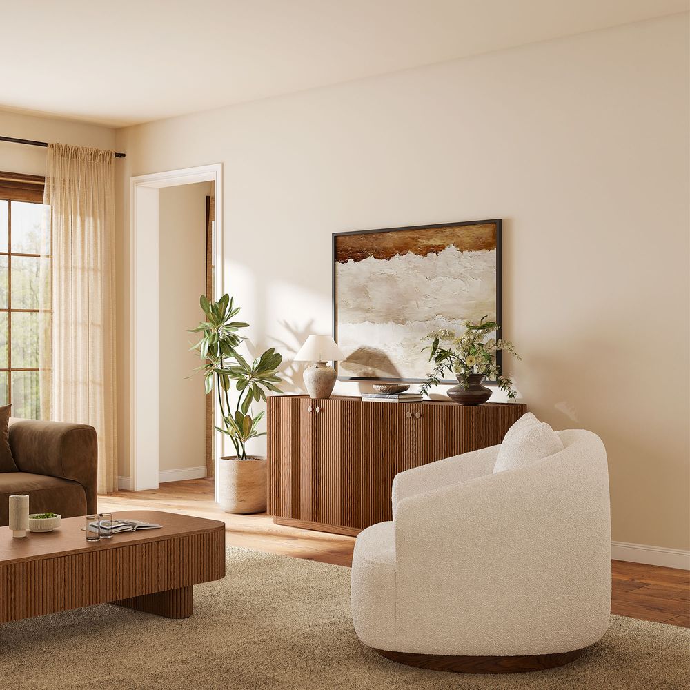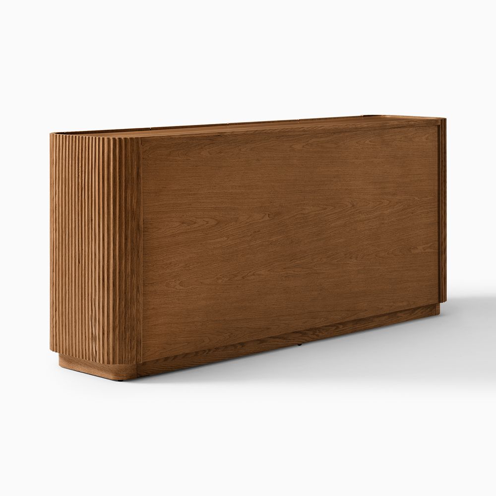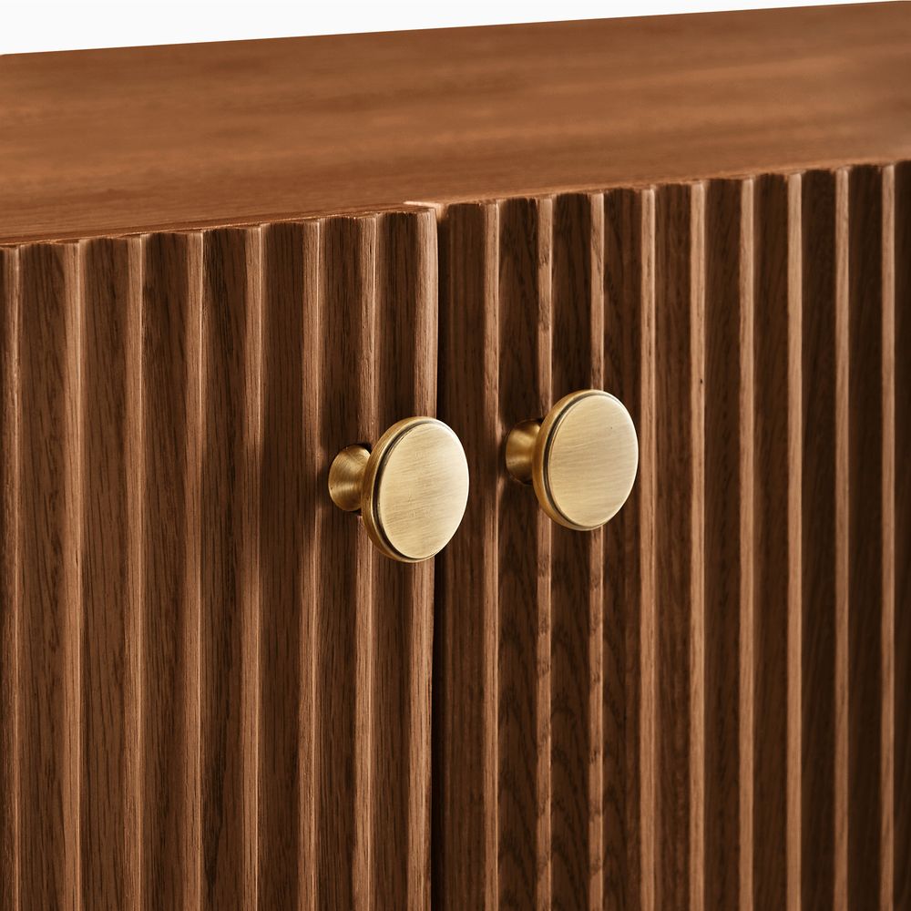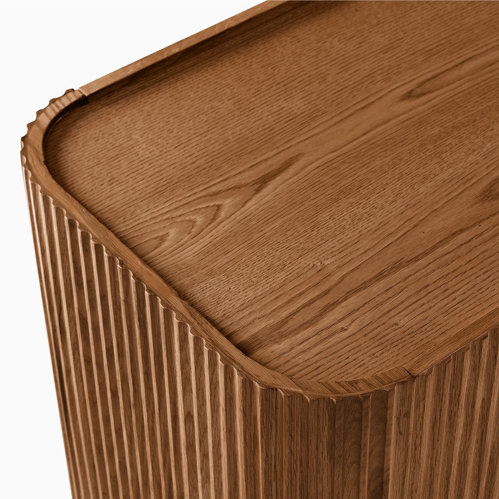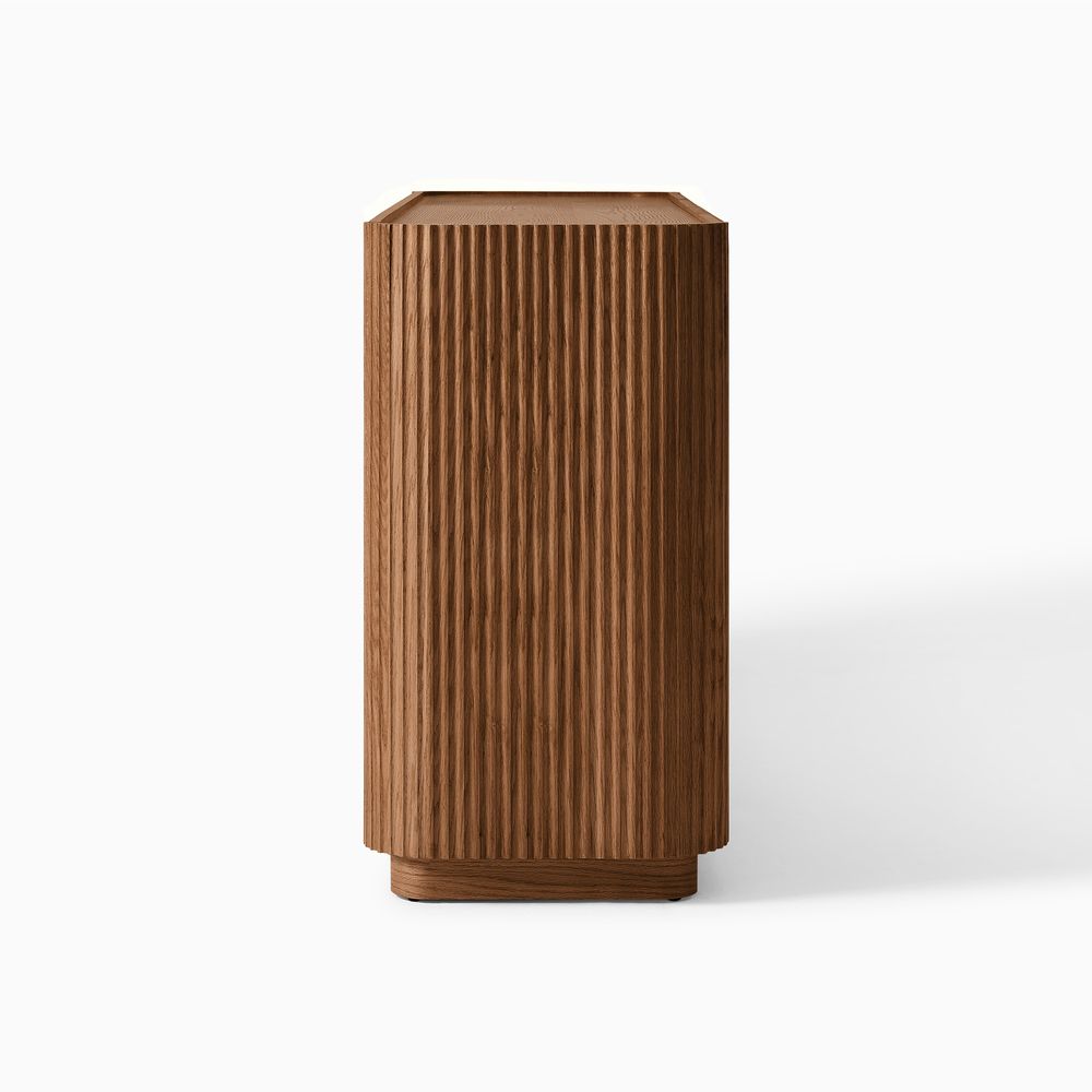 Featuring the flutings crafted into a wave-inspired design, this creation of the Skimra collection merges form with function. The warm wood finish and rhythmic detailing evoke a sense of movement, providing a unique storage option that adds a touch of artistry to any space.