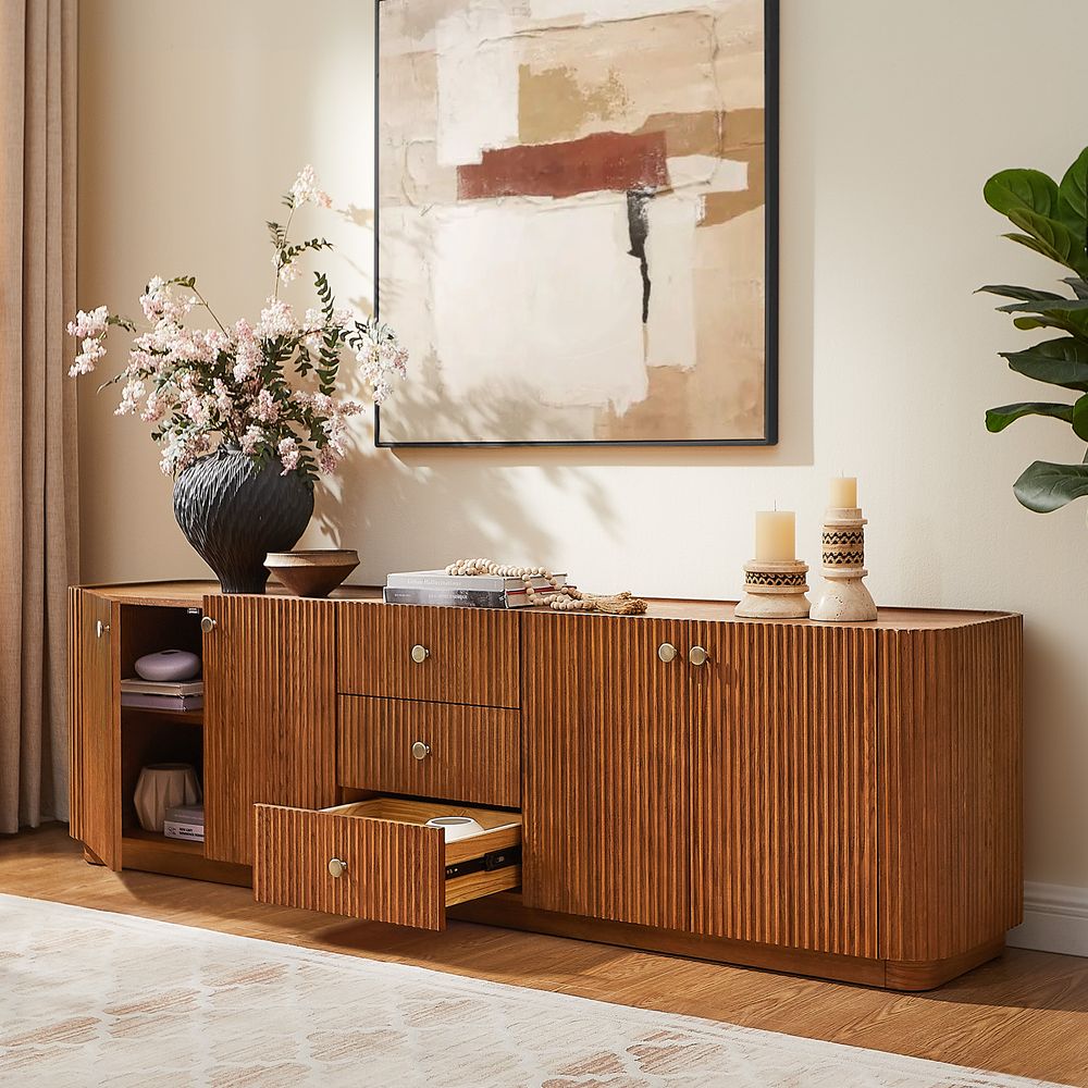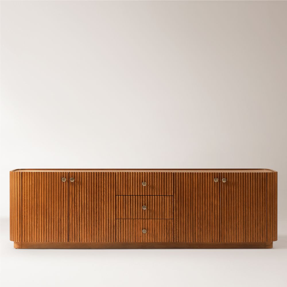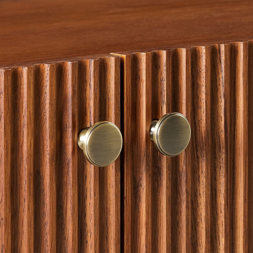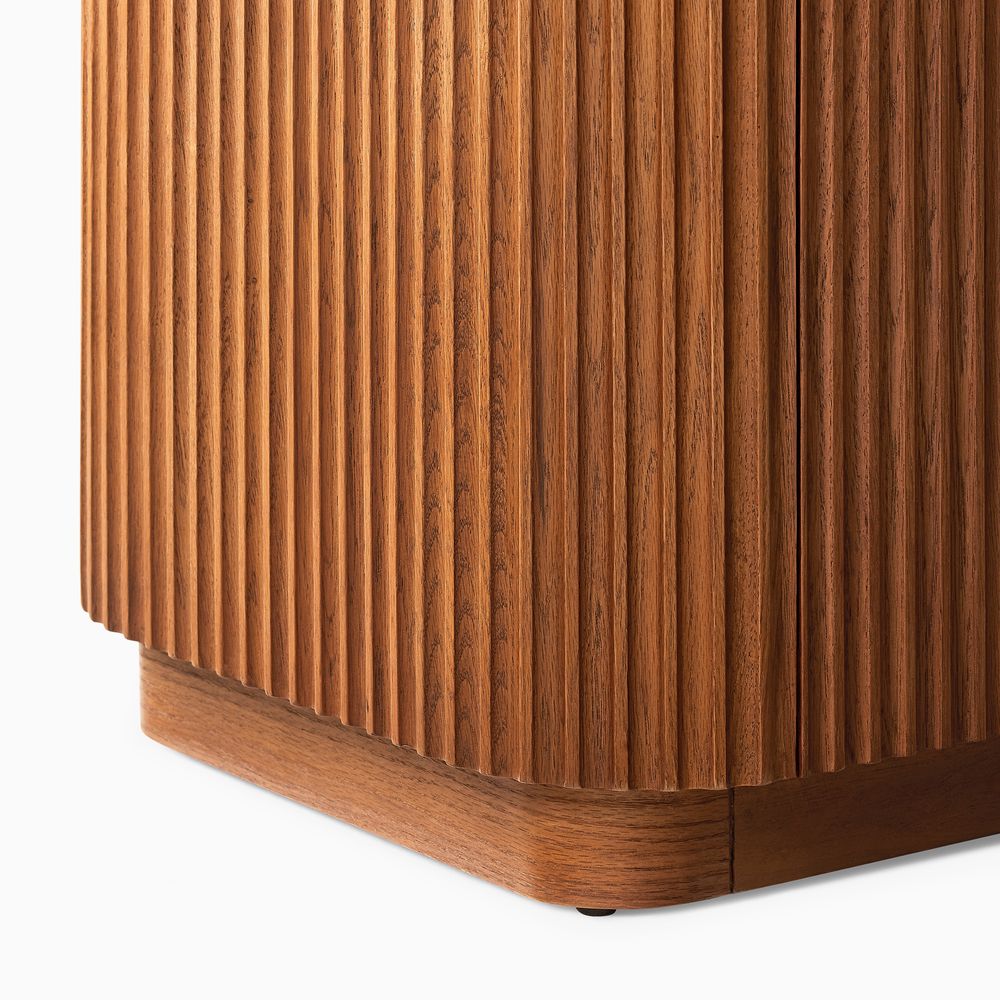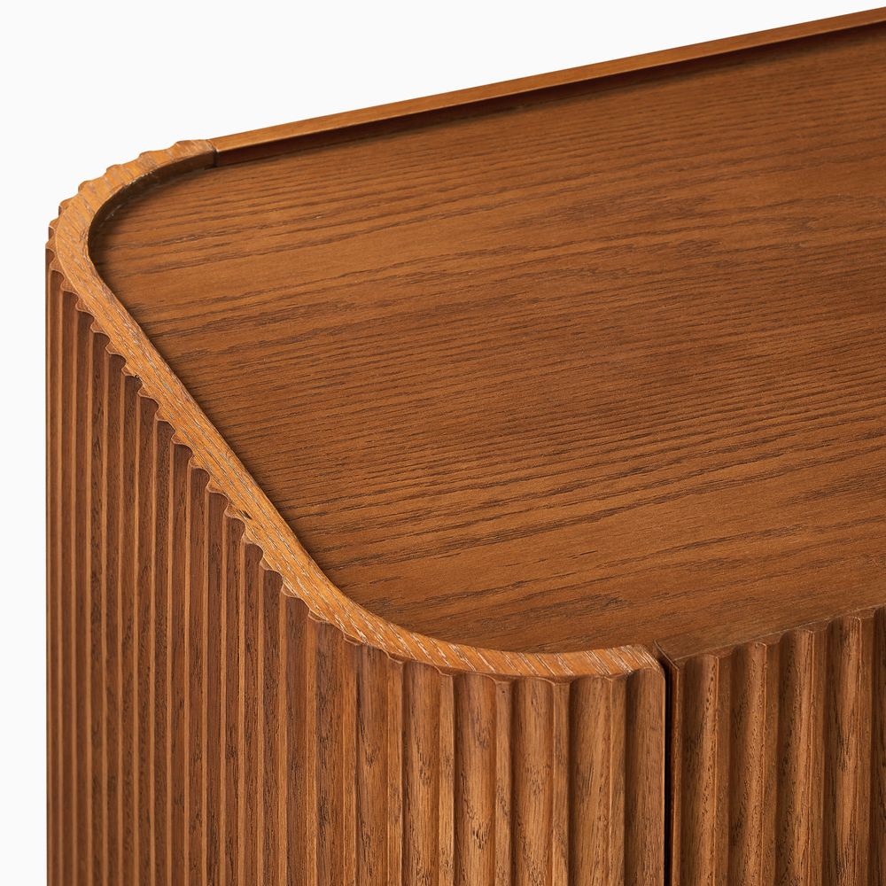 Featuring the flutings crafted into a wave-inspired design, this creation of the Skimra collection merges form with function. The warm wood finish and rhythmic detailing evoke a sense of movement, providing a unique storage option that adds a touch of artistry to any space.