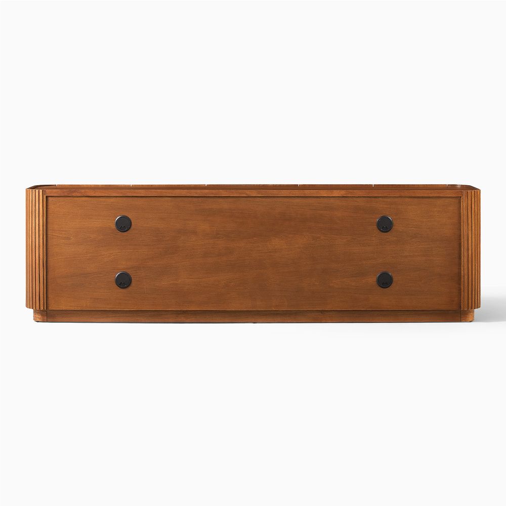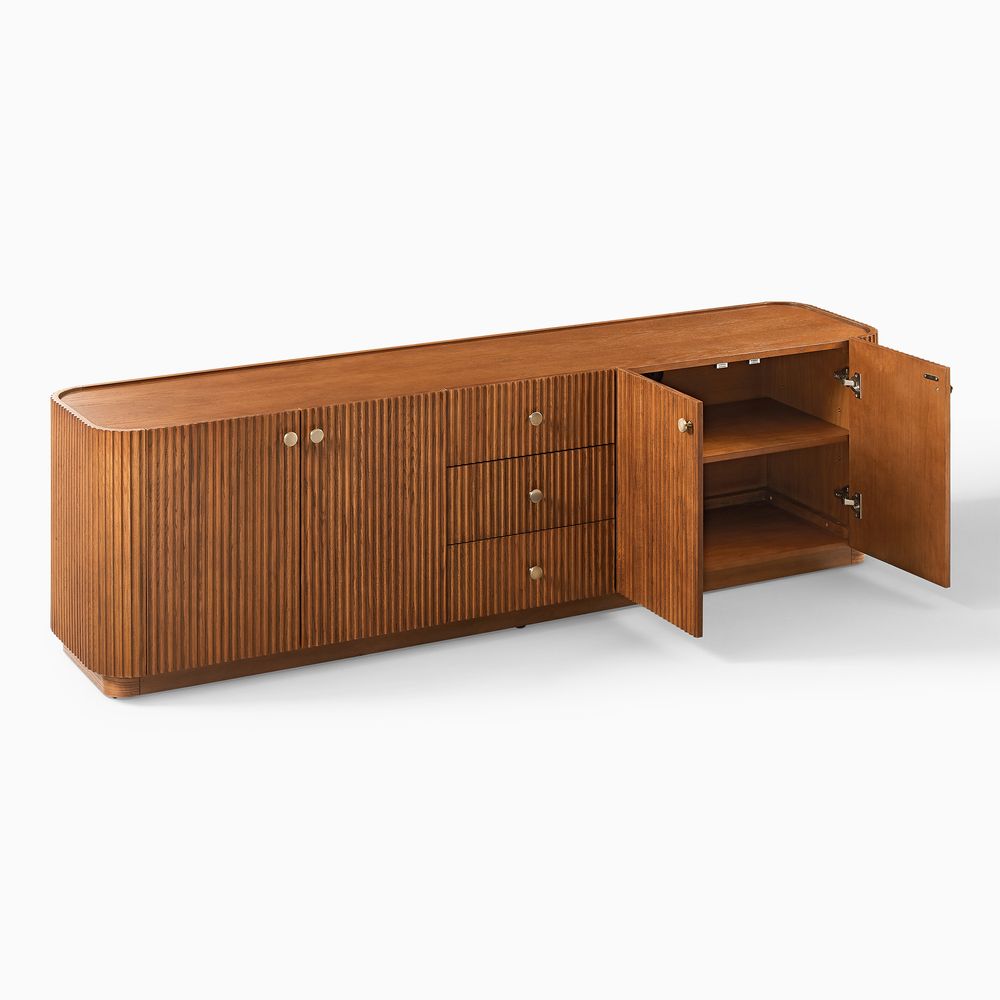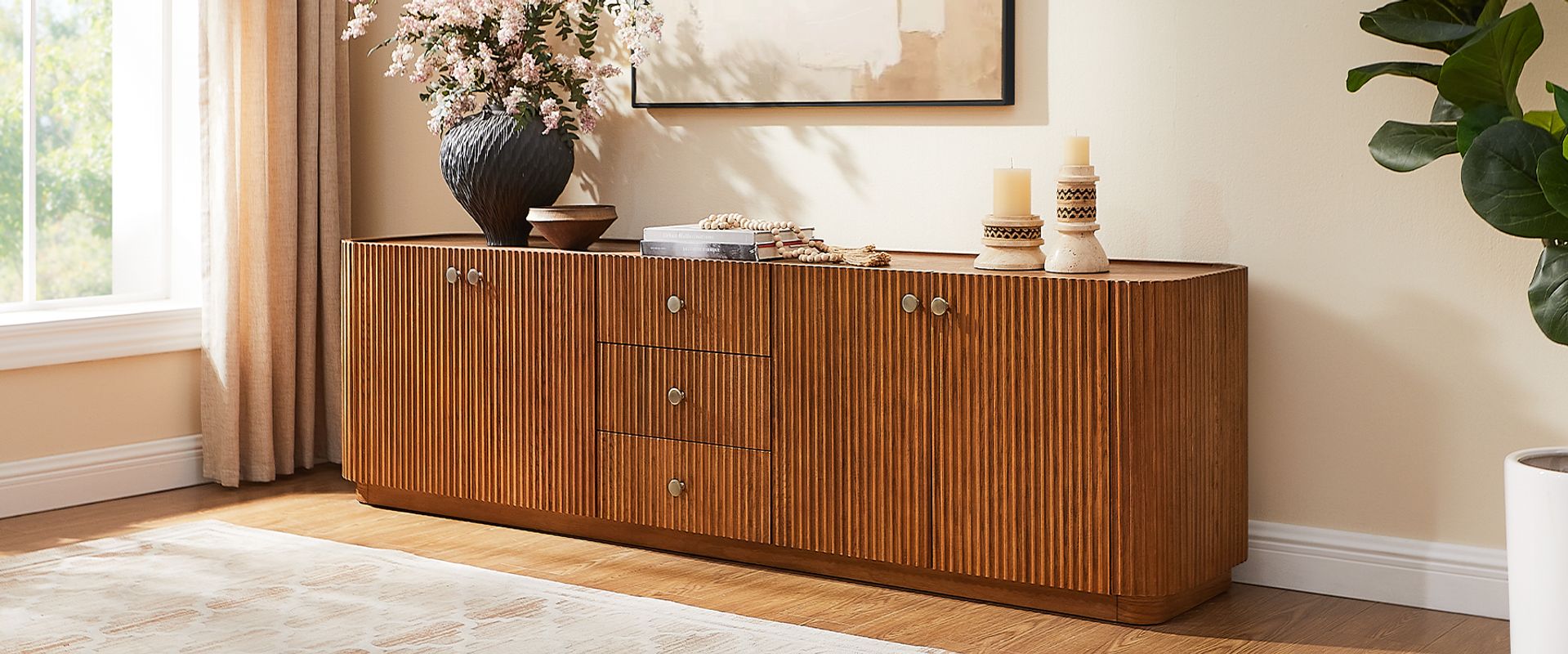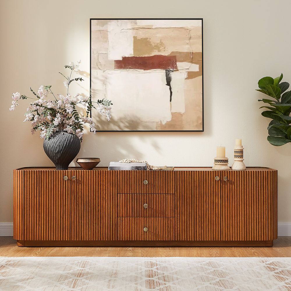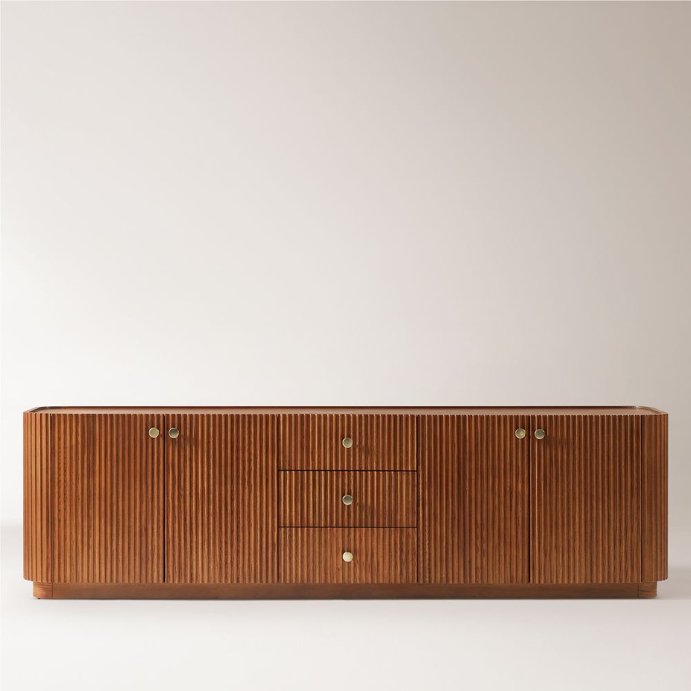Featuring the flutings crafted into a wave-inspired design, this creation of the Skimra collection merges form with function. The warm wood finish and rhythmic detailing evoke a sense of movement, providing a unique storage option that adds a touch of artistry to any space.