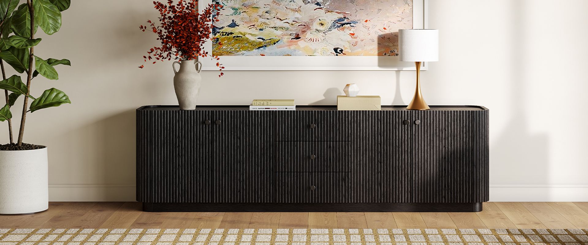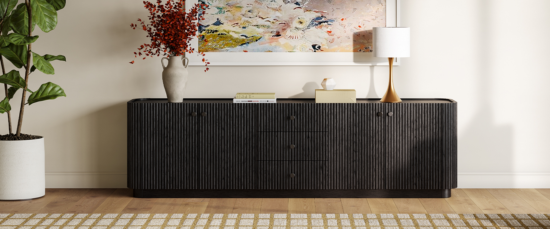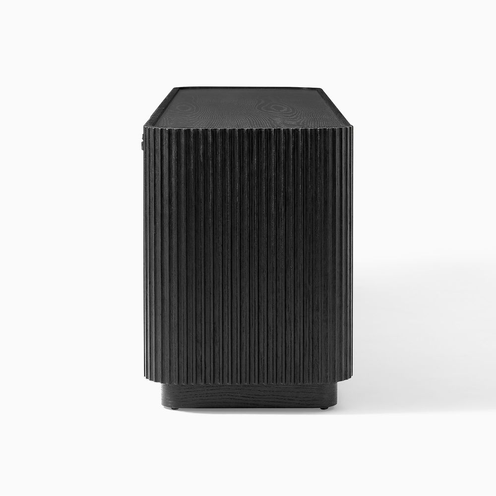 Featuring the flutings crafted into a wave-inspired design, this creation of the Skimra collection merges form with function. The warm wood finish and rhythmic detailing evoke a sense of movement, providing a unique storage option that adds a touch of artistry to any space.