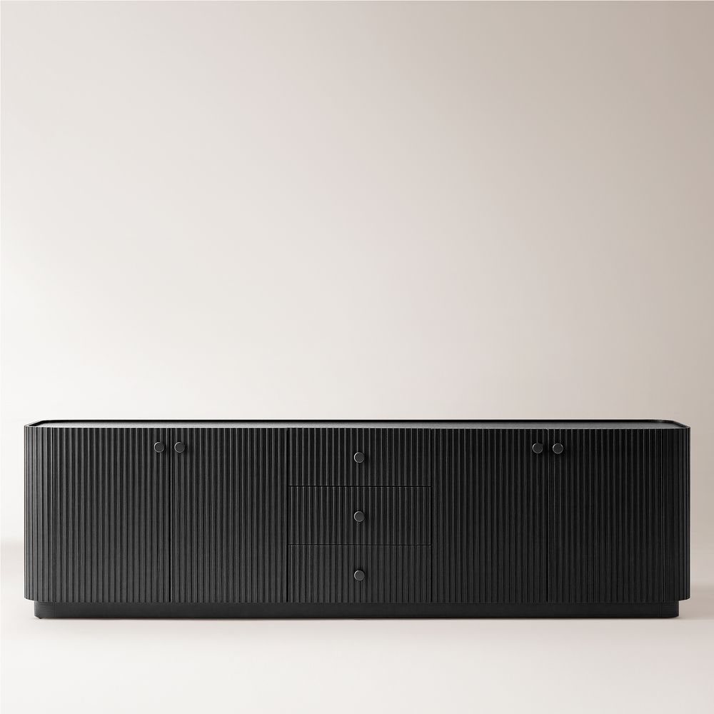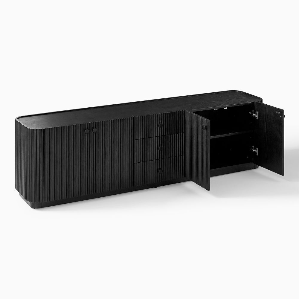 Crafted of American solid oak and engineered wood with oak veneers.All wood is kiln-dried for added durability.Finish is achieved through multistep process in which wood is wire brushed to highlight its rich grain.Drawers are crafted with precision dovetail joints for superior sturdiness and weight-bearing strength.Wood glazing adds visual interest with greater depth and layering and enhances coloring.Solid wood blocks are used at structural joints for reinforcement.Solid oak wood fluting presents a natural texture.Designed for TVs up to 85", 4 cord cutouts in back panel for cable management.Color perception may vary due to wood characteristics, lighting, and devices. Wood grain variation is expected, as each is unique.