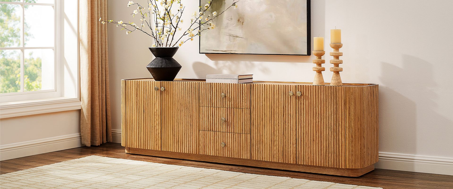 Featuring the flutings crafted into a wave-inspired design, this creation of the Skimra collection merges form with function. The warm wood finish and rhythmic detailing evoke a sense of movement, providing a unique storage option that adds a touch of artistry to any space.