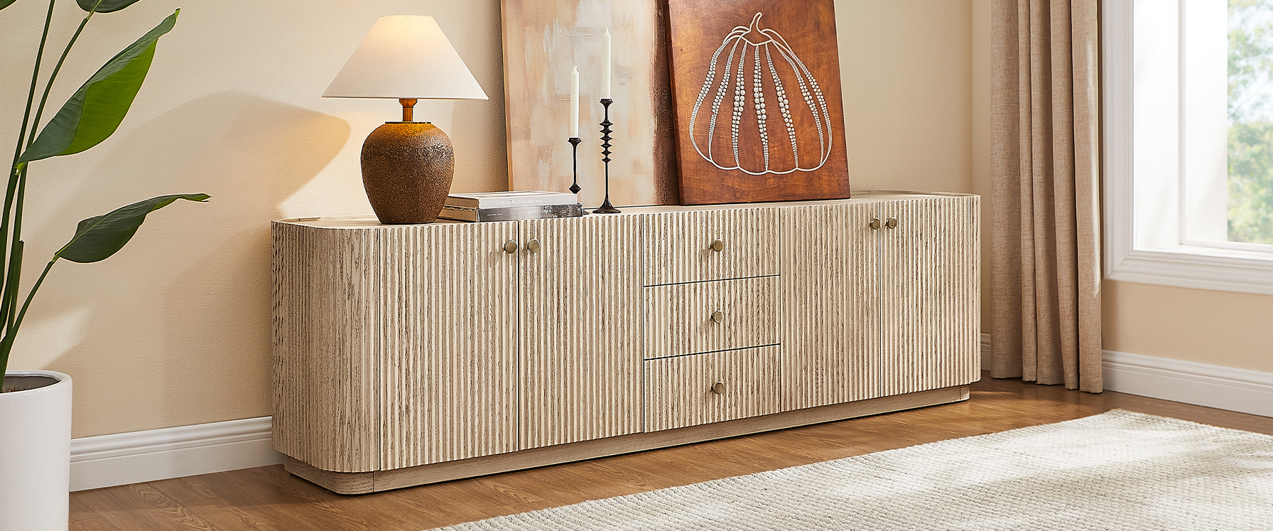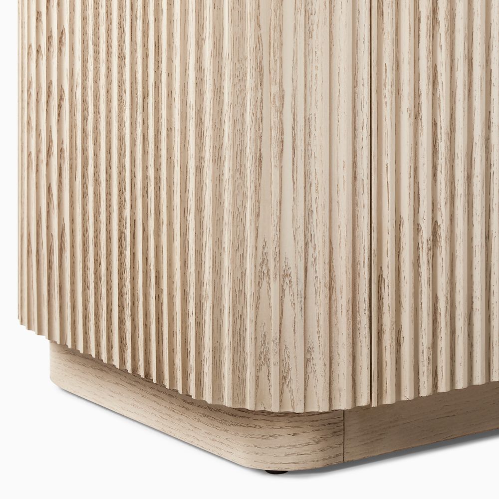 Featuring the flutings crafted into a wave-inspired design, this creation of the Skimra collection merges form with function. The warm wood finish and rhythmic detailing evoke a sense of movement, providing a unique storage option that adds a touch of artistry to any space.