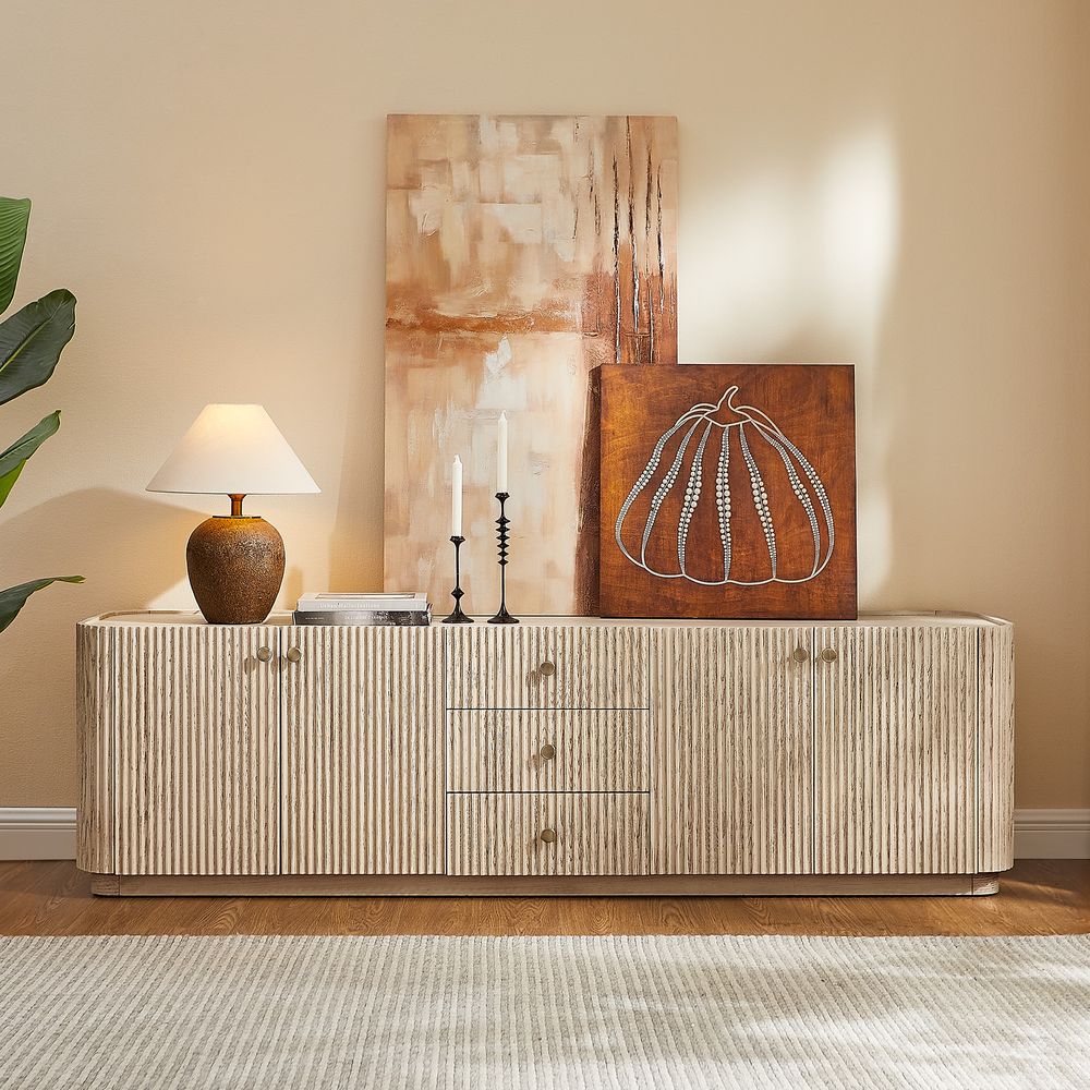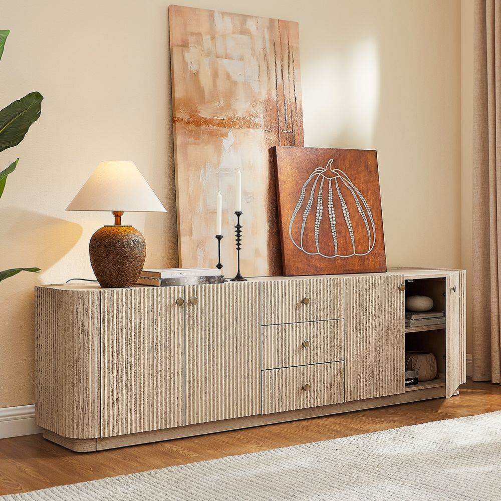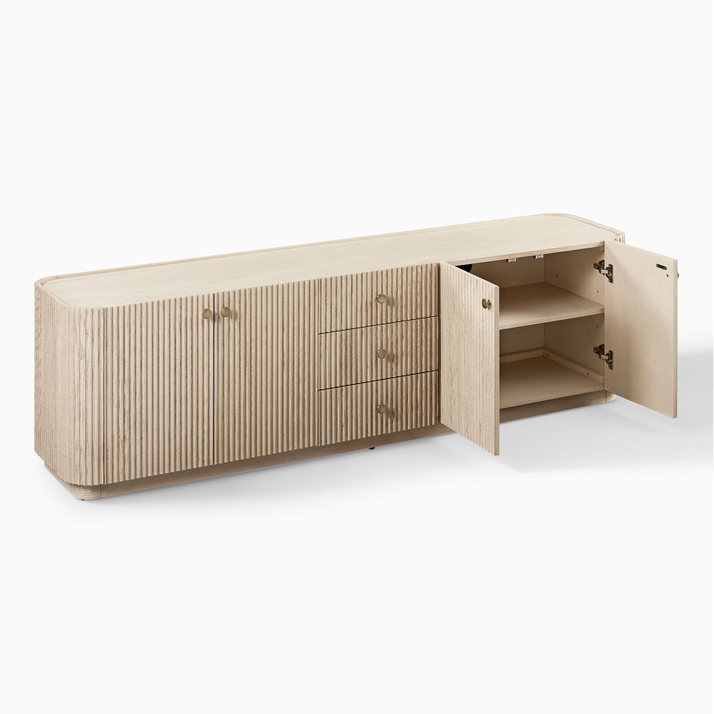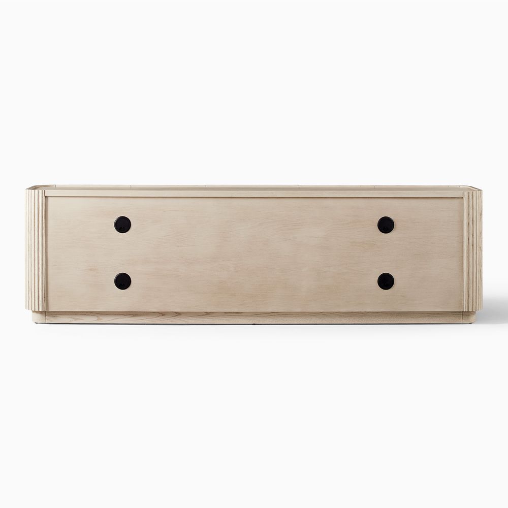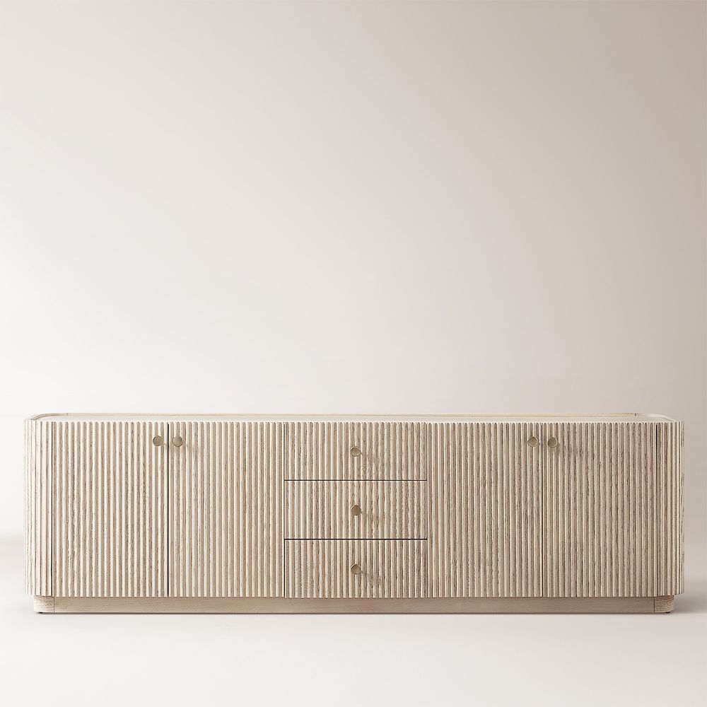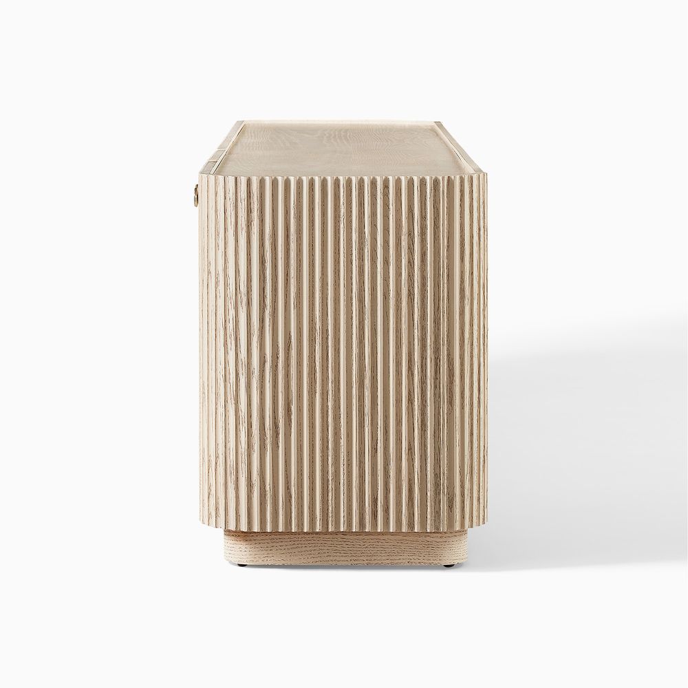 Crafted of American solid oak and engineered wood with oak veneers.All wood is kiln-dried for added durability.Finish is achieved through multistep process in which wood is wire brushed to highlight its rich grain.Drawers are crafted with precision dovetail joints for superior sturdiness and weight-bearing strength.Wood glazing adds visual interest with greater depth and layering and enhances coloring.Solid wood blocks are used at structural joints for reinforcement.Solid oak wood fluting presents a natural texture.Designed for TVs up to 85", 4 cord cutouts in back panel for cable management.Color perception may vary due to wood characteristics, lighting, and devices. Wood grain variation is expected, as each is unique.
