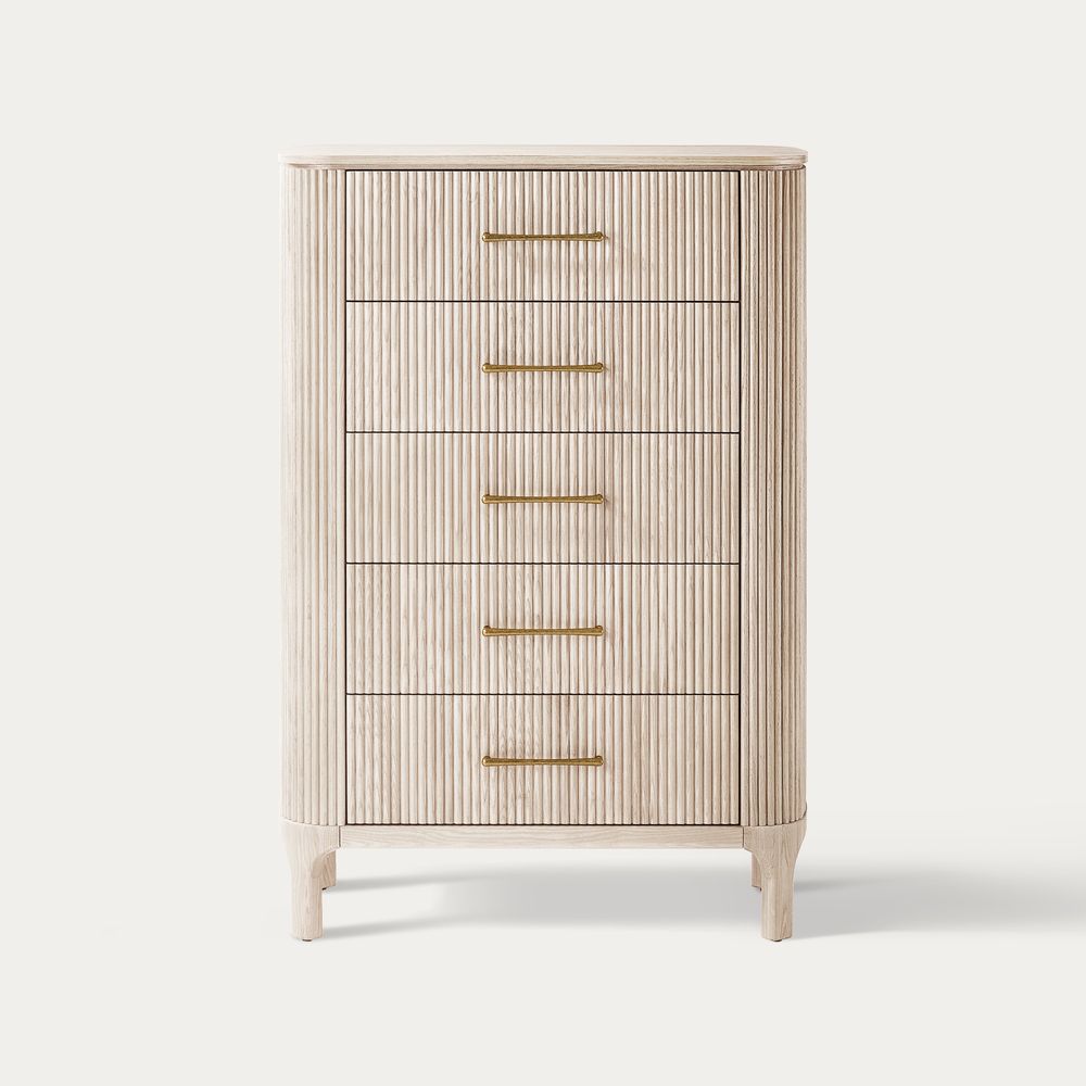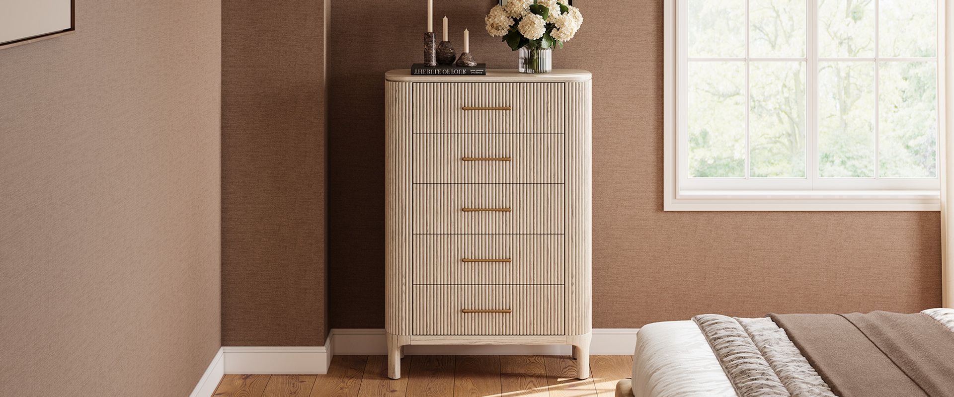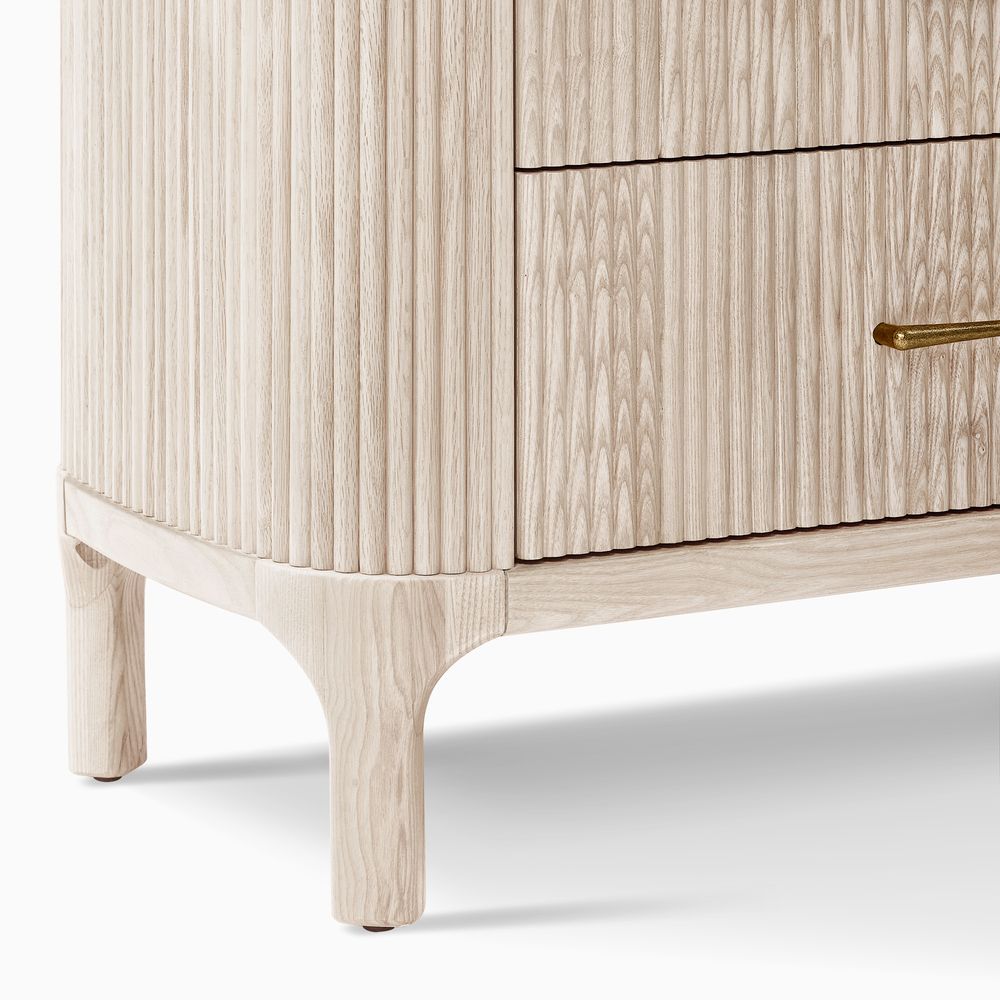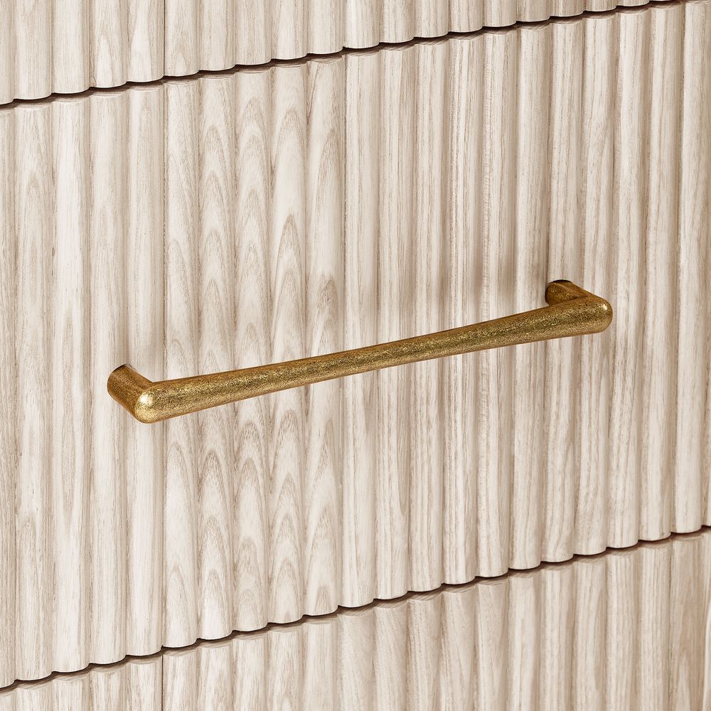 Skugga takes a refined approach to bedroom storage, balancing organic texture with a lightweight design. Wrapped in fluted wood, it showcases the natural variation of grain and subtle shifts in tone. Rounded, lifted legs enhance the sense of lightness and airiness. Long, slender pulls in a warm brass finish, detailed with a hammered texture, introduce a touch of rustic character. A versatile and inviting piece for the bedroom.