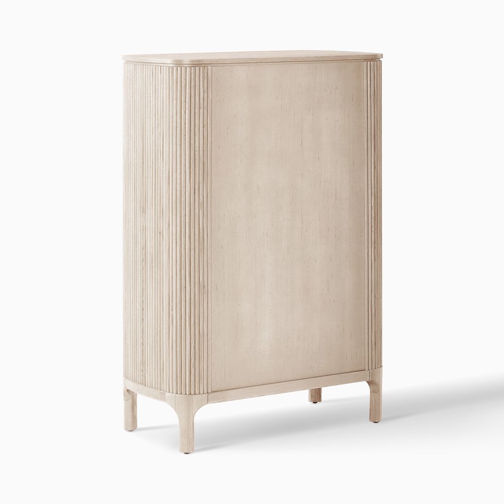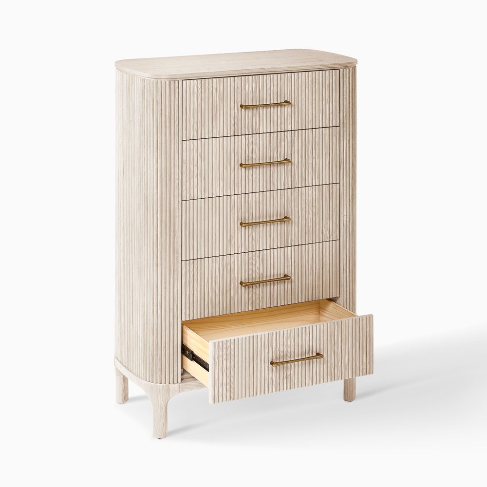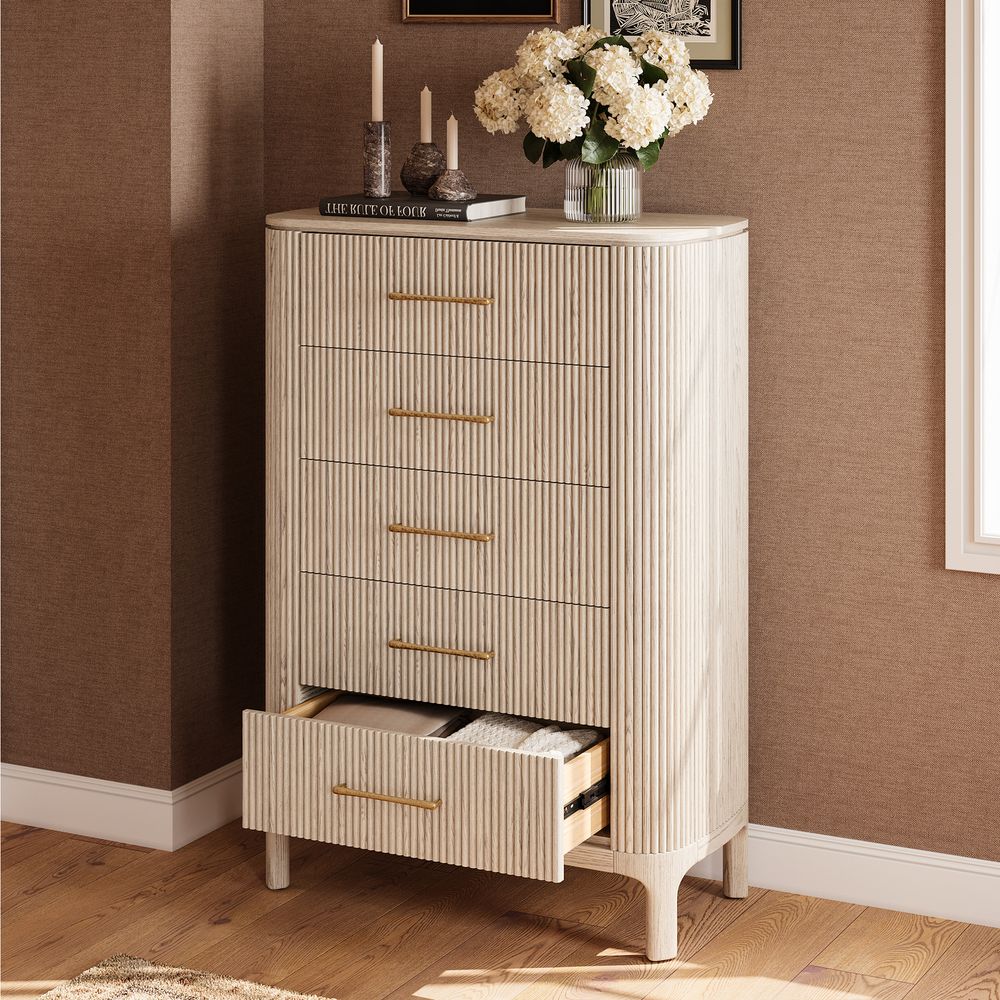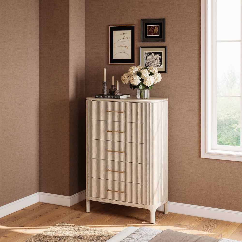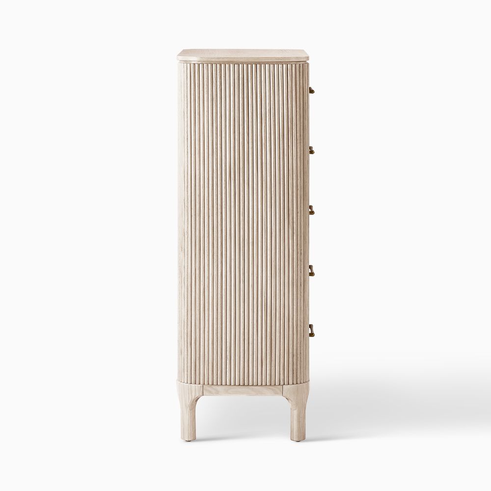 Skugga takes a refined approach to bedroom storage, balancing organic texture with a lightweight design. Wrapped in fluted wood, it showcases the natural variation of grain and subtle shifts in tone. Rounded, lifted legs enhance the sense of lightness and airiness. Long, slender pulls in a warm brass finish, detailed with a hammered texture, introduce a touch of rustic character. A versatile and inviting piece for the bedroom.