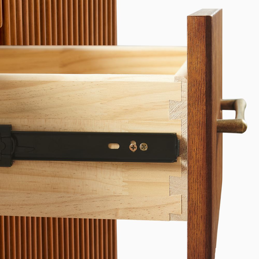 Crafted of engineered stone, solid wood, and plywood with oak veneers.Countertop and backsplash are honed and sealed for a satin finish with deep veining and natural color contrasts.All wood is kiln-dried for added durability.Drawers are crafted with precision dovetail joints for superior sturdiness and weight-bearing strength.Solid wood blocks are used at structural joints for reinforcement.Solid wood fluting presents a natural texture.Color perception may vary due to wood characteristics, lighting, and devices. Wood grain variation is expected, as each is unique.Variation in the veining of stone is to be expected, as each piece will be unique.