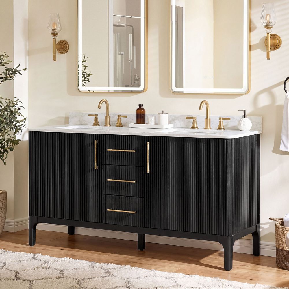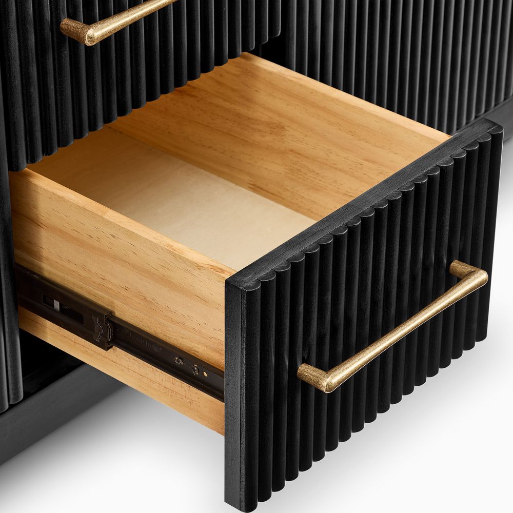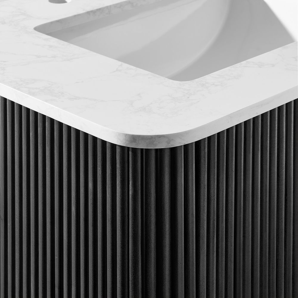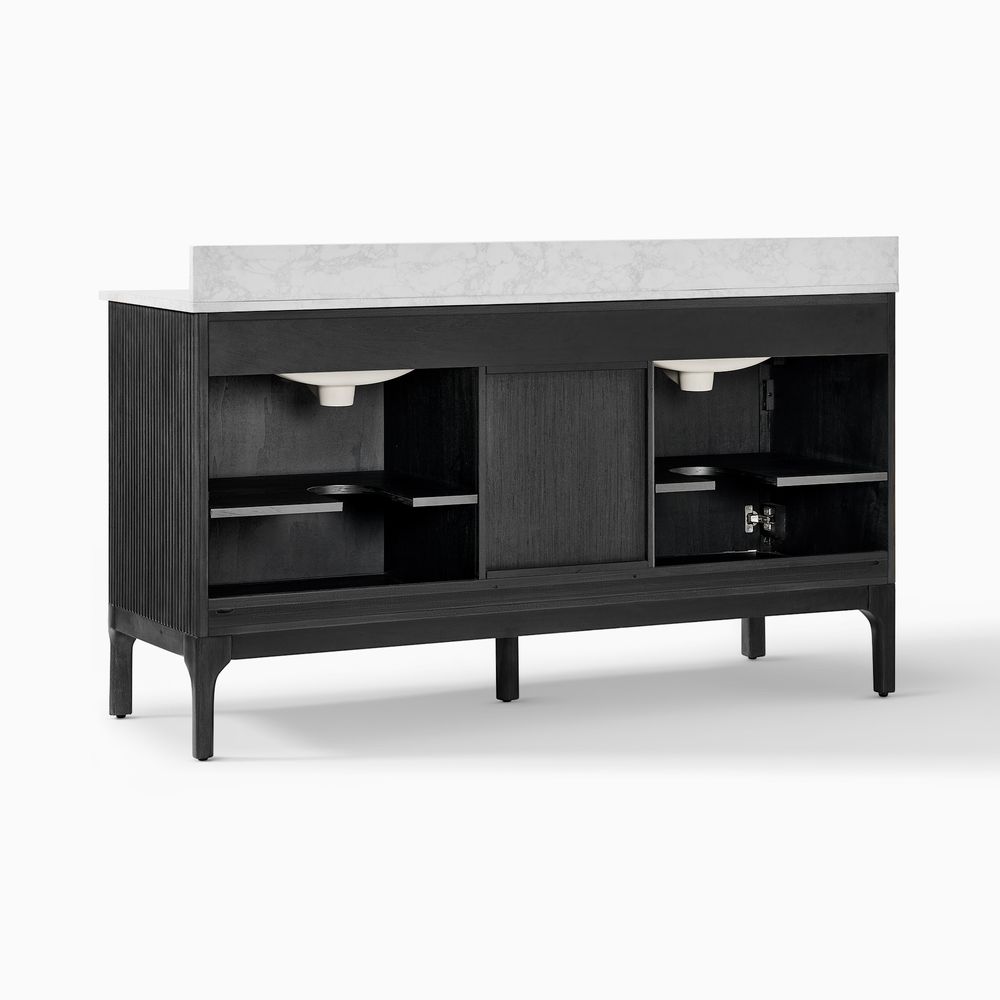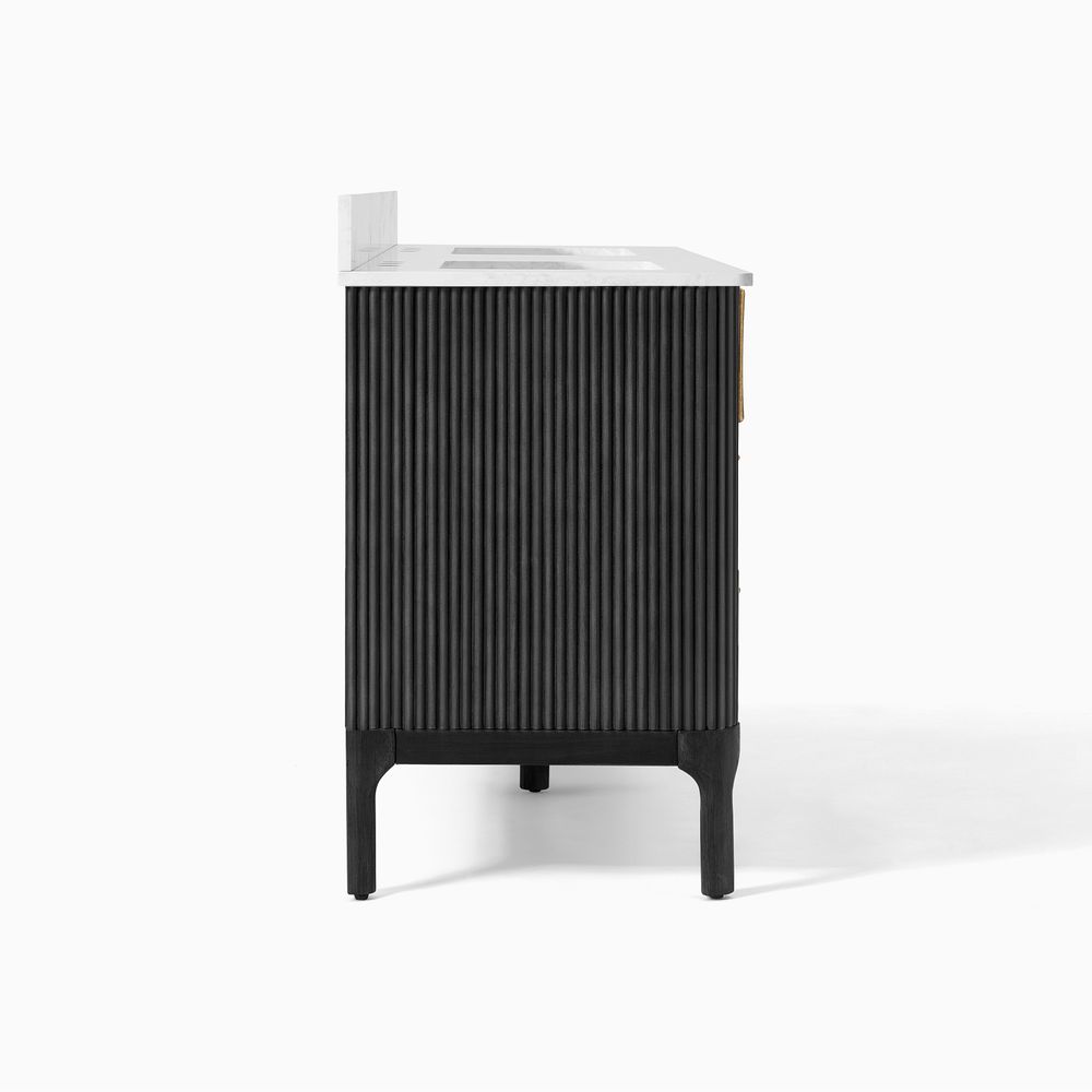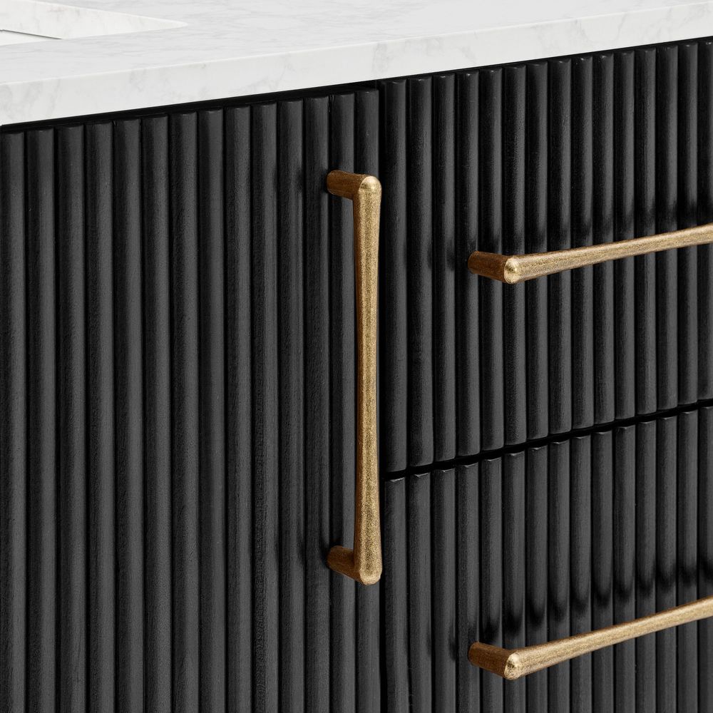 Crafted of engineered stone, solid wood, and plywood with oak veneers.Countertop and backsplash are honed and sealed for a satin finish with deep veining and natural color contrasts.All wood is kiln-dried for added durability.Drawers are crafted with precision dovetail joints for superior sturdiness and weight-bearing strength.Solid wood blocks are used at structural joints for reinforcement.Solid wood fluting presents a natural texture.Color perception may vary due to wood characteristics, lighting, and devices. Wood grain variation is expected, as each is unique.Variation in the veining of stone is to be expected, as each piece will be unique.