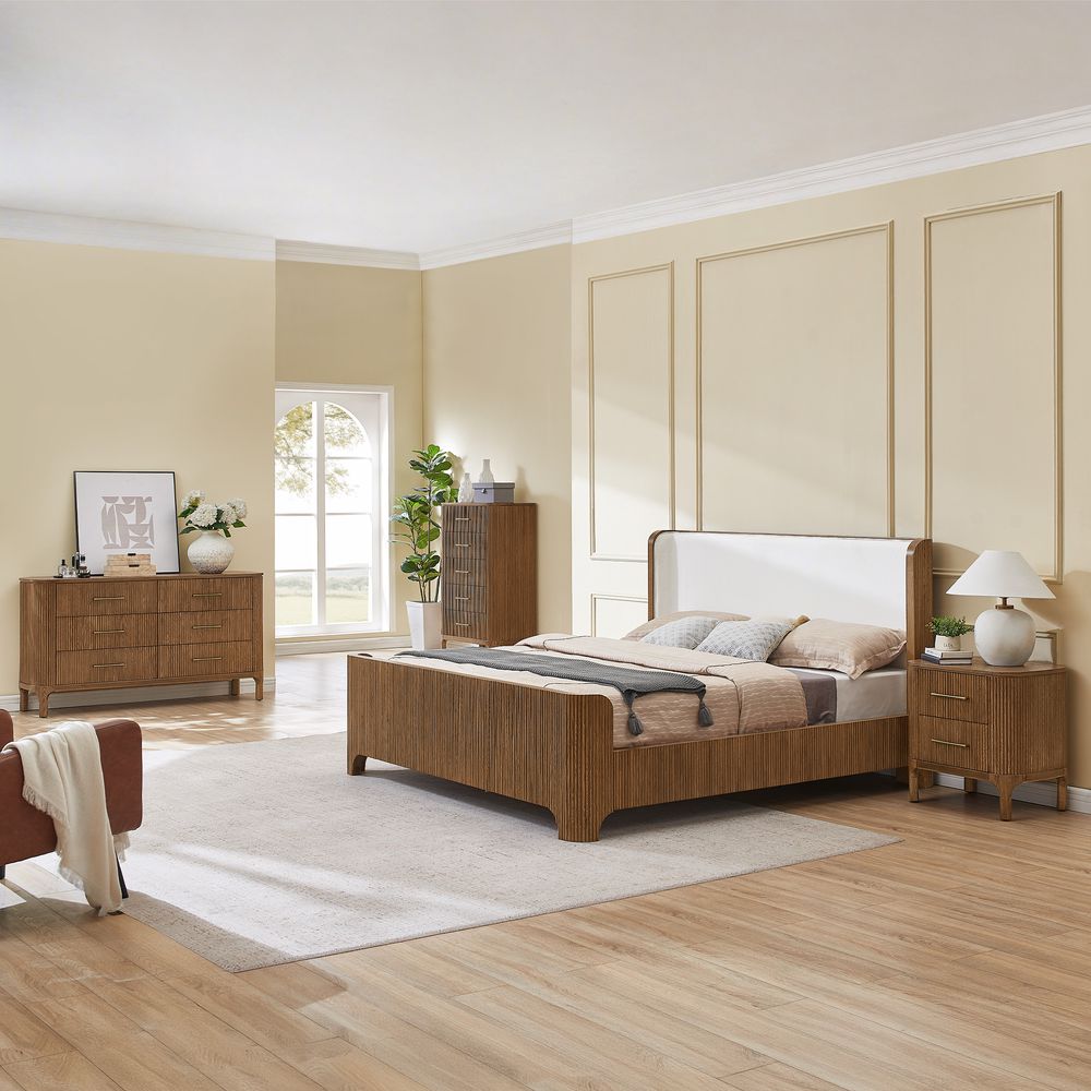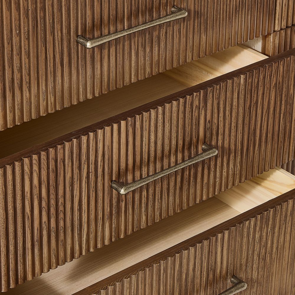 Skugga takes a refined approach to bedroom storage, balancing organic texture with a lightweight design. Wrapped in fluted wood, it showcases the natural variation of grain and subtle shifts in tone. Rounded, lifted legs enhance the sense of lightness and airiness. Long, slender pulls in a warm brass finish, detailed with a hammered texture, introduce a touch of rustic character. A versatile and inviting piece for the bedroom.