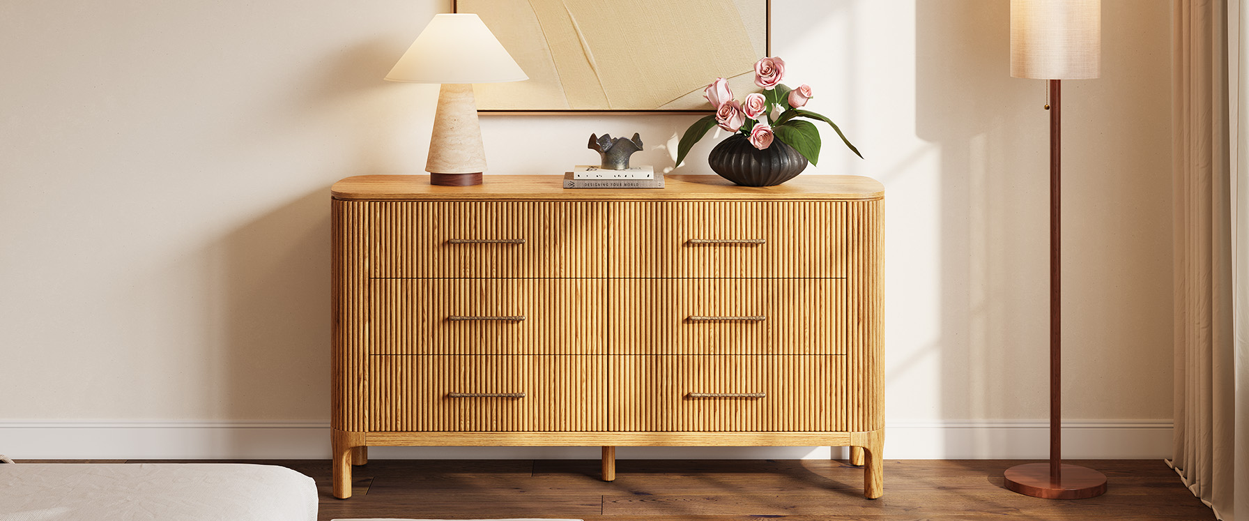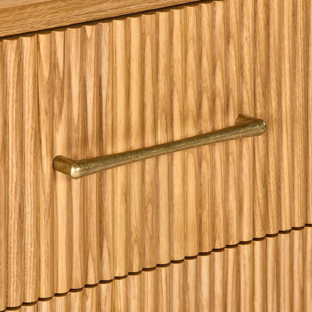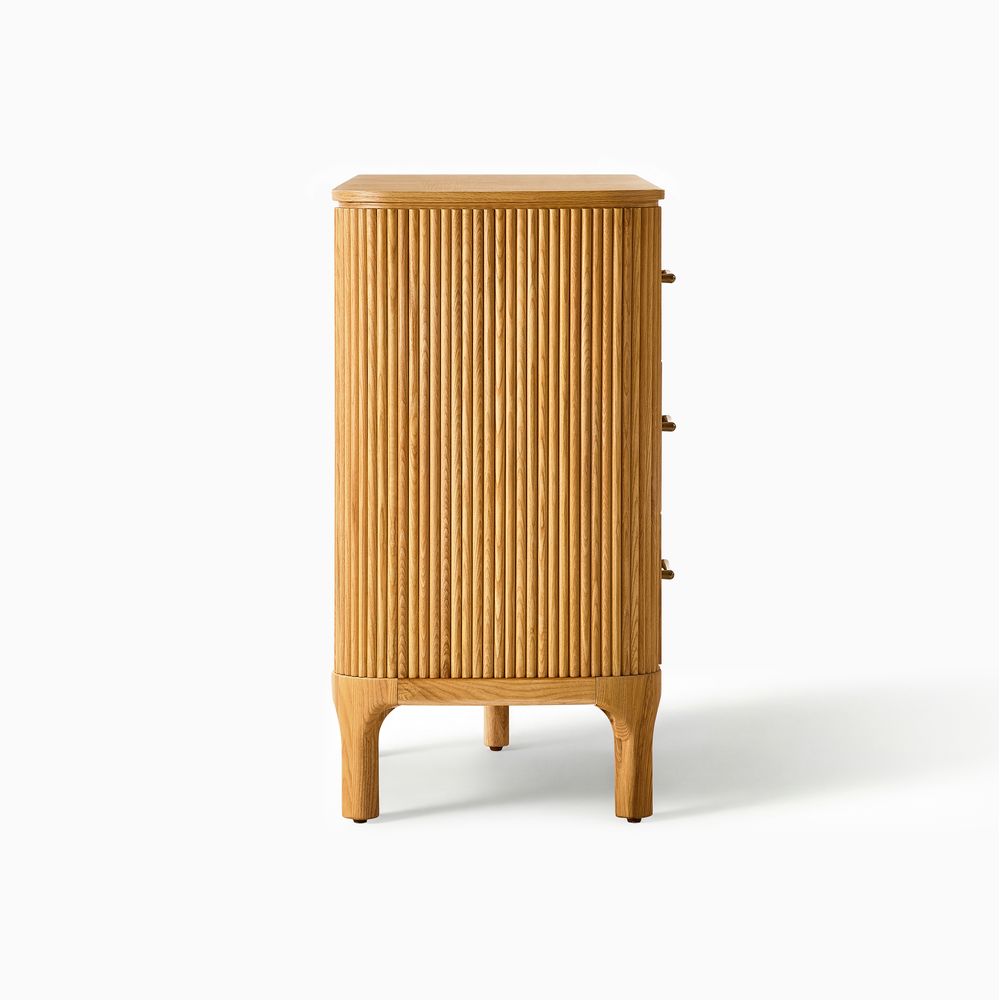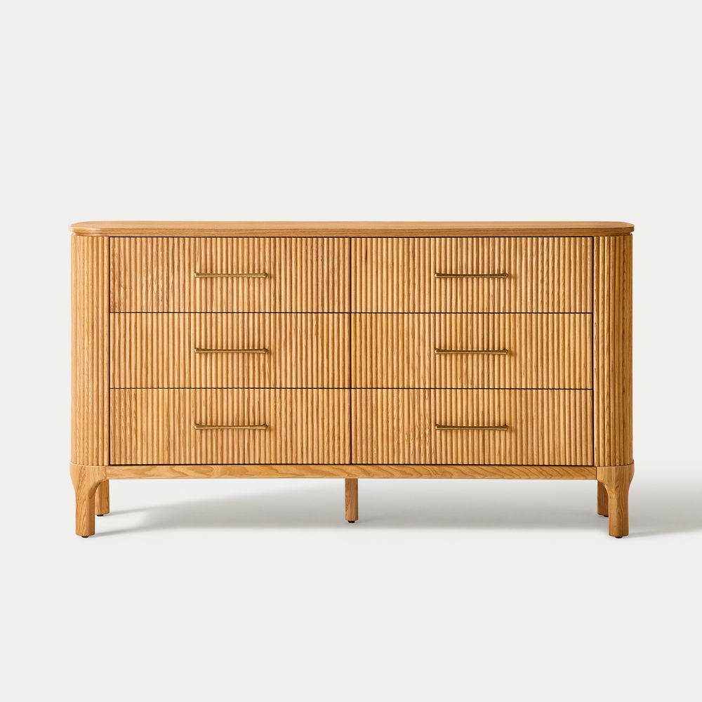 Skugga takes a refined approach to bedroom storage, balancing organic texture with a lightweight design. Wrapped in fluted wood, it showcases the natural variation of grain and subtle shifts in tone. Rounded, lifted legs enhance the sense of lightness and airiness. Long, slender pulls in a warm brass finish, detailed with a hammered texture, introduce a touch of rustic character. A versatile and inviting piece for the bedroom.