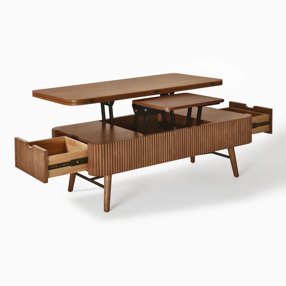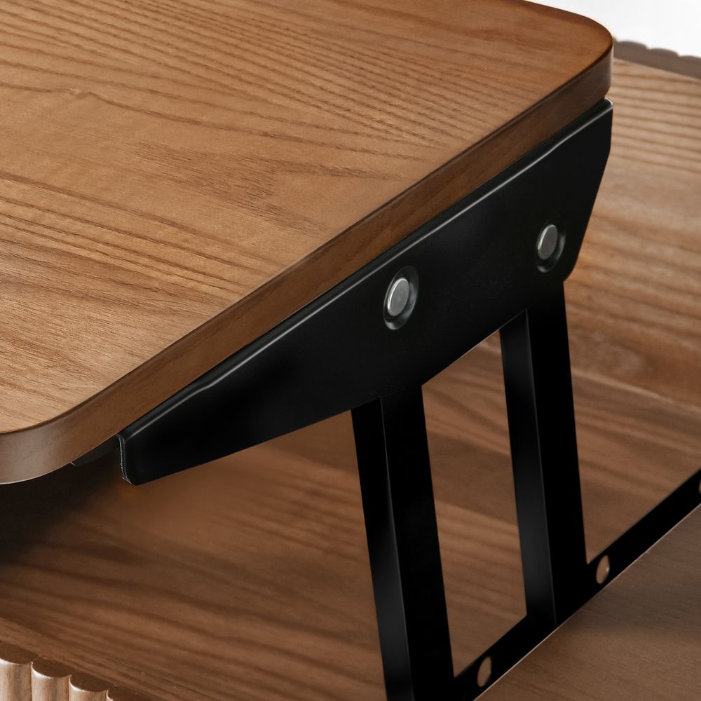 Magnus coffee table embodies the serene rhythm of modern living through its minimalist silhouette. Crafted from ash wood and plywood with ash wood veneer finish, the lift-top extends and adapts seamlessly to diverse needs. A sleek metal frame meets ash wood legs, blending reinforced support, while the fluted base adds tactile depth.