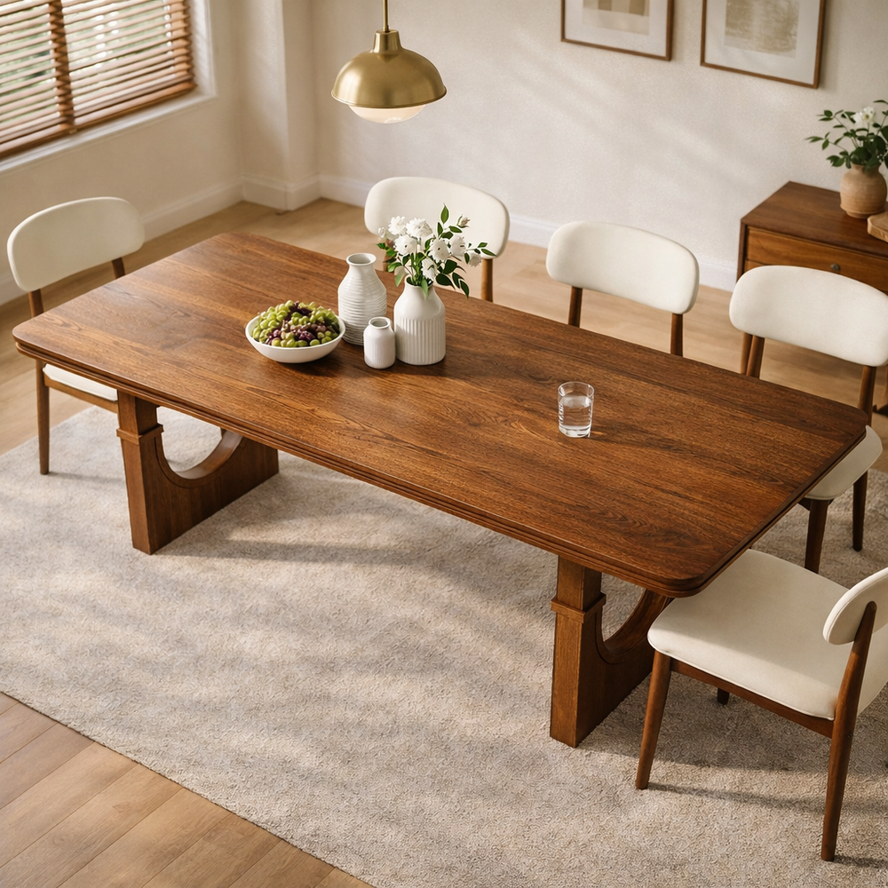 Crafted of American solid oak and engineered wood with oak veneers.All wood is kiln-dried for added durability.Finish is achieved through multistep process in which wood is wire brushed to highlight its rich grain.Wood glazing adds visual interest with greater depth and layering and enhances coloring.Solid wood blocks are used at structural joints for reinforcement.84" table comfortably seats 6-8.Color perception may vary due to wood characteristics, lighting, and devices. Wood grain variation is expected, as each is unique.