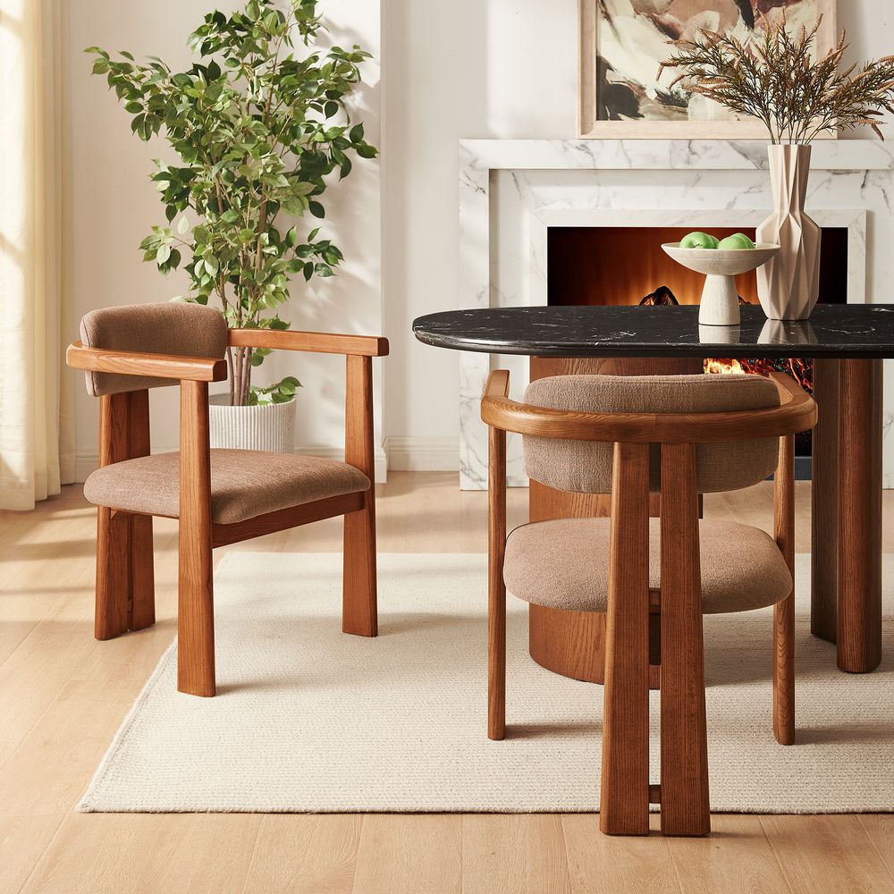 Frame crafted of American solid ash wood and plywood.All wood is kiln-dried for added durability.Durable, tightly woven fabric with a rich texture and natural stain resistance.Wood glazing adds visual interest with greater depth and layering and enhances coloring.Ergonomic armrests for enhanced comfort and support.Seat and back are generously padded with high-resiliency foam.The upholstery on the chair provides soft padding for a cozy and stylish seating surface.Supporting up to 330 lbs.Color perception may vary due to wood characteristics, lighting, and devices. Wood grain variation is expected, as each is unique.Items purchased at different times may not match due to different dye lots, also color perception can vary by lighting and devices.