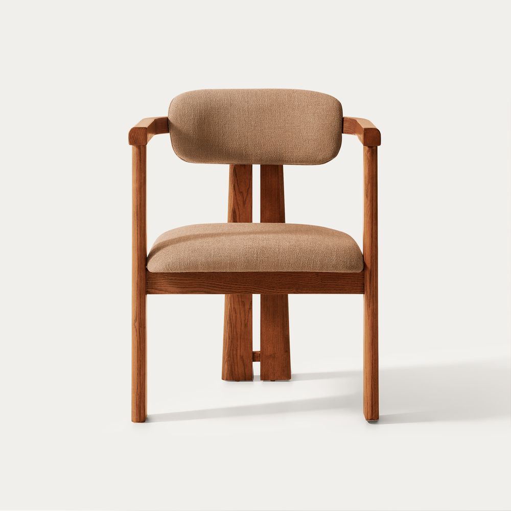 Inspired by classic modern chair design, Spine features an iconic double-beamed back that acts as the structural backbone, connecting the solid wood frame with the gently curved, padded backrest and seat. The legs take the form of trapezoidal flat planks, widening from top to base to give the piece a strong sense of stability. To introduce warmth while preserving its clean, minimalist expression, slender curved arms extend from the backbone, flowing seamlessly to connect the entire form in a welcoming embrace.