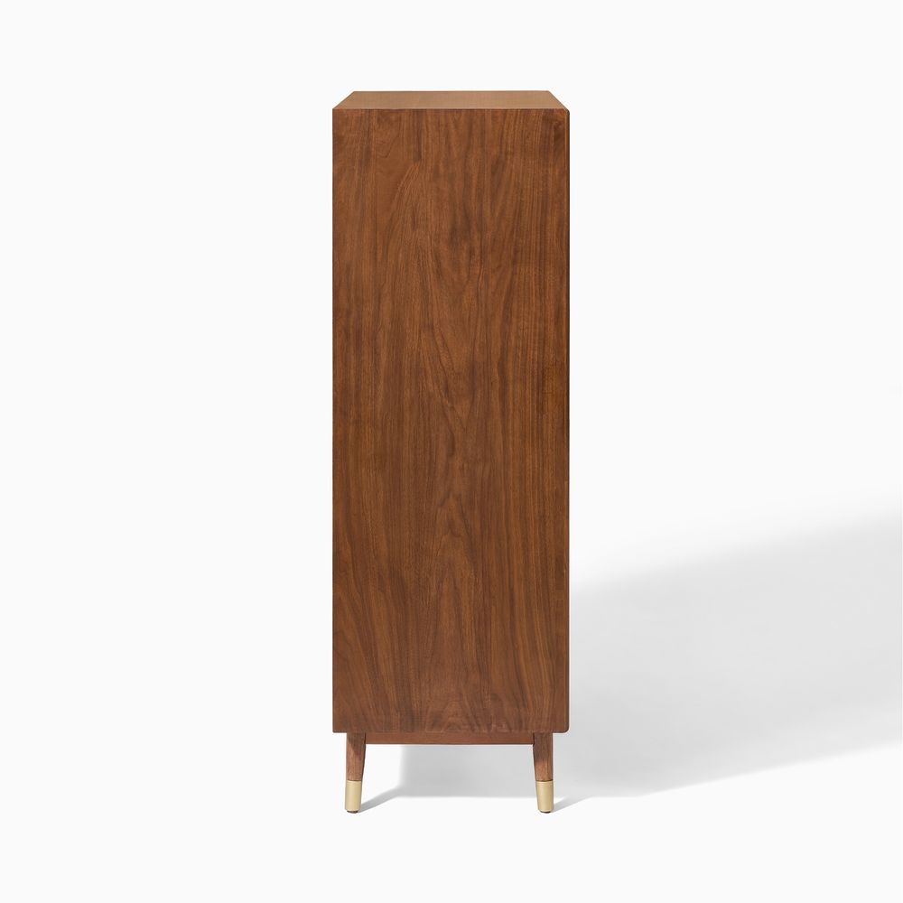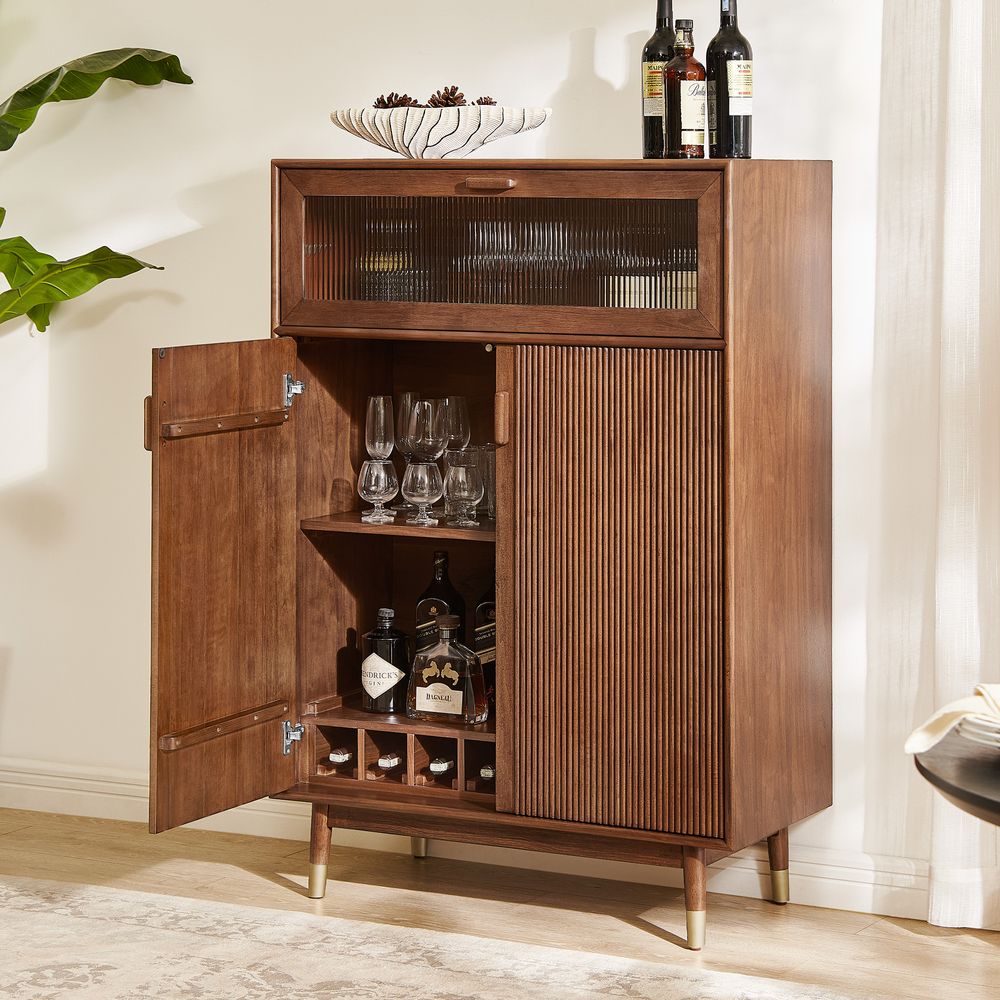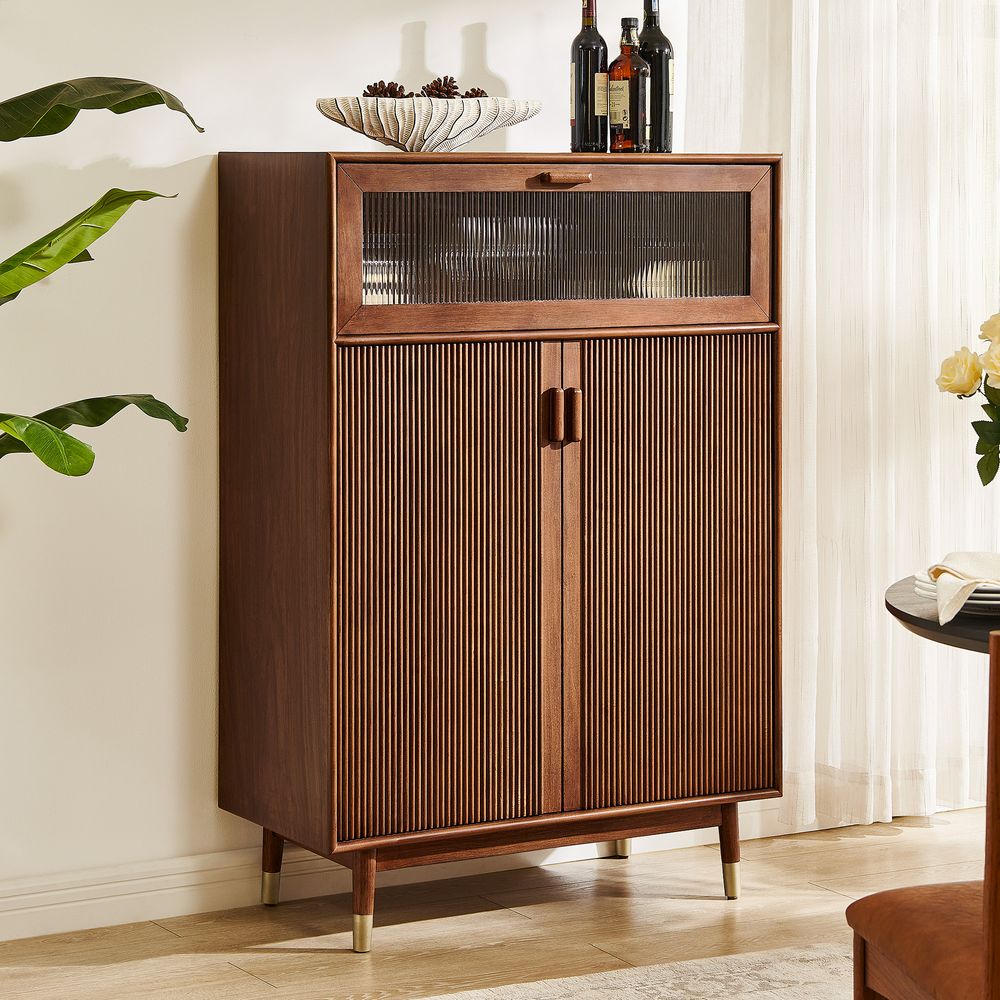 Stavn embodies classic mid-century modern style, defined by clean lines and tapered legs accented with subtle metal trim. At the top, a drop-down cabinet door inset with decorative Moru glass adds texture and dimension, provides concealed storage, and echoes the fluted solid wood pattern of the main storage body—creating a piece that feels warm, tactile, and effortlessly composed.