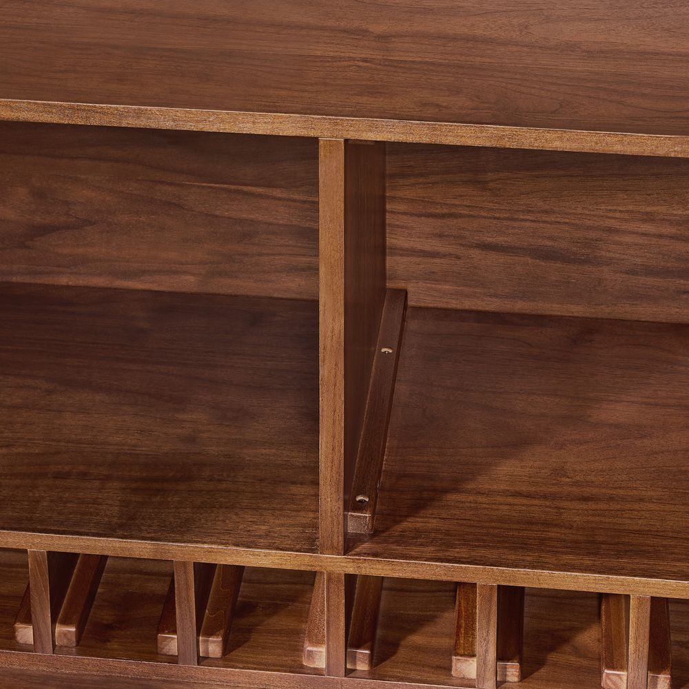 Crafted of American solid oak and engineered wood with walnut veneers.All wood is kiln-dried for added durability.Wood glazing adds visual interest with greater depth and layering and enhances coloring.Drawers are crafted with precision dovetail joints for superior sturdiness and weight-bearing strength.Solid wood blocks are used at structural joints for reinforcement.Built-in wine racks hold 8 bottles.Color perception may vary due to wood characteristics, lighting, and devices. Wood grain variation is expected, as each is unique.