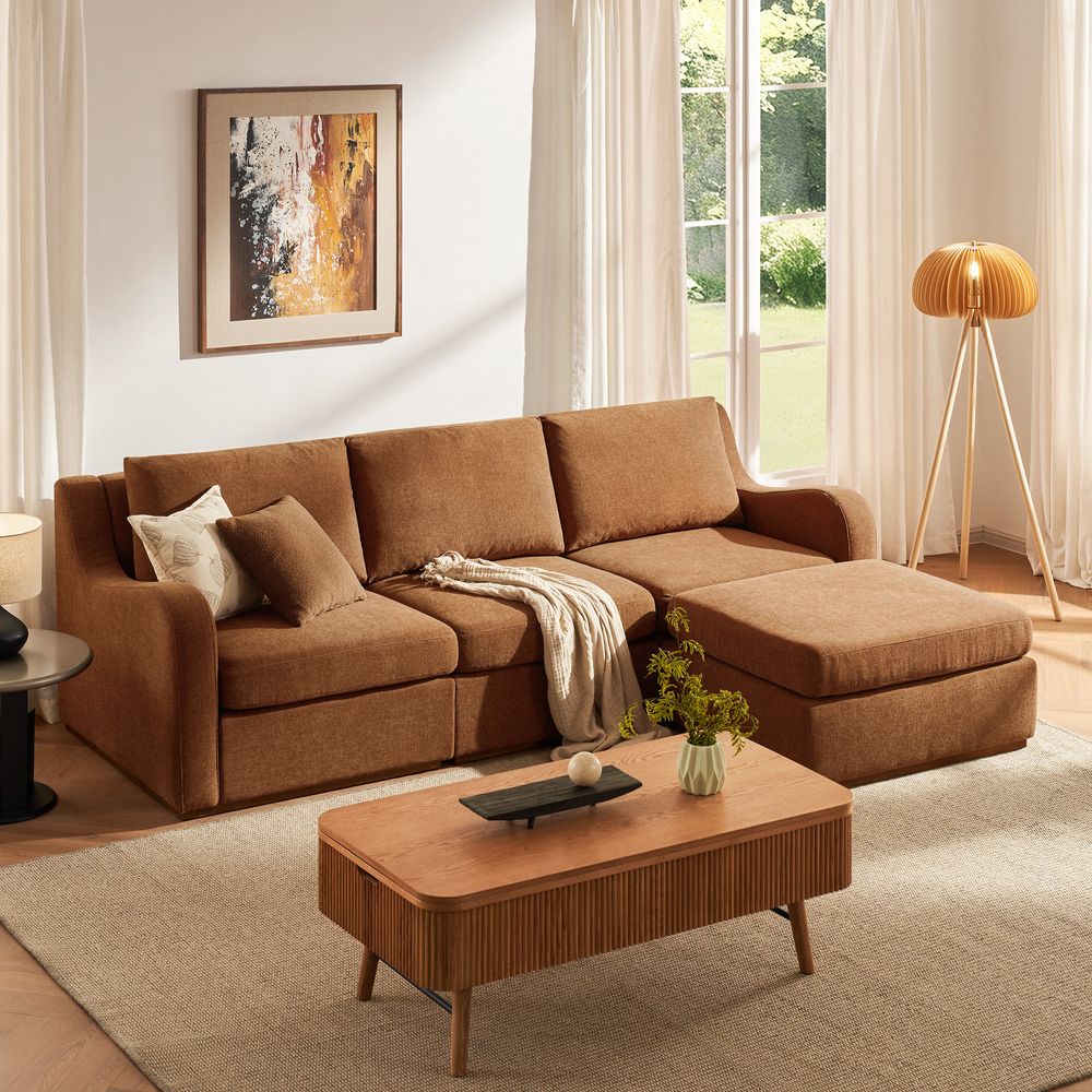 Inspired by mid-century modern design, Sunlit modular sectional sofa reimagines classic silhouettes for contemporary living. Its clean, structured lines, plush modular components, and warm wood base create a timeless yet versatile piece that effortlessly anchors any space while adapting to your lifestyle.