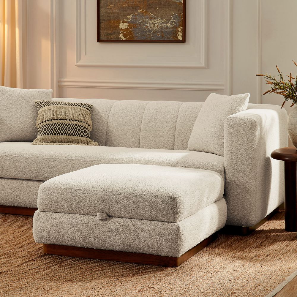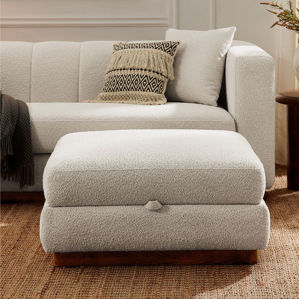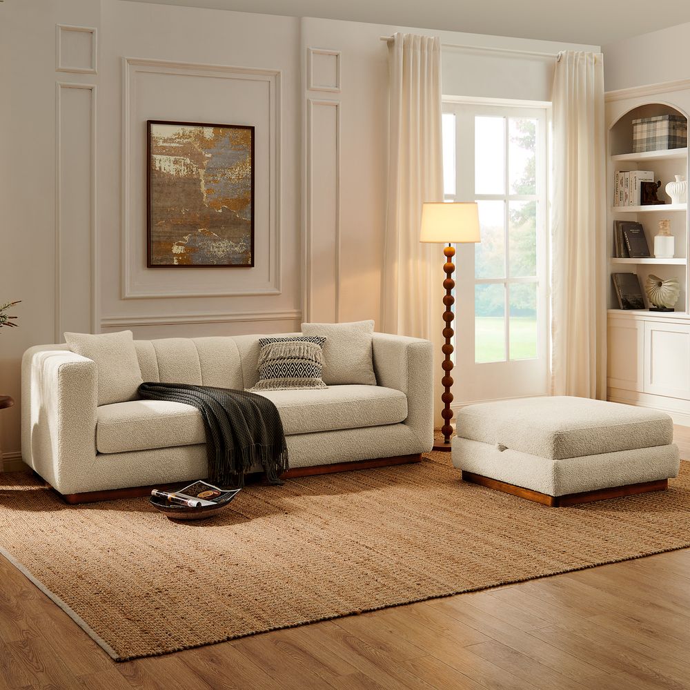 Solid wood and plywood frame.Bouclé fabric with spill-resistant and give it a super soft handfeel.Seat cushions have fiber-wrapped, high-resiliency polyurethane foam cores.Sinuous spring suspension with reinforced elastic webbing.The upholstery on the sofa adds soft padding for cozy, stylish seating surfaces.Cushion covers unzip to remove((only loveseat).90" sofa designed for 3-4 people's gathering, 2 throw pillows are included.Ottoman with interior storage easily stows books, throws or pillows.Items purchased at different times may not match due to different dye lots, also color perception can vary by lighting and devices.
