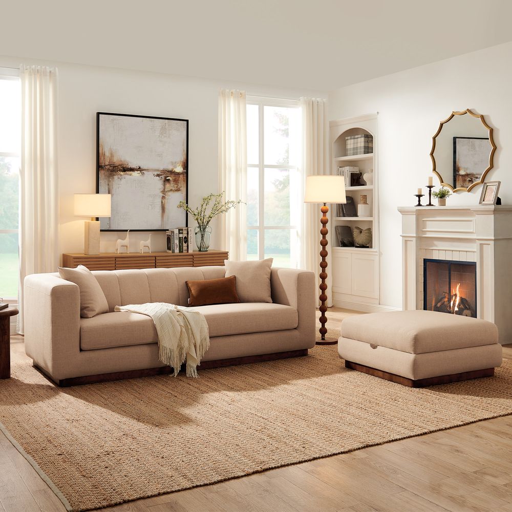Solid wood and plywood frame.This richly textured tight weave is inherently stain resistant and highly durable.Seat cushions have fiber-wrapped, high-resiliency polyurethane foam cores.Sinuous spring suspension with reinforced elastic webbing.The upholstery on the sofa adds soft padding for cozy, stylish seating surfaces.Cushion covers unzip to remove((only loveseat).90" sofa designed for 3-4 people's gathering, 2 throw pillows are included.Ottoman with interior storage easily stows books, throws or pillows.Items purchased at different times may not match due to different dye lots, also color perception can vary by lighting and devices.