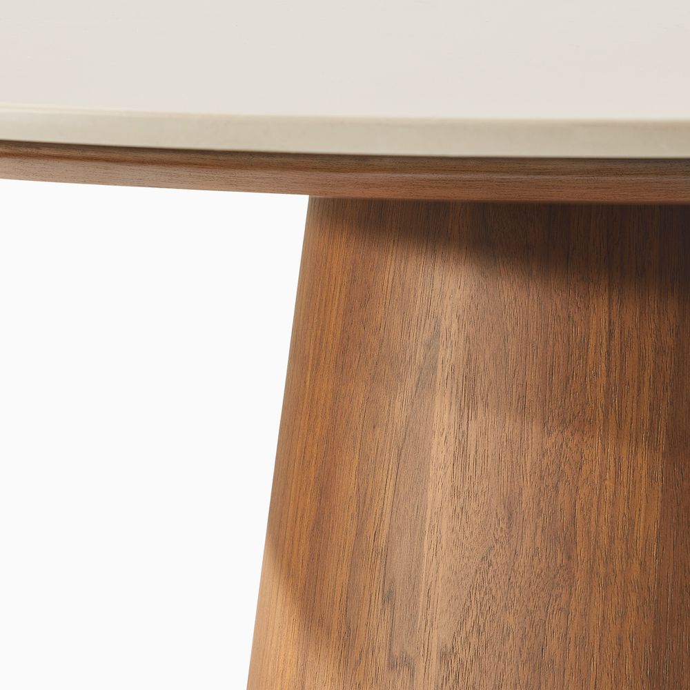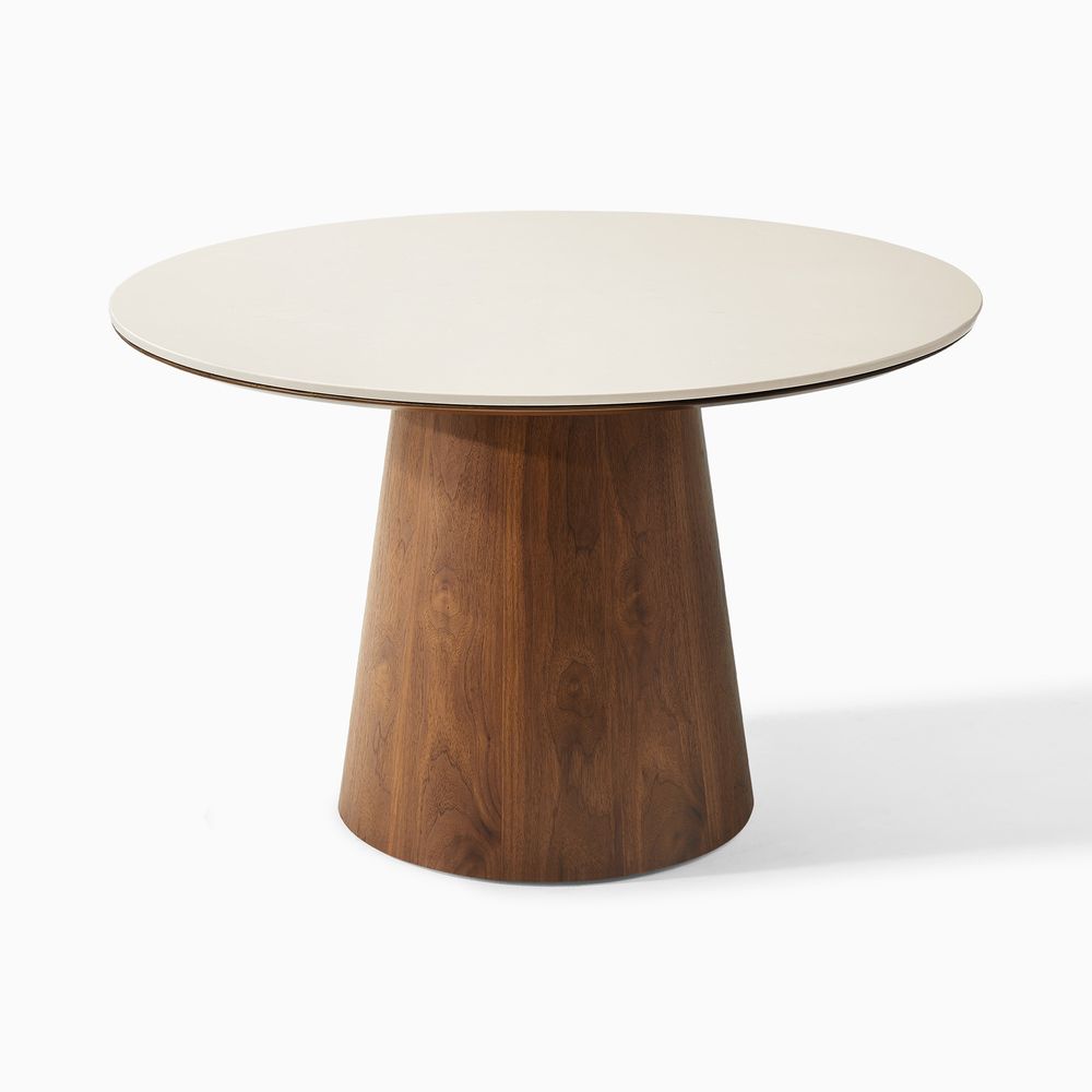 Crafted of engineered stone and plywood with American walnut veneer.Tabletop is honed and sealed for a satin finish with deep veining and natural color contrasts.Wood glazing adds visual interest with greater depth and layering and enhances coloring.Striking conical base offers foundational support.47" table comfortably seats 4.Color perception may vary due to wood characteristics, lighting, and devices. Wood grain variation is expected, as each is unique.Variation in the veining of stone is to be expected, as each piece will be unique.