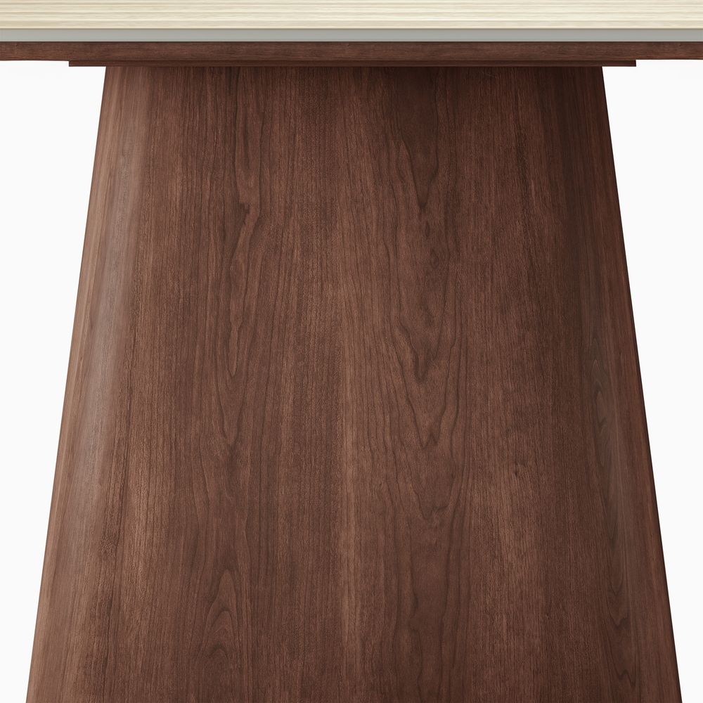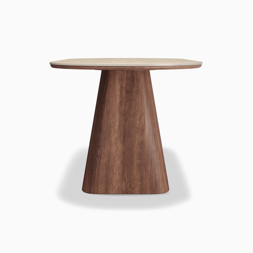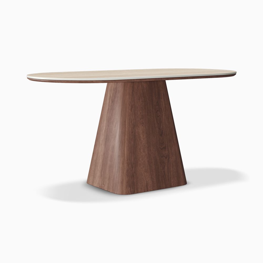 Crafted of sintered stone and plywood with American walnut veneer.Striking trapezoidal base offers foundational support.63" table comfortably seats 4.Color perception may vary due to wood characteristics, lighting, and devices. Wood grain variation is expected, as each is unique.Variation in the veining of stone is to be expected, as each piece will be unique.