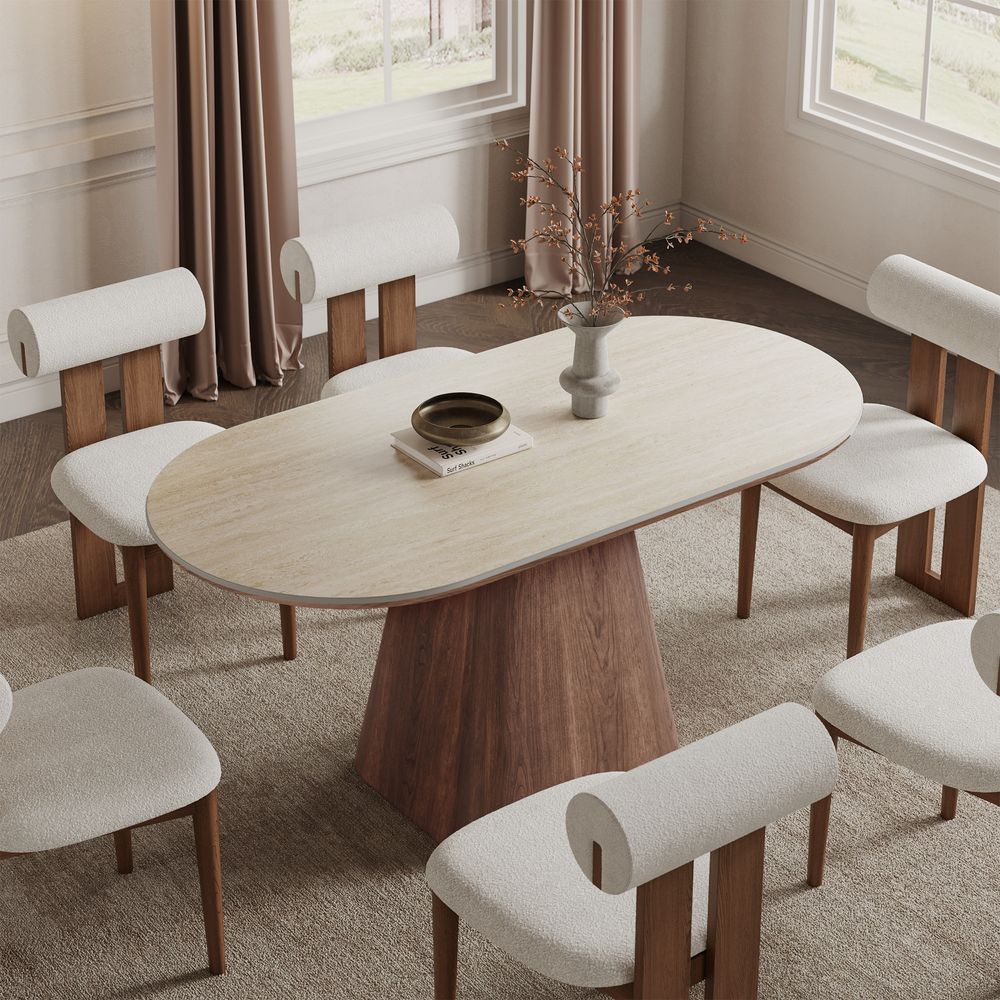 Meet the Thorsten Dining Table: where a modern silhouette wraps around timeless natural warmth, bringing tactile charm to every meal. Its smooth, sintered stone tabletop elevates your space with a luxurious feel. Complementing this refined surface is a uniquely wooden base crafted from rich finishes: a warm, organic touch that adds unshakable stability, forging a harmonious blend of contemporary sleekness and natural, inviting charm.