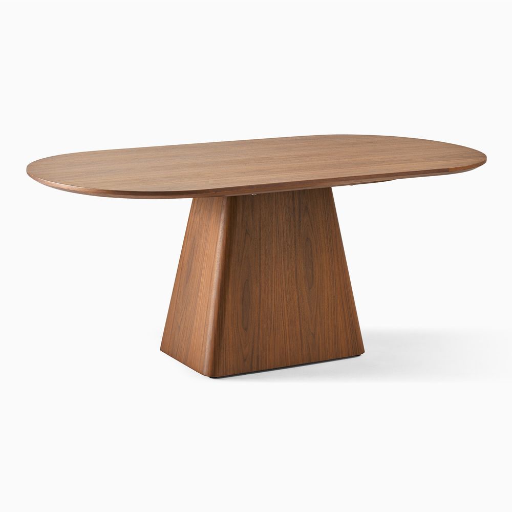 Crafted of plywood with American oak veneer.Wood glazing adds visual interest with greater depth and layering and enhances coloring.Striking trapezoidal base offers foundational support.72" table comfortably seats 4-6.Color perception may vary due to wood characteristics, lighting, and devices. Wood grain variation is expected, as each is unique.Variation in the veining of stone is to be expected, as each piece will be unique.
