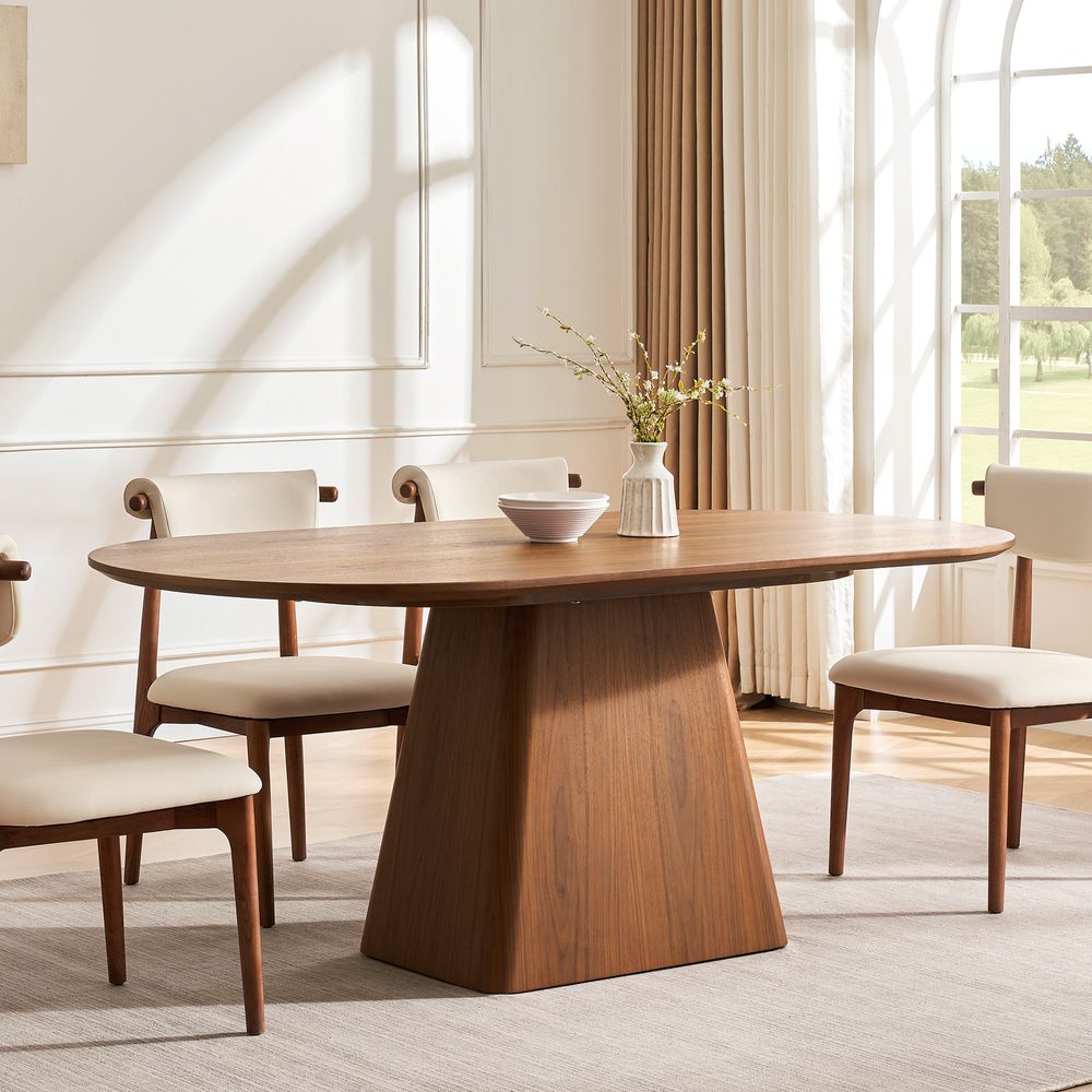 Meet the Thorsten Dining Table: where a modern silhouette wraps around timeless natural warmth, bringing tactile charm to every meal. Tabletop features rounded edges, keeping the look sleek and approachable. Complementing this refined surface is a uniquely wooden base crafted from rich finishes: a warm, organic touch that adds unshakable stability, forging a harmonious blend of contemporary sleekness and natural, inviting charm.