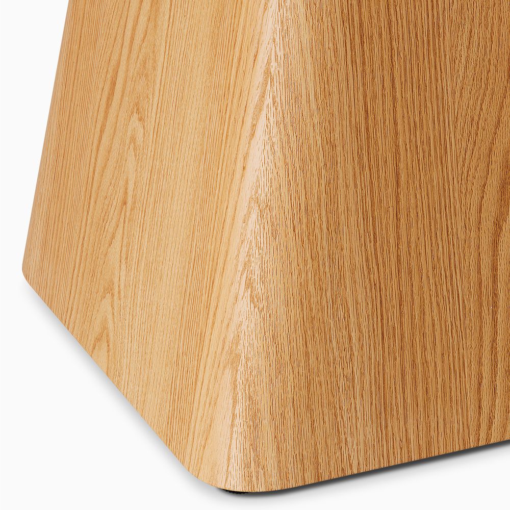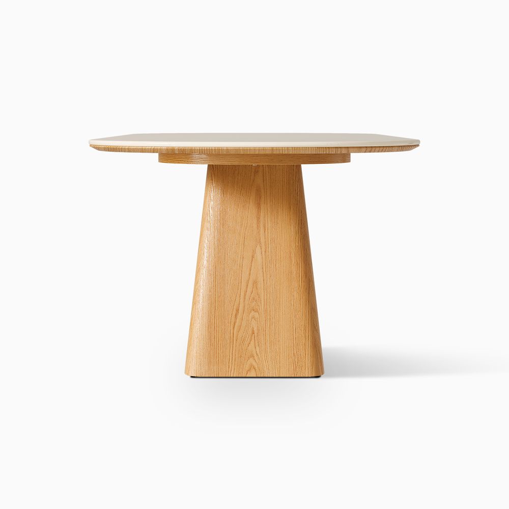 Crafted of engineered stone and plywood with American oak veneer.Tabletop is honed and sealed for a satin finish with deep veining and natural color contrasts.Wood glazing adds visual interest with greater depth and layering and enhances coloring.Striking trapezoidal base offers foundational support.84" table comfortably seats 6-8.Color perception may vary due to wood characteristics, lighting, and devices. Wood grain variation is expected, as each is unique.Variation in the veining of stone is to be expected, as each piece will be unique.