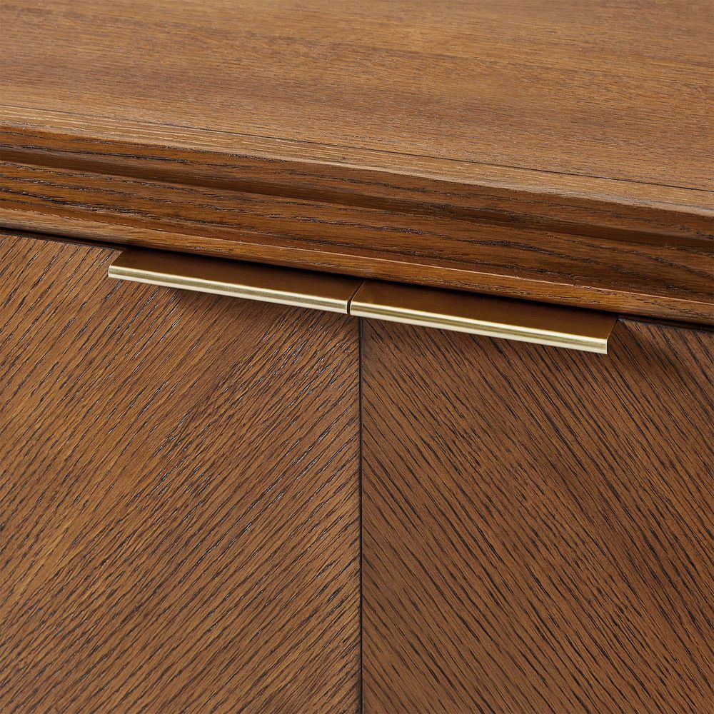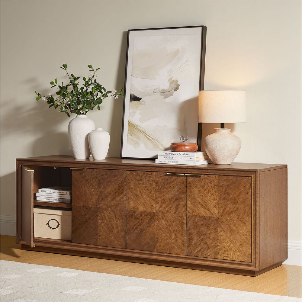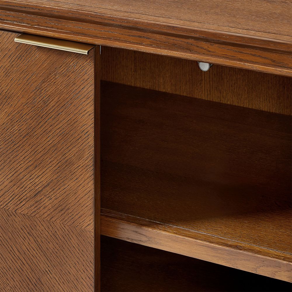 Crafted of American solid oak and engineered wood with oak veneers.All wood is kiln-dried for added durability.Finish is achieved through multistep process in which wood is wire brushed to highlight its rich grain.Wood glazing adds visual interest with greater depth and layering and enhances coloring.Solid wood blocks are used at structural joints for reinforcement.Media Console is designed for TVs up to 75", 4 cord cutouts in back panel for cable management.Cabinet is designed with 3 fixed shelves and 1 adjustable shelves.Anti-tip kit hardware (included) is highly recommended to provide protection against tipping of furniture.Color perception may vary due to wood characteristics, lighting, and devices. Wood grain variation is expected, as each is unique.