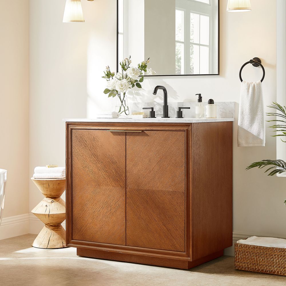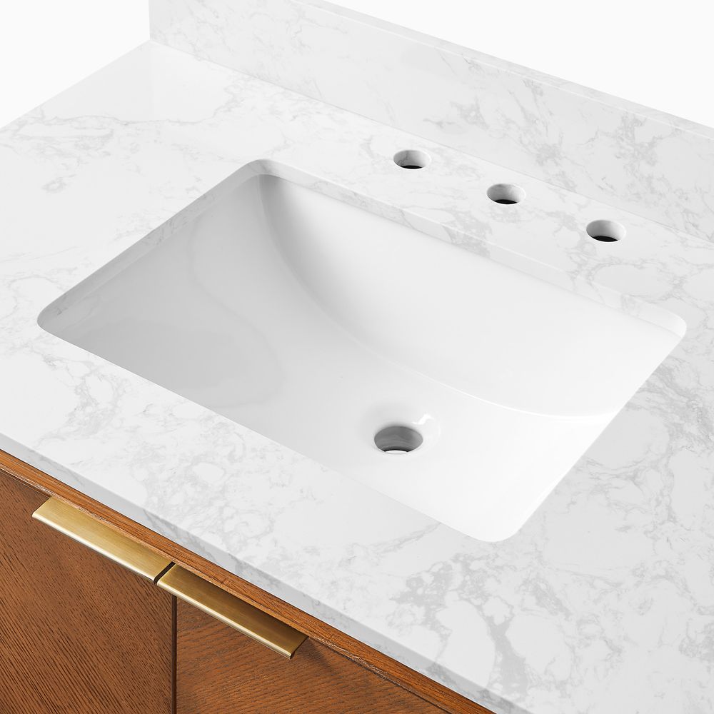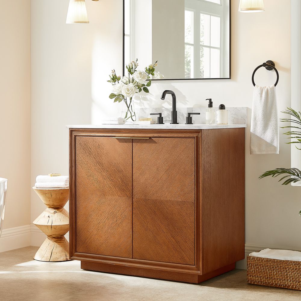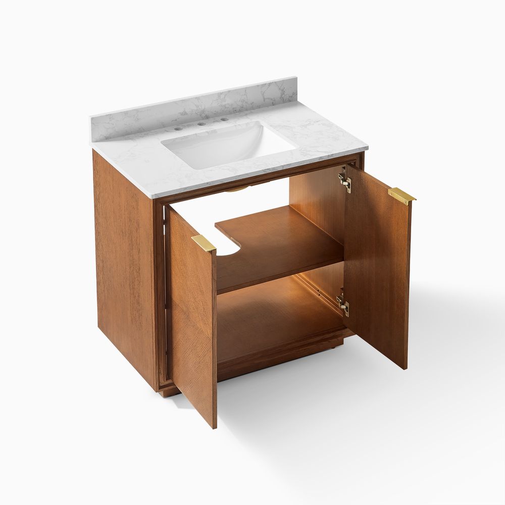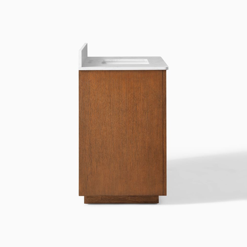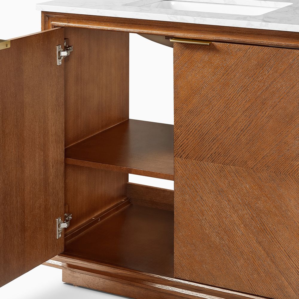Crafted of engineered stone, solid wood, and plywood with American oak veneers.Countertop and backsplash are honed and sealed for a satin finish with deep veining and natural color contrasts.All wood is kiln-dried for added durability.Finish is achieved through multistep process in which wood is wire brushed to highlight its rich grain.Wood glazing adds visual interest with greater depth and layering and enhances coloring.Solid wood blocks are used at structural joints for reinforcement.Color perception may vary due to wood characteristics, lighting, and devices. Wood grain variation is expected, as each is unique.Variation in the veining of stone is to be expected, as each piece will be unique.