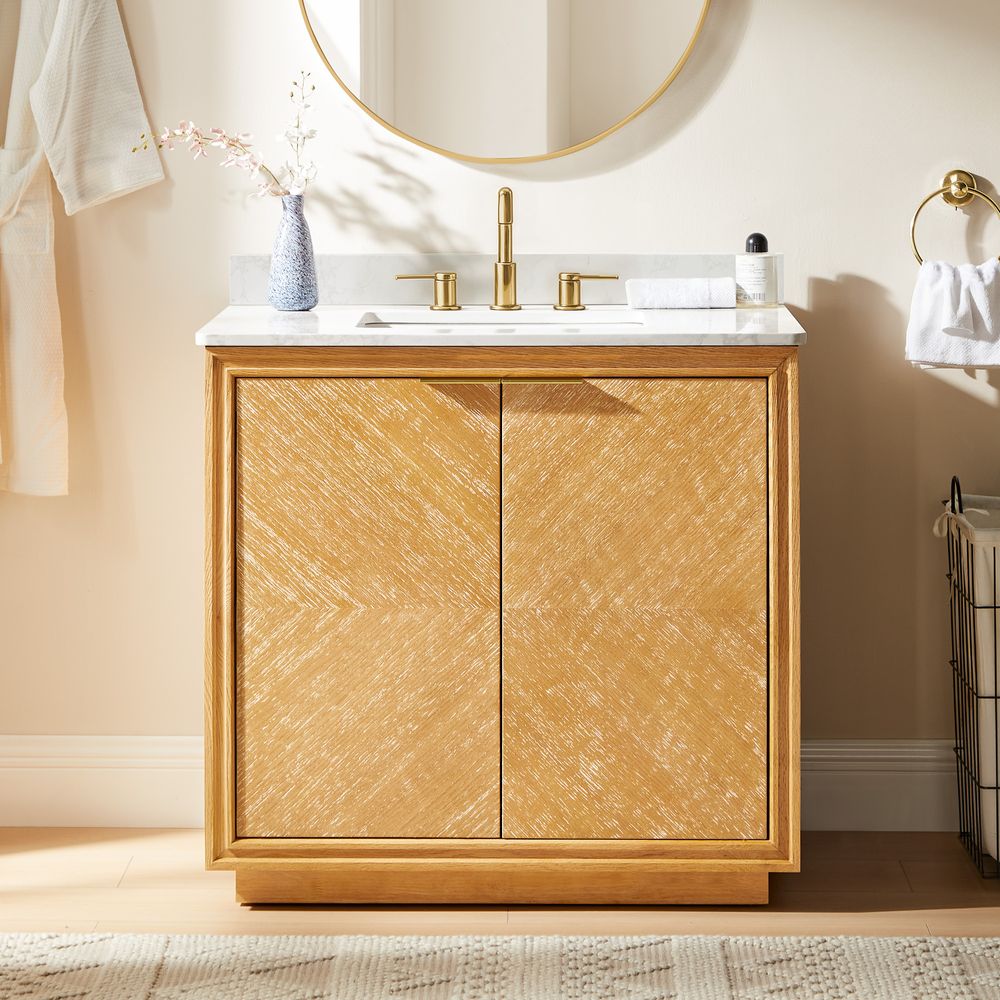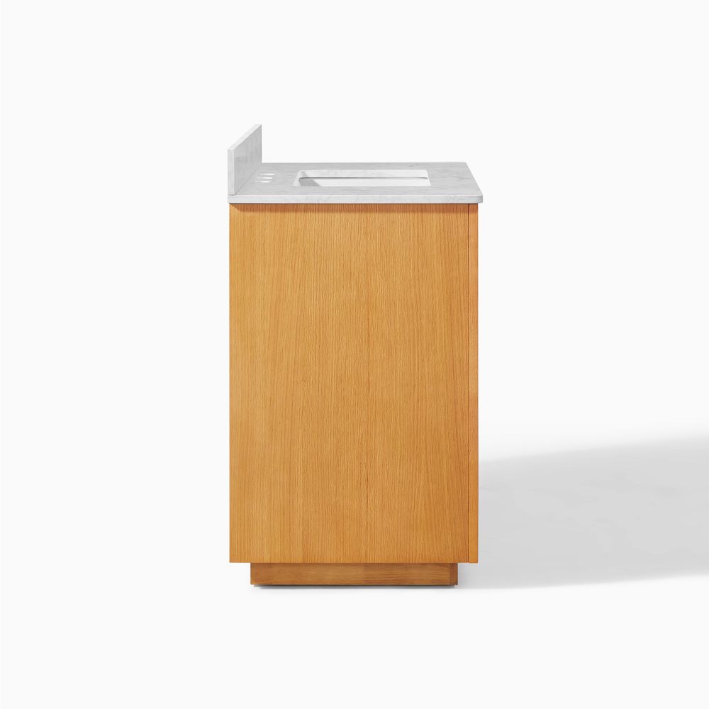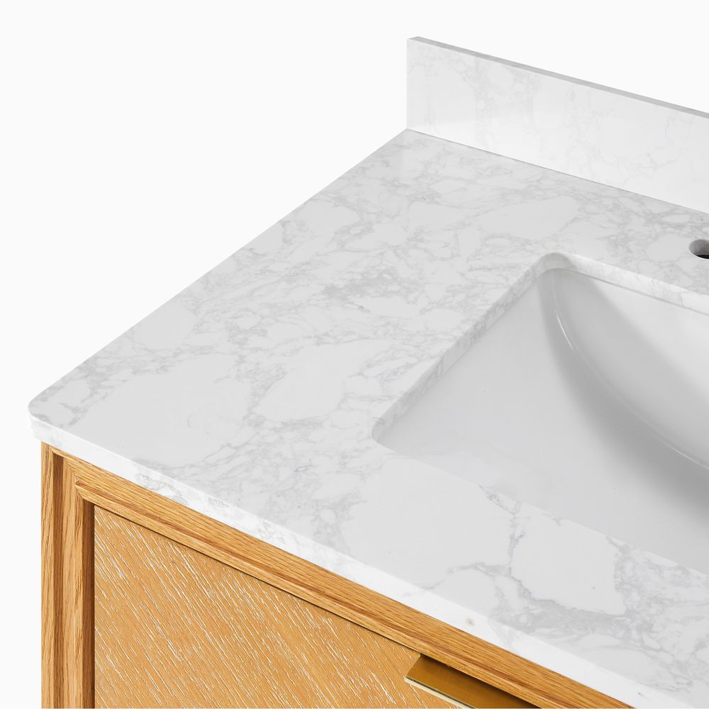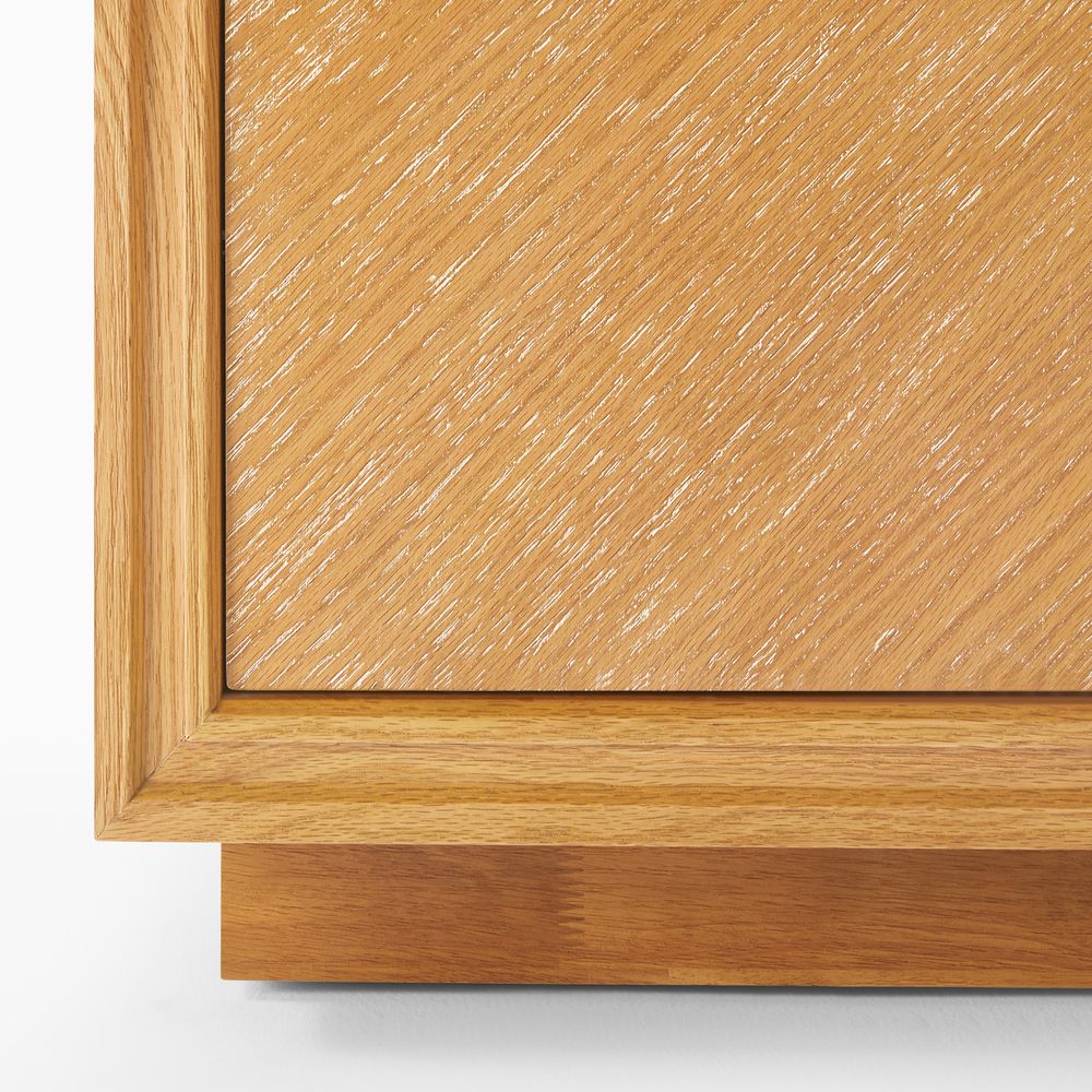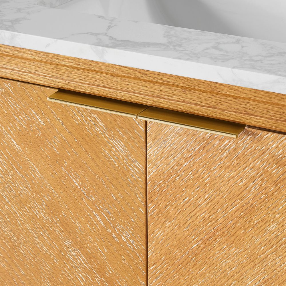 Crafted of engineered stone, solid wood, and plywood with American oak veneers.Countertop and backsplash are honed and sealed for a satin finish with deep veining and natural color contrasts.All wood is kiln-dried for added durability.Finish is achieved through multistep process in which wood is wire brushed to highlight its rich grain.Wood glazing adds visual interest with greater depth and layering and enhances coloring.Solid wood blocks are used at structural joints for reinforcement.Color perception may vary due to wood characteristics, lighting, and devices. Wood grain variation is expected, as each is unique.Variation in the veining of stone is to be expected, as each piece will be unique.