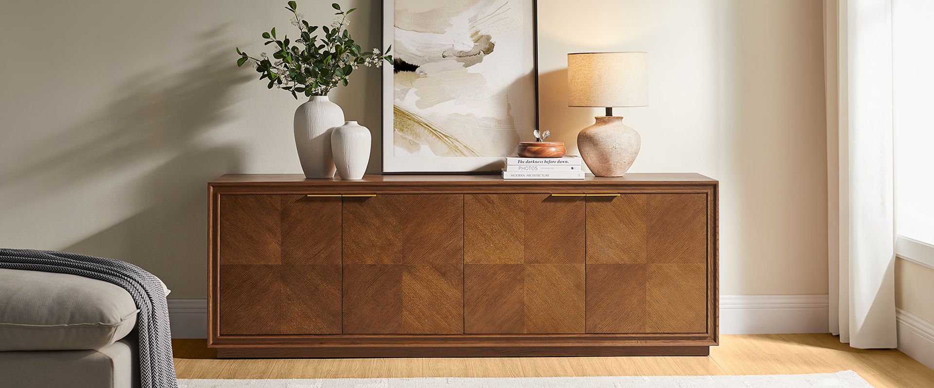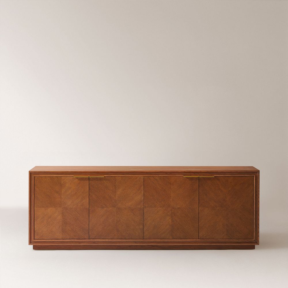 Thursen collection showcases the intricate parquet pattern, blending classic craftsmanship with modern design. Each piece reflects sophistication, with geometric wooden grids creating a striking visual harmony.