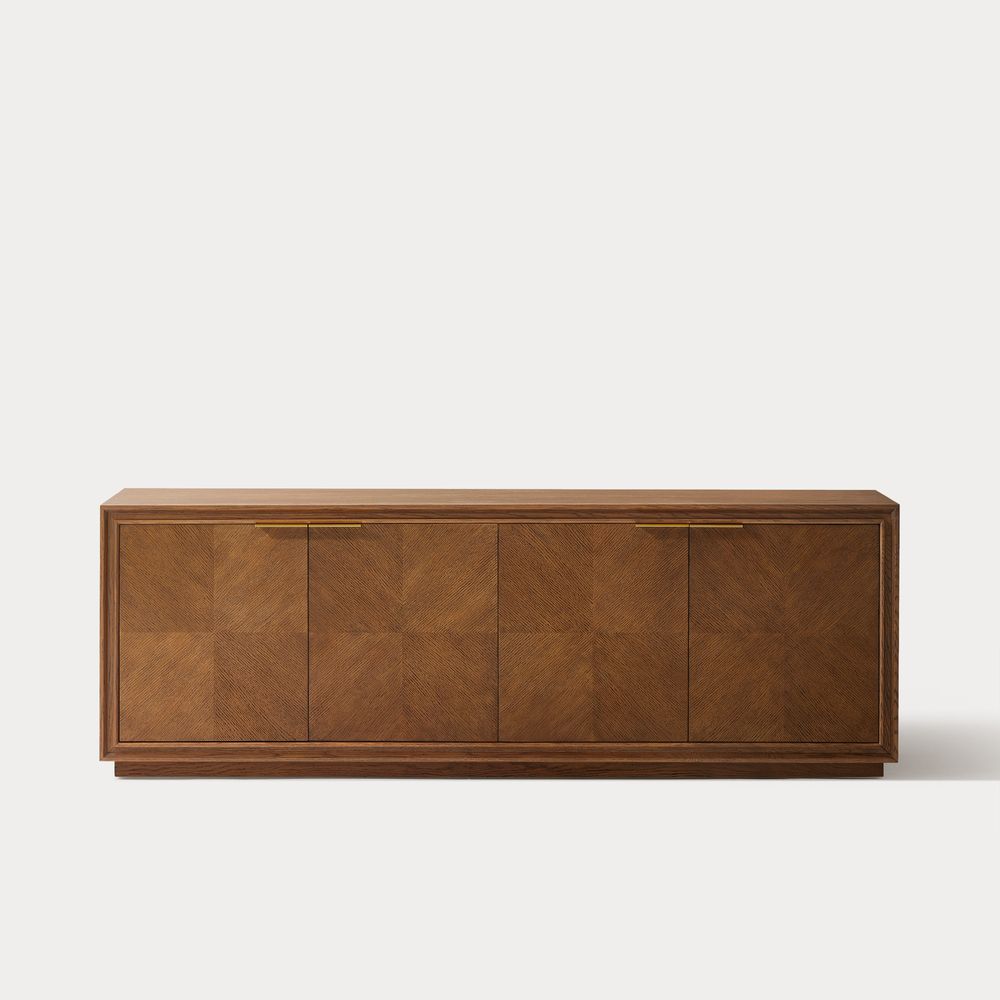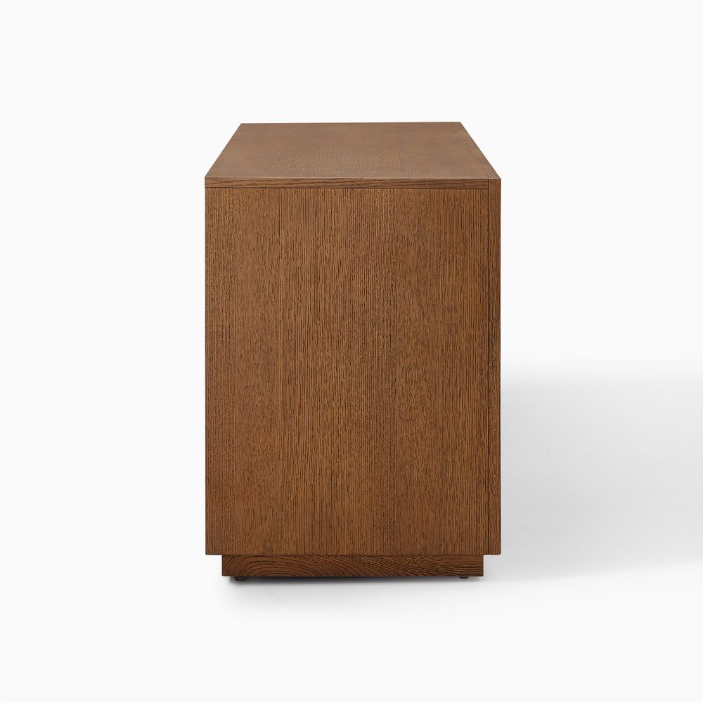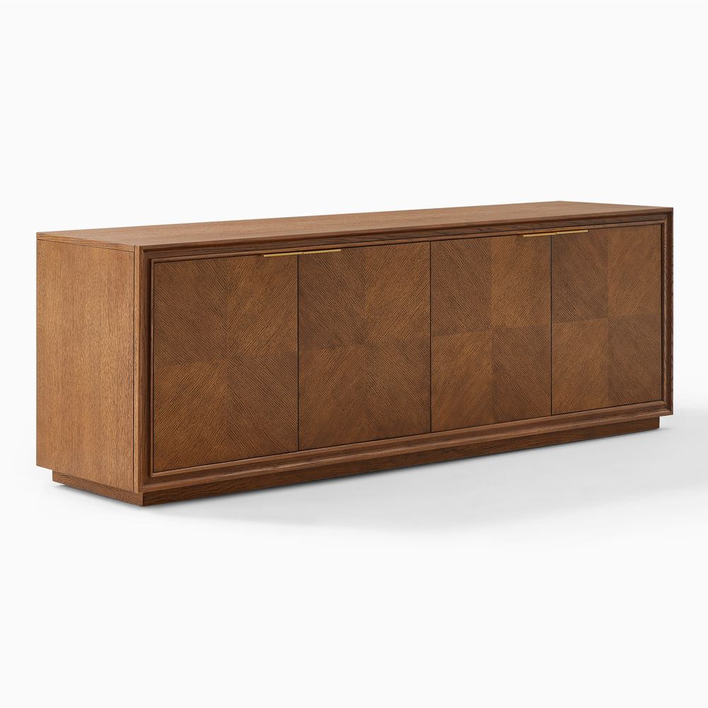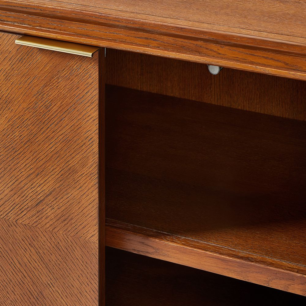 Crafted of American solid oak and engineered wood with oak veneers.All wood is kiln-dried for added durability.Finish is achieved through multistep process in which wood is wire brushed to highlight its rich grain.Wood glazing adds visual interest with greater depth and layering and enhances coloring.Solid wood blocks are used at structural joints for reinforcement.Designed for TVs up to 75", 4 cord cutouts in back panel for cable management.Color perception may vary due to wood characteristics, lighting, and devices. Wood grain variation is expected, as each is unique.