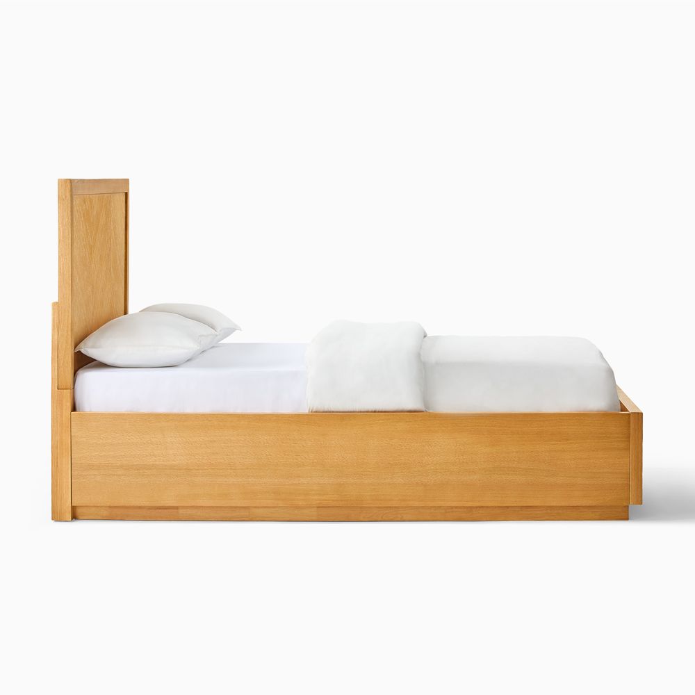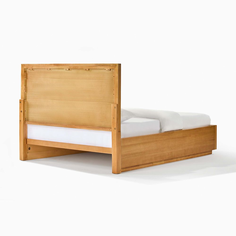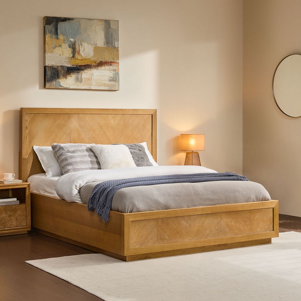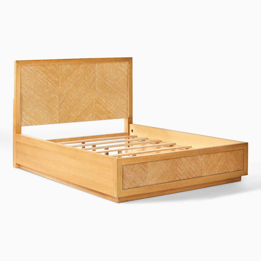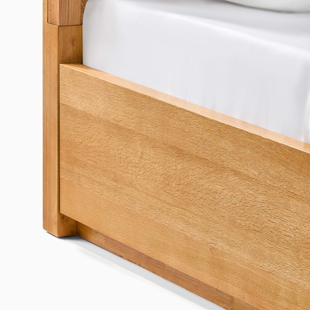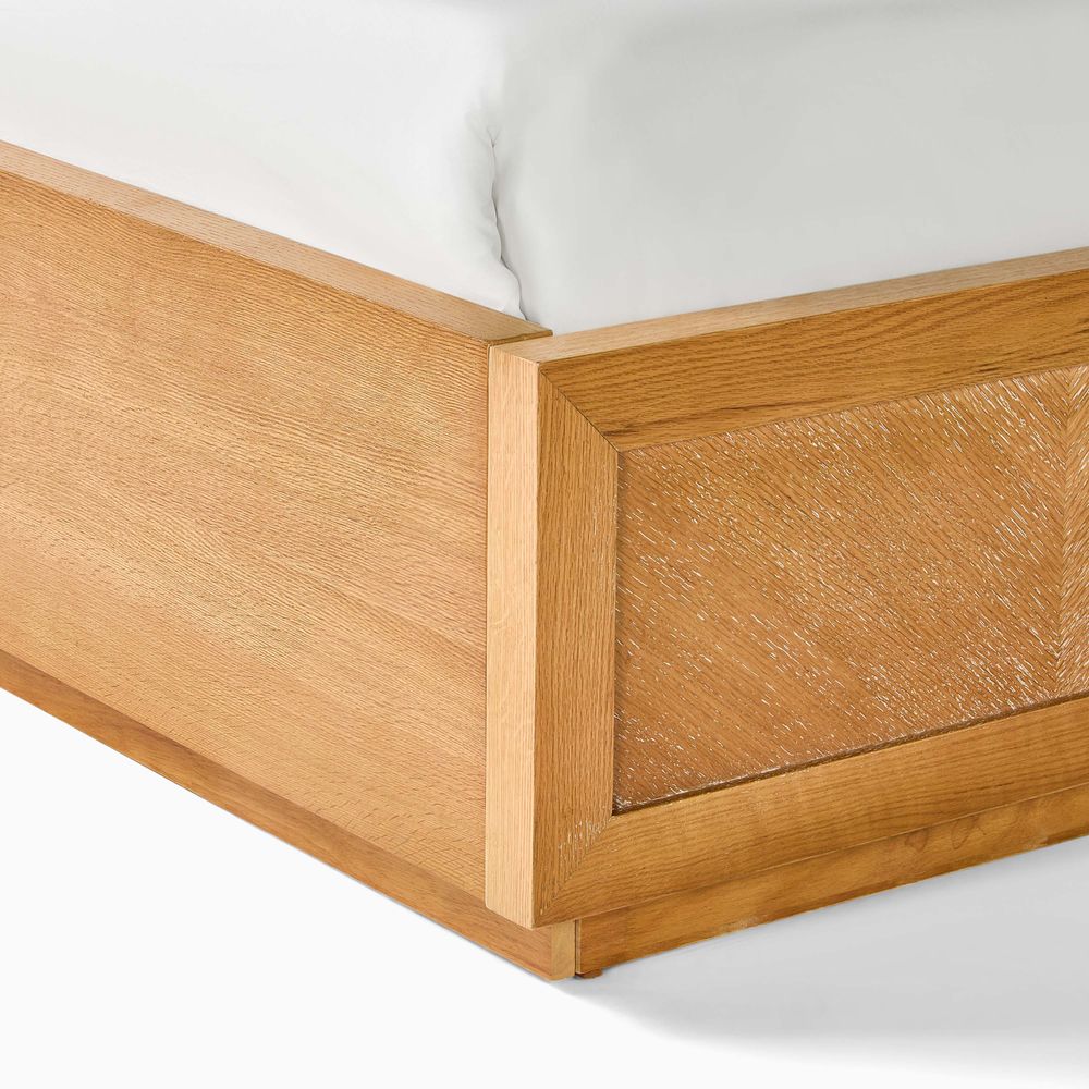 Crafted of American solid oak and engineered wood with oak veneers.All wood is kiln-dried for added durability.Finish is achieved through multistep process in which wood is wire brushed to highlight its rich grain.Wood glazing adds visual interest with greater depth and layering and enhances coloring.Create a worn, vintage look with a subtle dusty wash.Include 6 middle support legs.Bed accommodates most standard mattresses, box spring optional, supporting up to 800 lbs.Color perception may vary due to wood characteristics, lighting, and devices. Wood grain variation is expected, as each is unique.